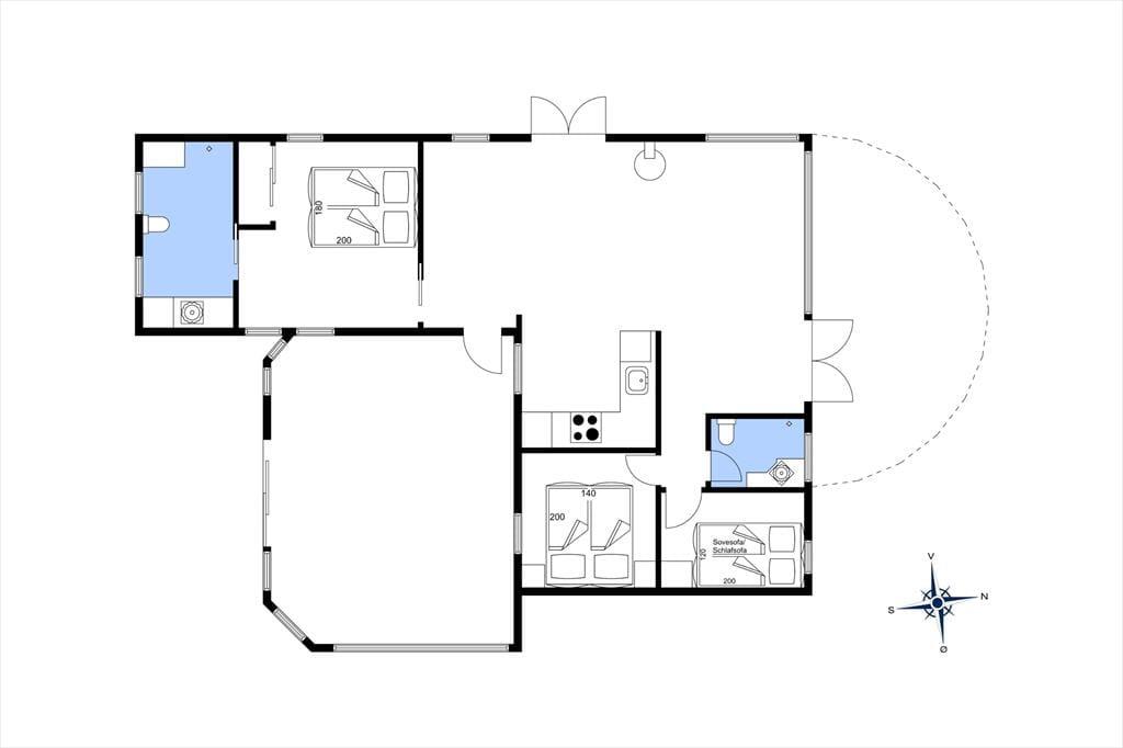 Huset har to badeværelser med bruseniche, hvoraf det ene er udstyret med vaskemaskine. Der er tre soveværelser: to med dobbeltsenge og et med en 1½-mands sovesofa (120x200). Opvarmning sker via varmepumpe, elvarme og pillebrændeovn.