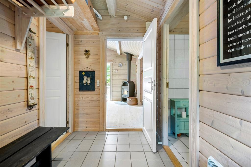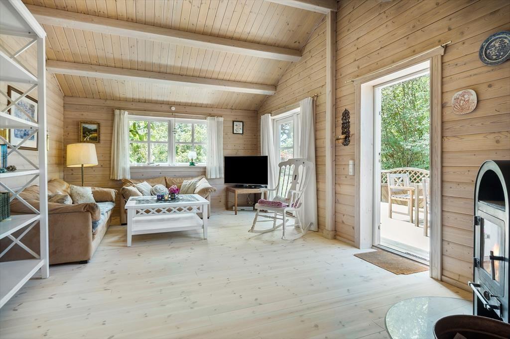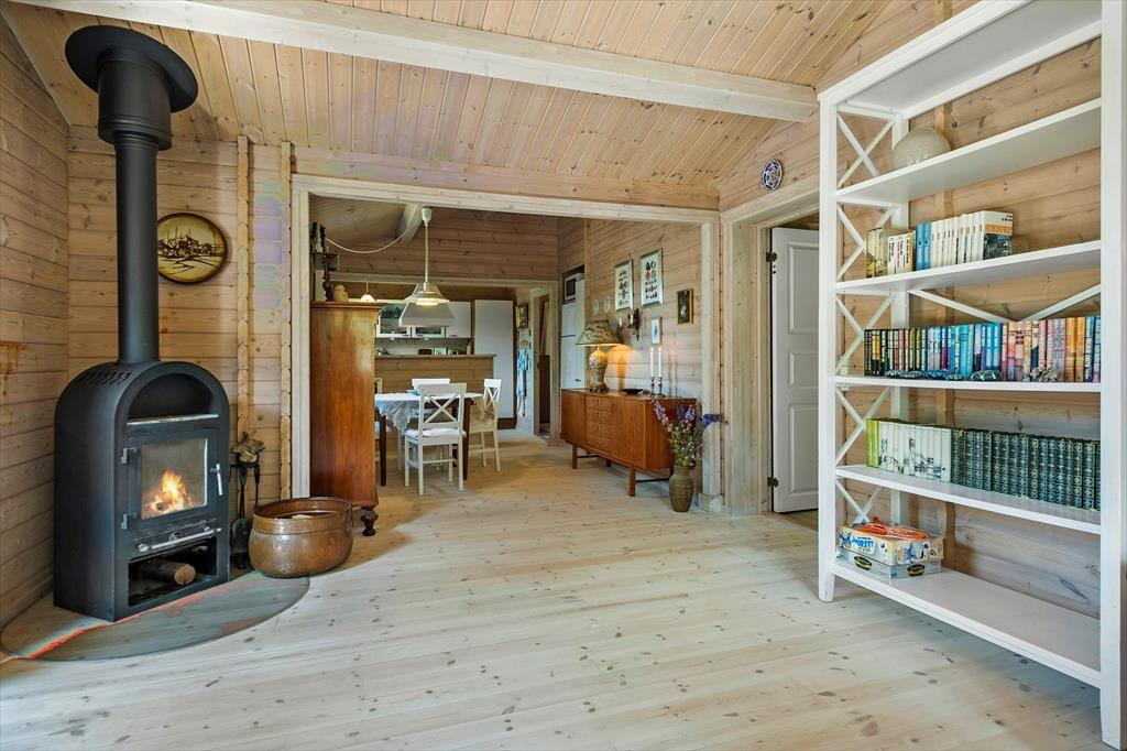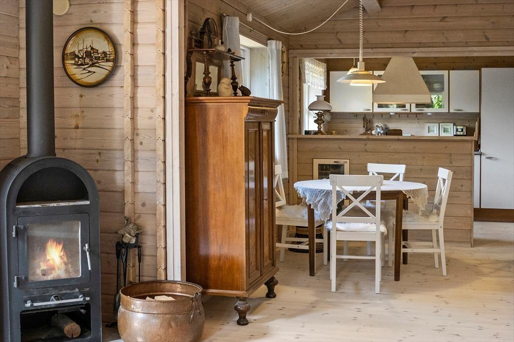 Velkommen indenfor: Indendørs finder du et lyst og åbent køkken, der i kombination med den rummelige spise- og opholdsstue er perfekt til fælles hygge. Huset rummer to komfortable soveværelser samt et dejligt badeværelse med brus og vaskemaskine. Sommerhusets indretning er meget indbydende med en hyggelig indretning, hvilket skaber en dejlig rolig og afslappende atmosfære. Tænd gerne op i brændeovnen på de køligere dage, og lad feriehyggen brede sig.