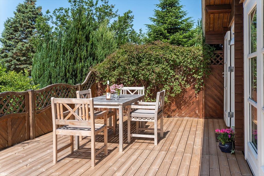 Nyd livet udenfor: Nyd morgenkaffen på den dejlige terrasse med fint havkig. Gå en tur i den skønne have, hvor du kan grille og tænde op i den hyggelige havepejs. Læs en god bog på terrassen fra udvalget i stuens bogreol og lad roen sænke sig. Der er desuden kort gå afstand til stranden via en sti, og her kan du tage en frisk dukkert fra badebroen.