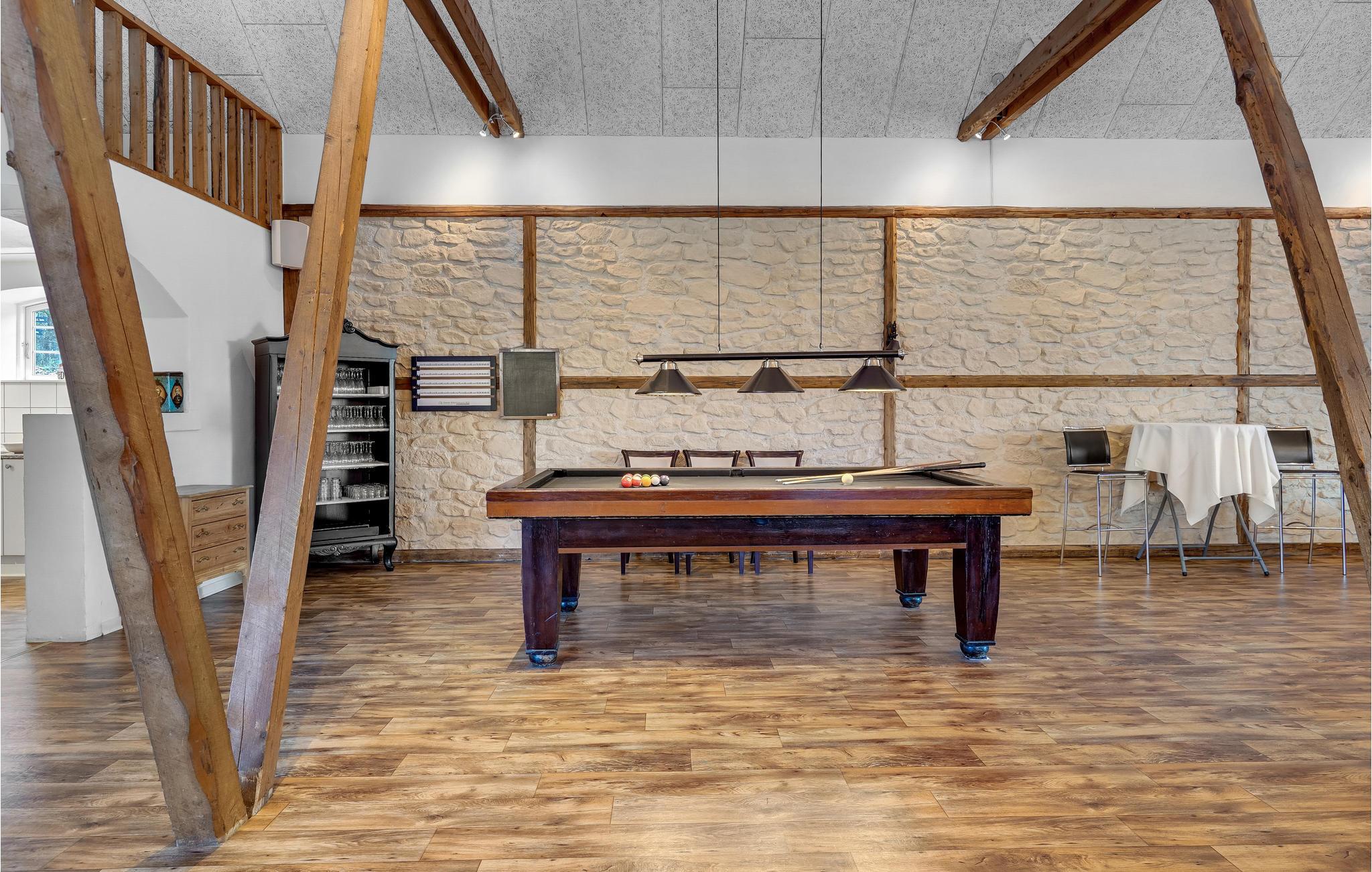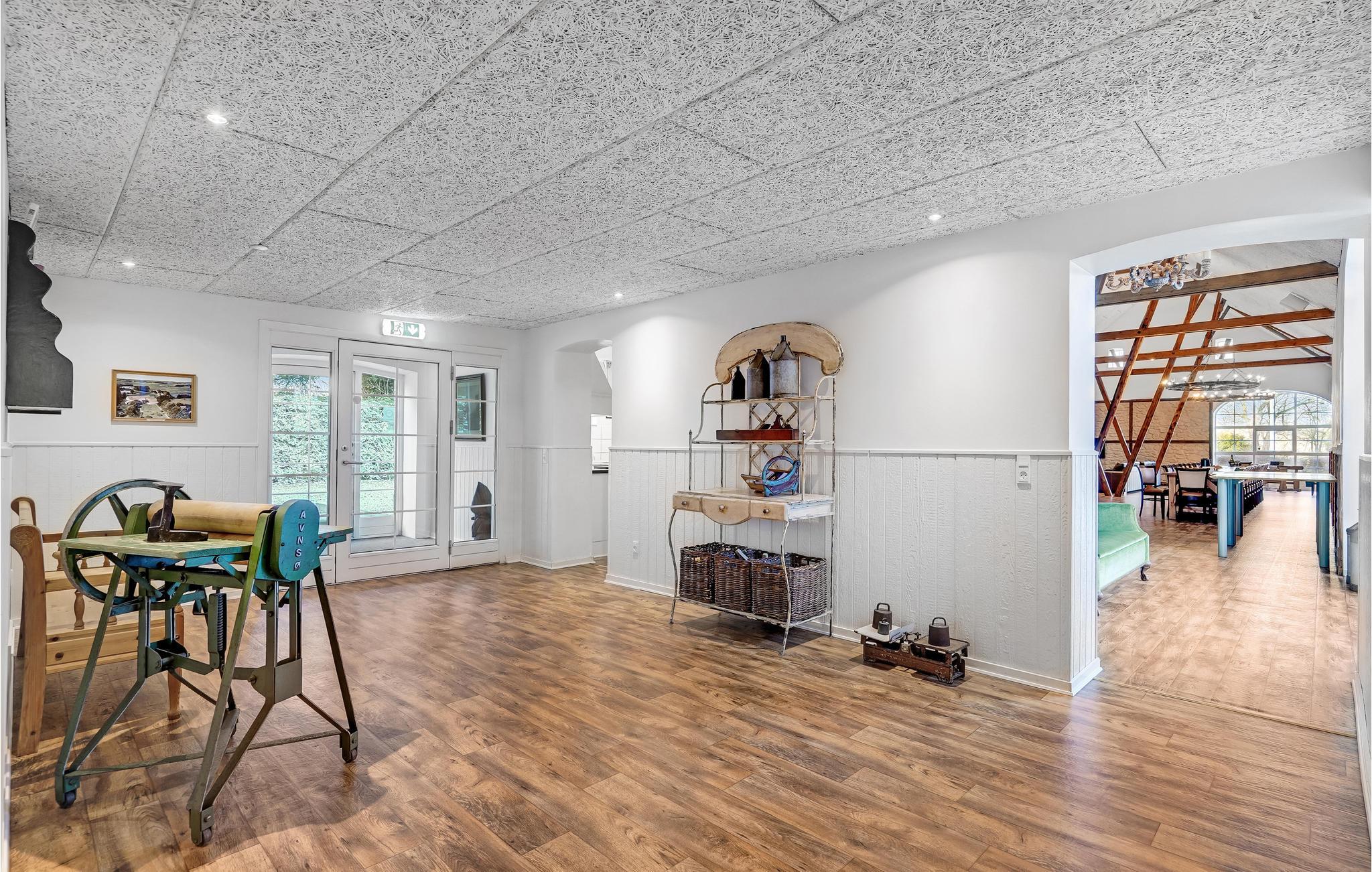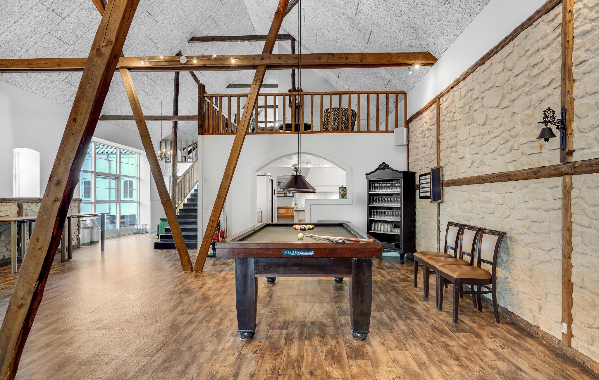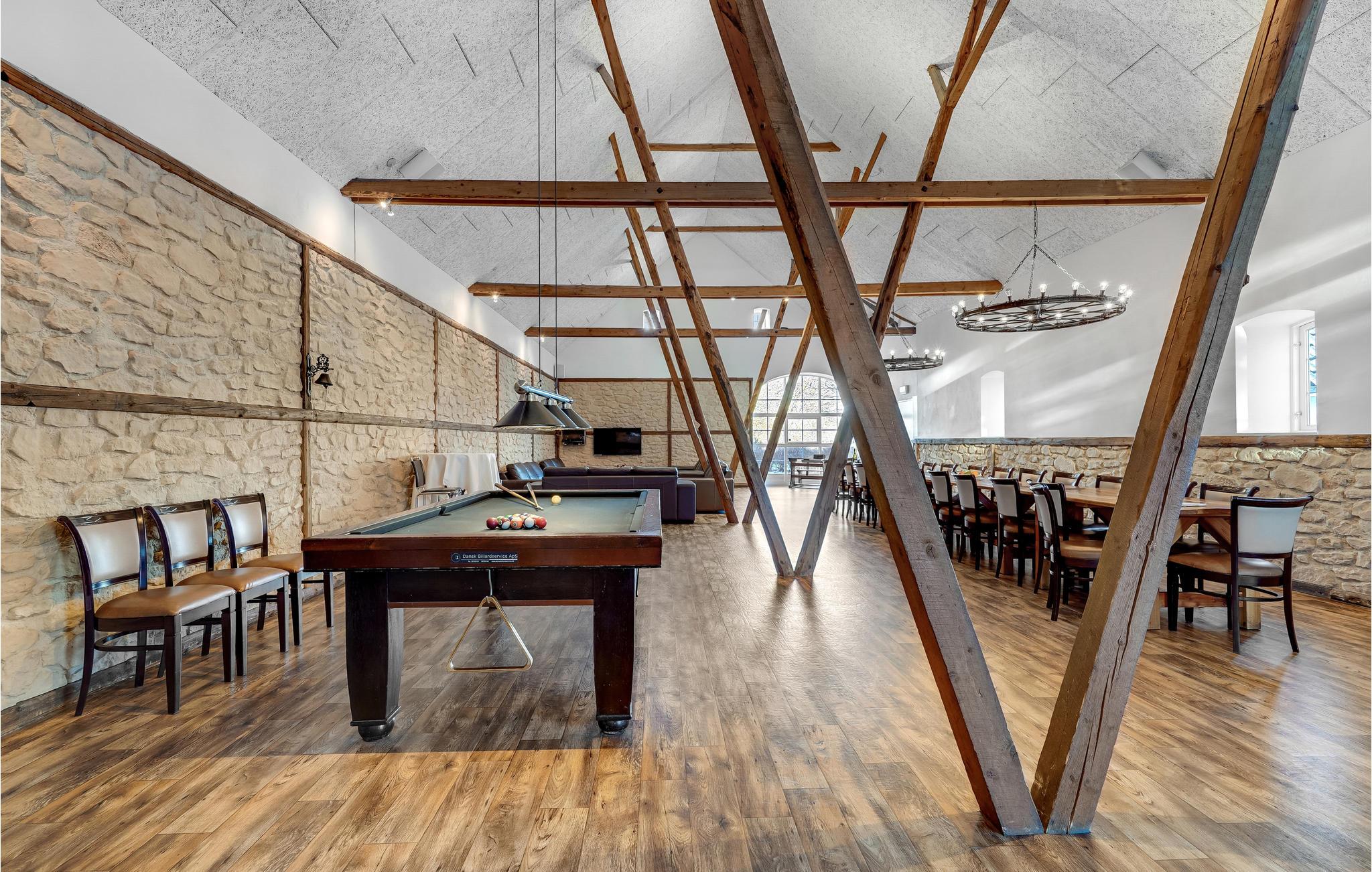 Den store lade på 200 m2 er indrettet som opholdsrum med et langbord til alle husets gæster. Her findes også flere sofagrupper, et billardbord og en 50" fladskærm. Køkkenet er indrettet i det gamle roekammer, og er fuldt professionelt udstyret med 8 kogeplader, 2 ovne, 2 køleskabe, 1 fryseskab samt 2 opvaskemaskiner mm. Staldbygningerne er indrettet med dobbeltværelser, badeværelser og sofaområde med panoramavindue. Endvidere er der et grovkøkken med vaskemaskine og tørretumbler.