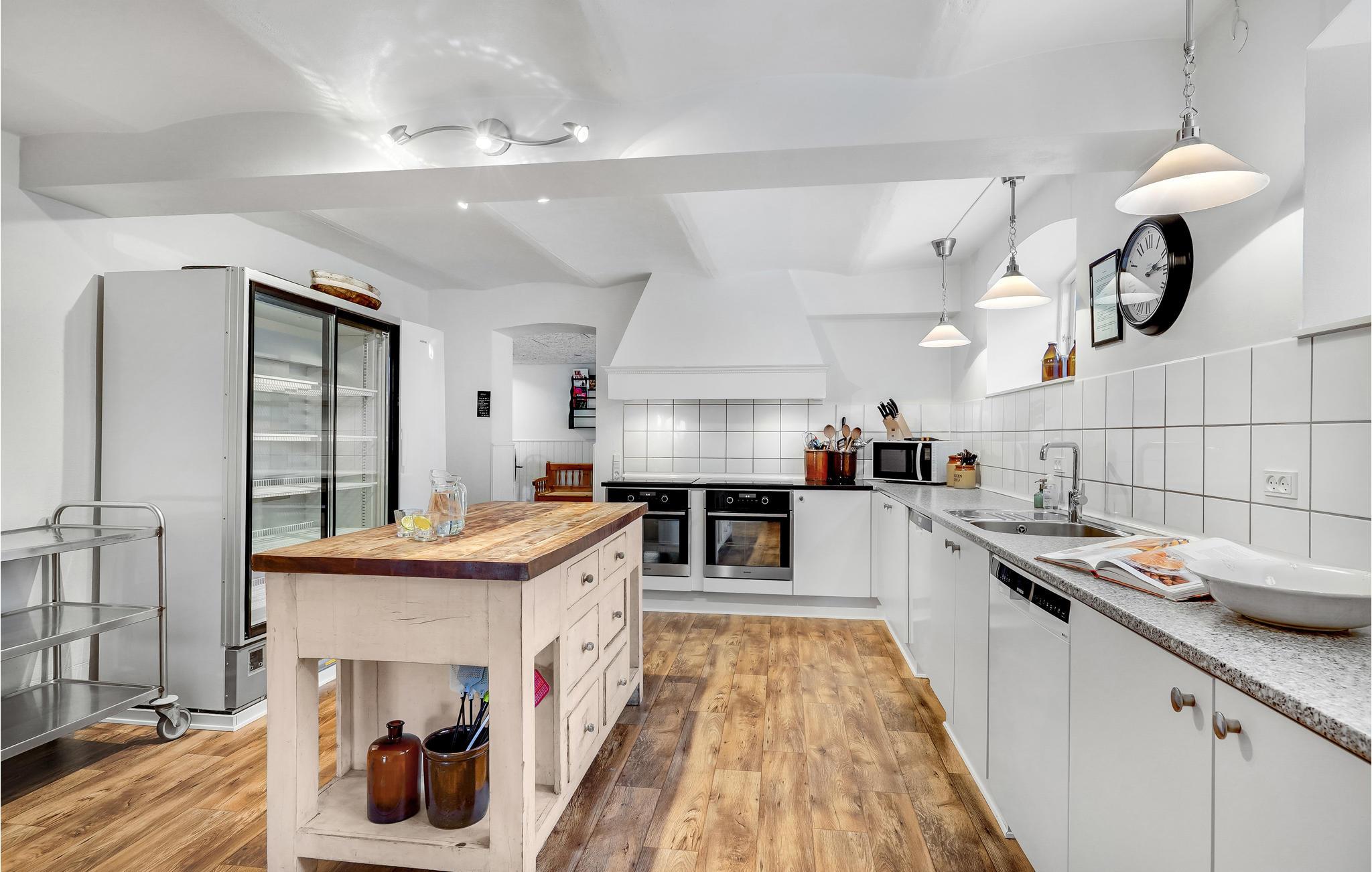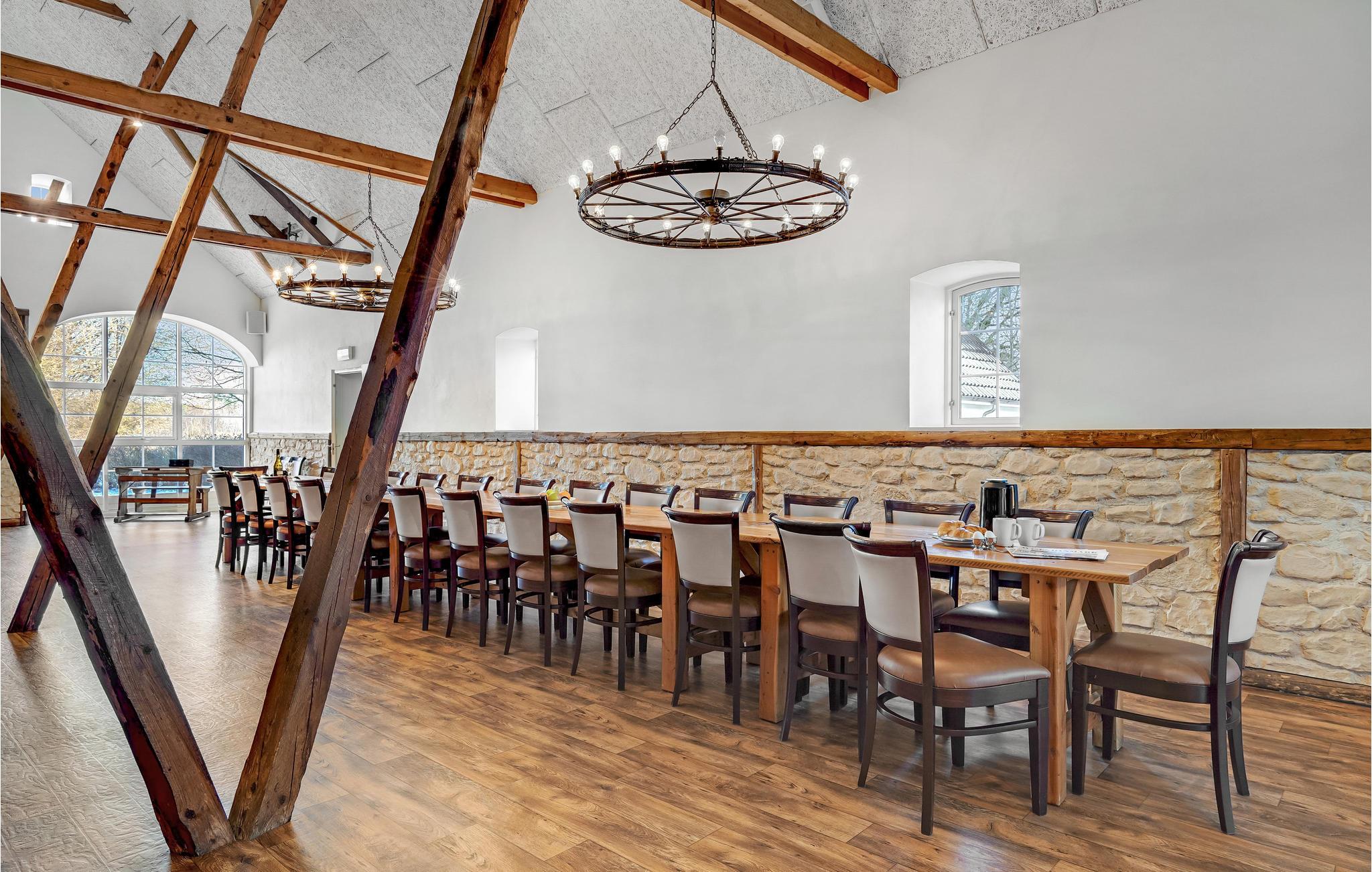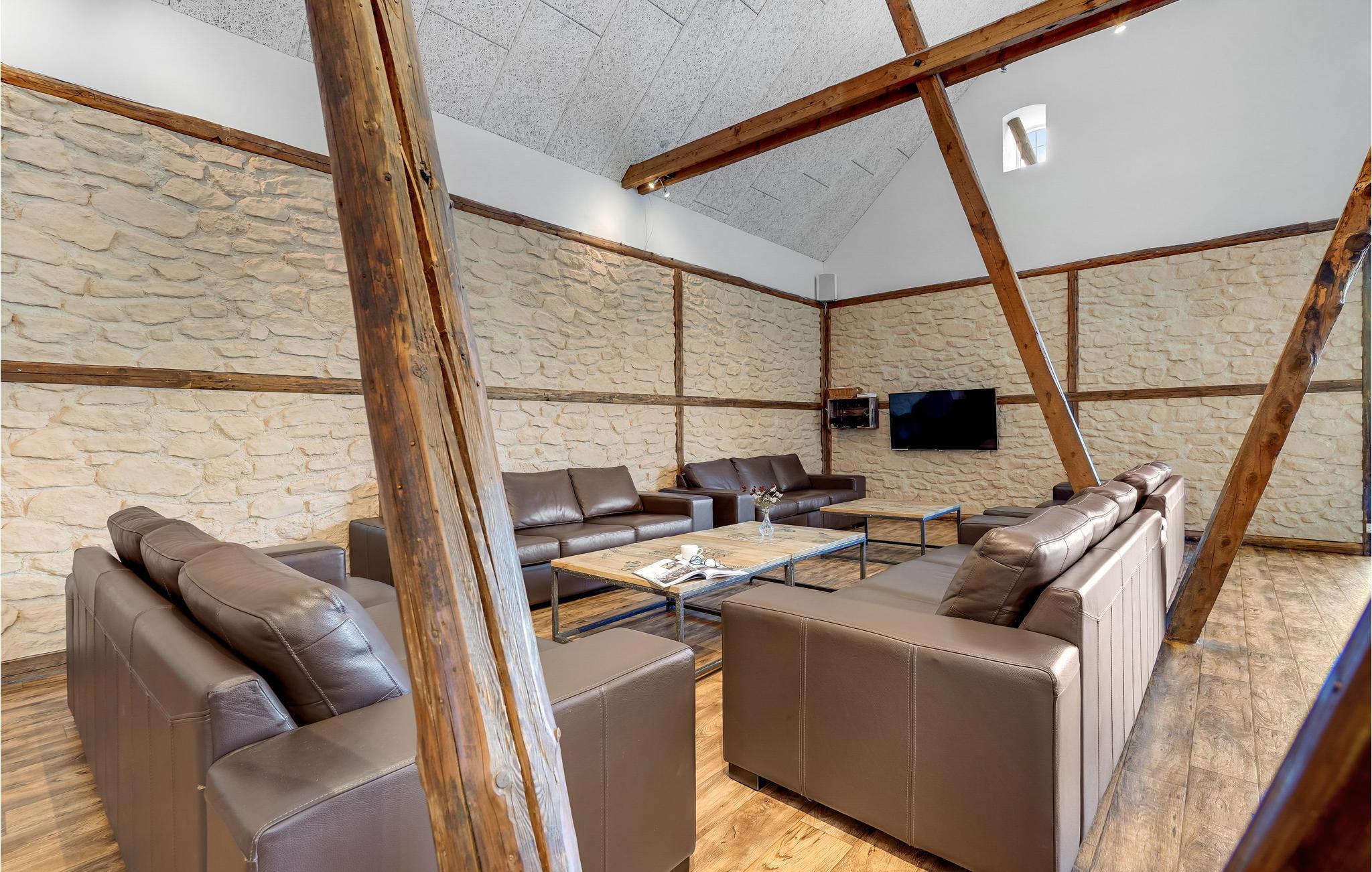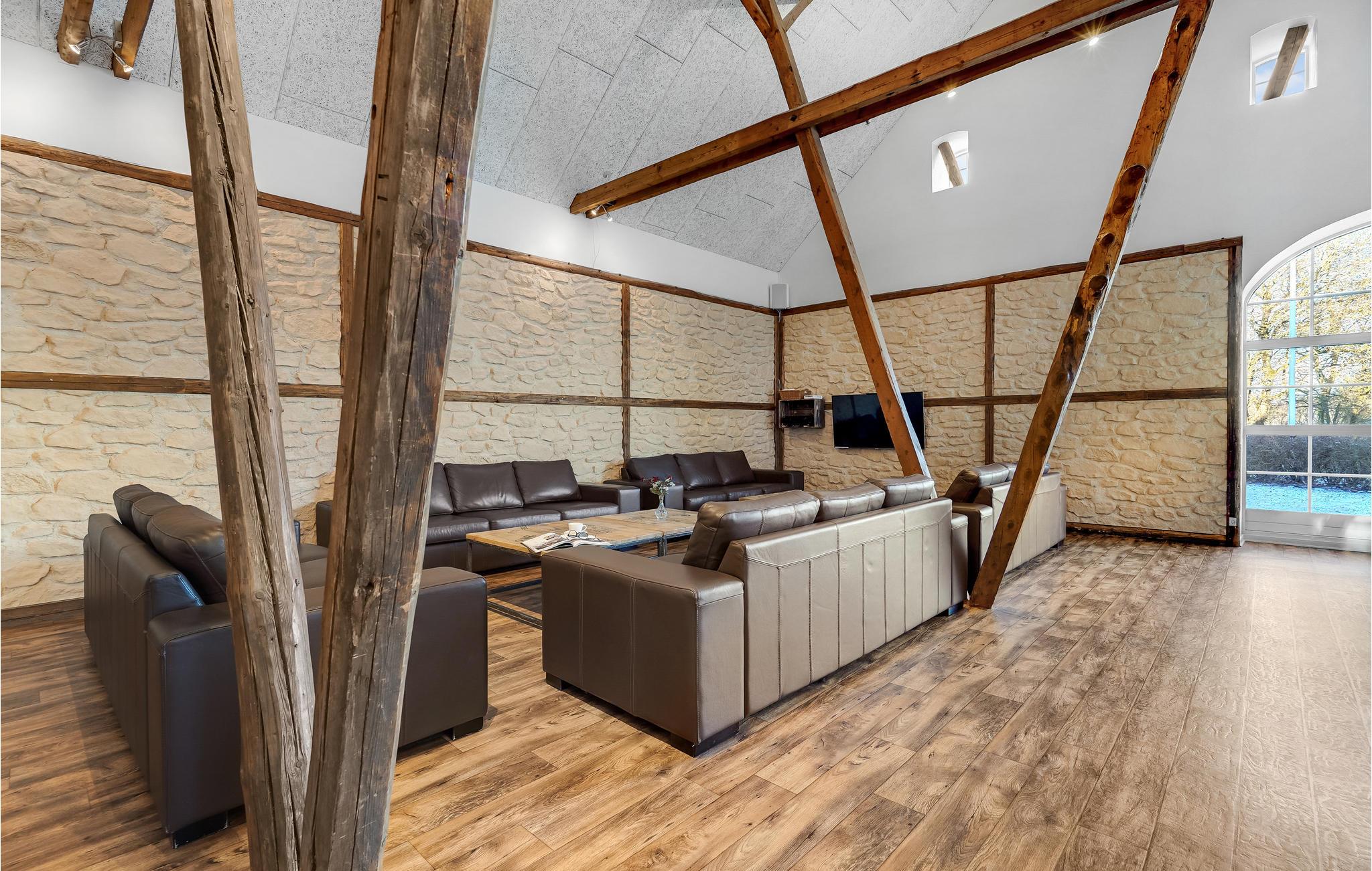 Den store lade på 200 m2 er indrettet som opholdsrum med et langbord til alle husets gæster. Her findes også flere sofagrupper, et billardbord og en 50" fladskærm. Køkkenet er indrettet i det gamle roekammer, og er fuldt professionelt udstyret med 8 kogeplader, 2 ovne, 2 køleskabe, 1 fryseskab samt 2 opvaskemaskiner mm. Staldbygningerne er indrettet med dobbeltværelser, badeværelser og sofaområde med panoramavindue. Endvidere er der et grovkøkken med vaskemaskine og tørretumbler.