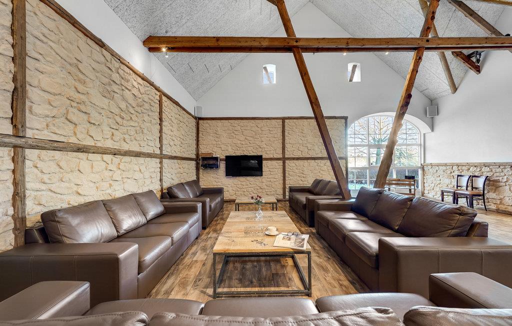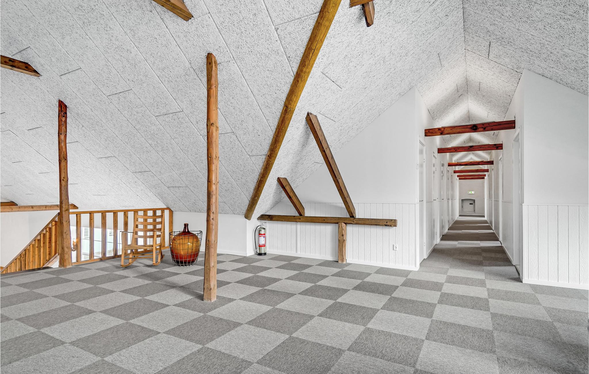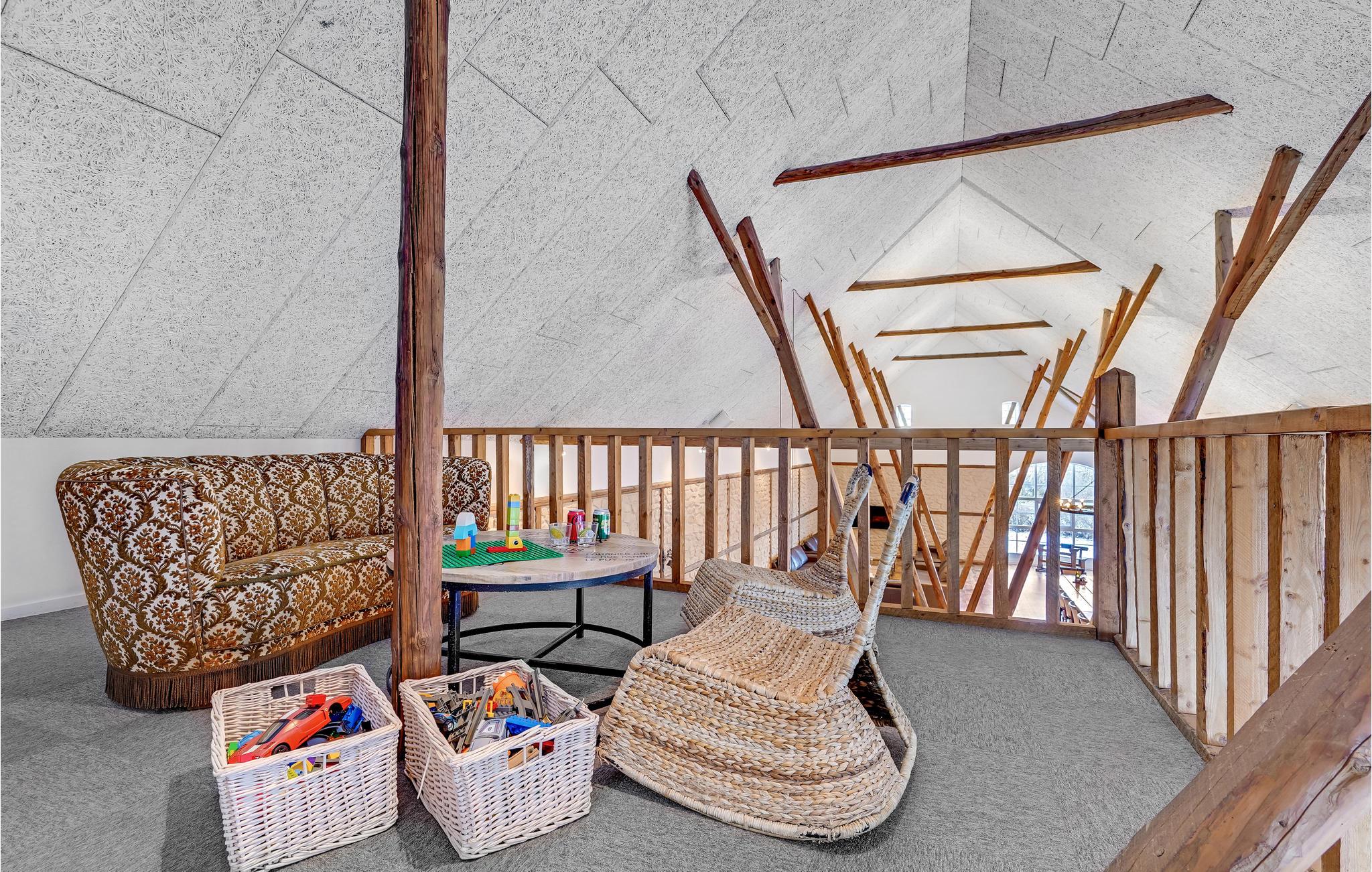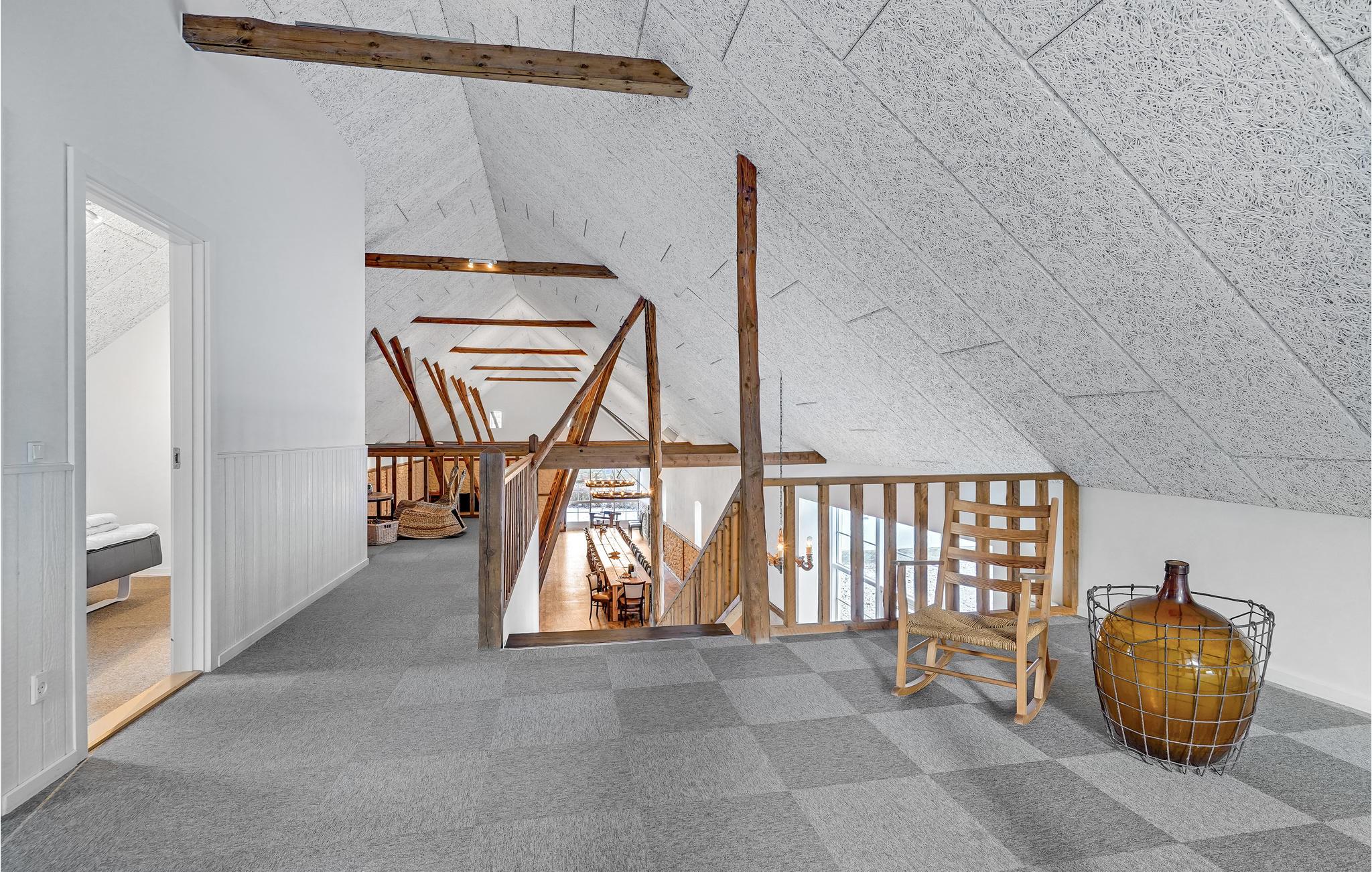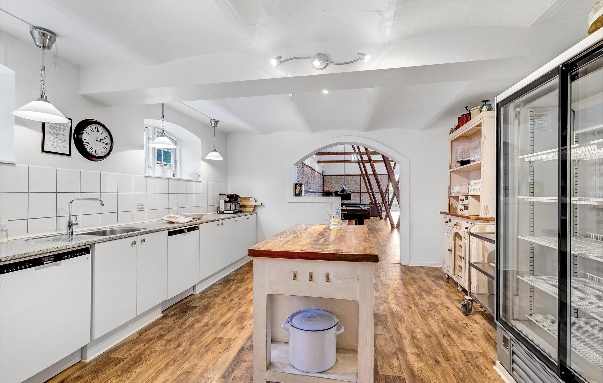 Den store lade på 200 m2 er indrettet som opholdsrum med et langbord til alle husets gæster. Her findes også flere sofagrupper, et billardbord og en 50" fladskærm. Køkkenet er indrettet i det gamle roekammer, og er fuldt professionelt udstyret med 8 kogeplader, 2 ovne, 2 køleskabe, 1 fryseskab samt 2 opvaskemaskiner mm. Staldbygningerne er indrettet med dobbeltværelser, badeværelser og sofaområde med panoramavindue. Endvidere er der et grovkøkken med vaskemaskine og tørretumbler.