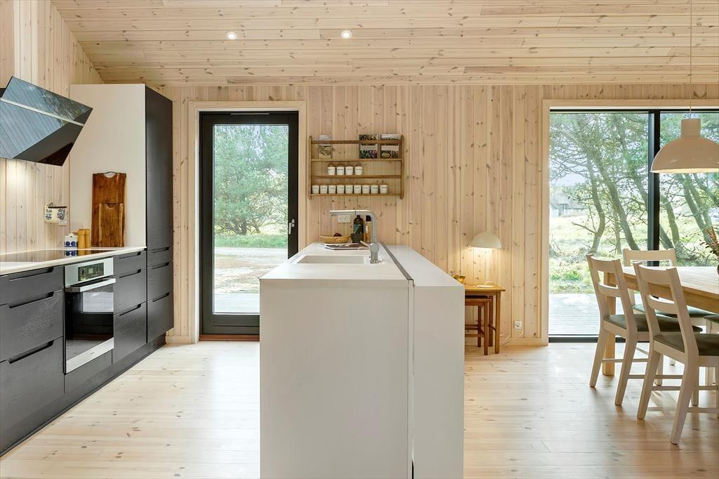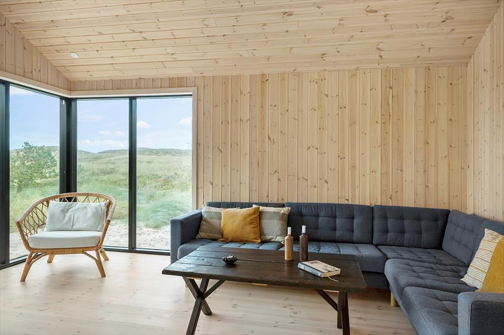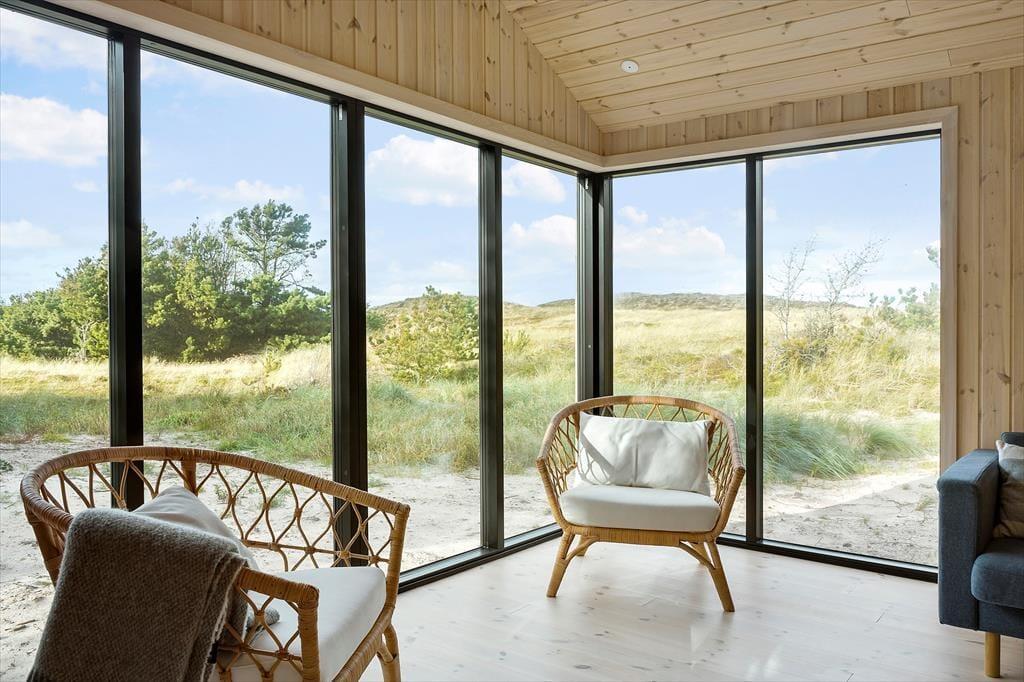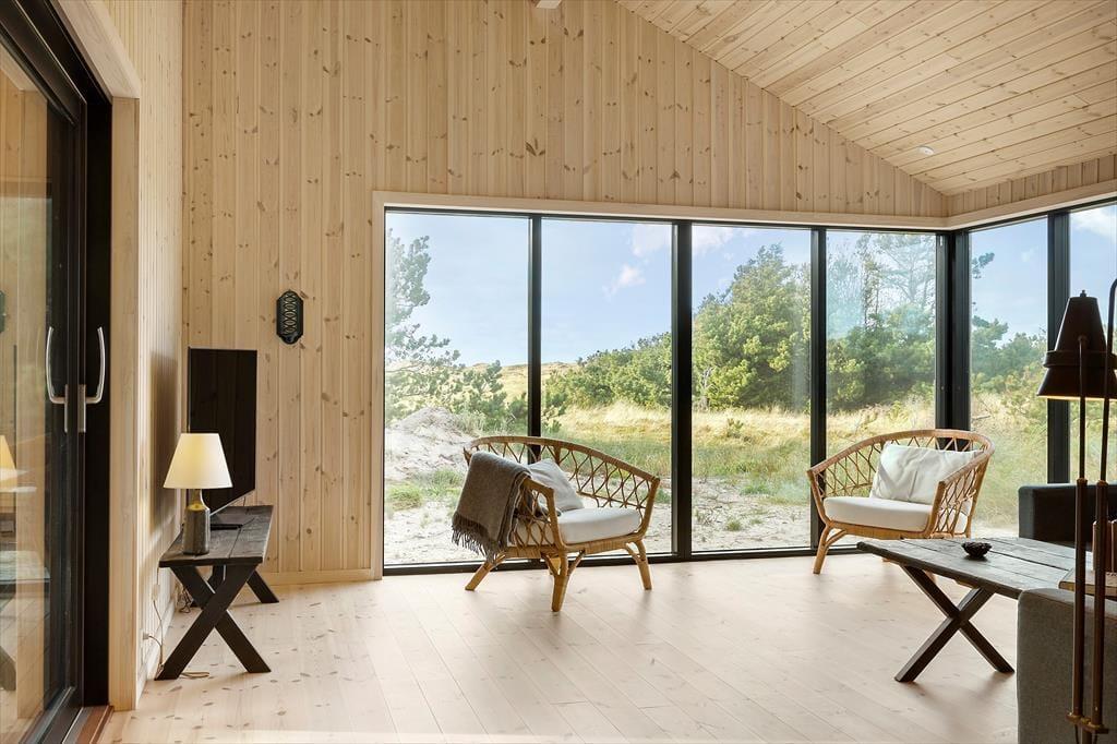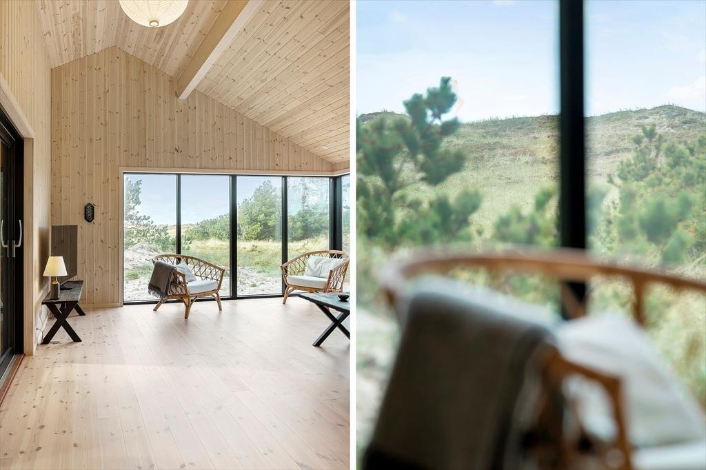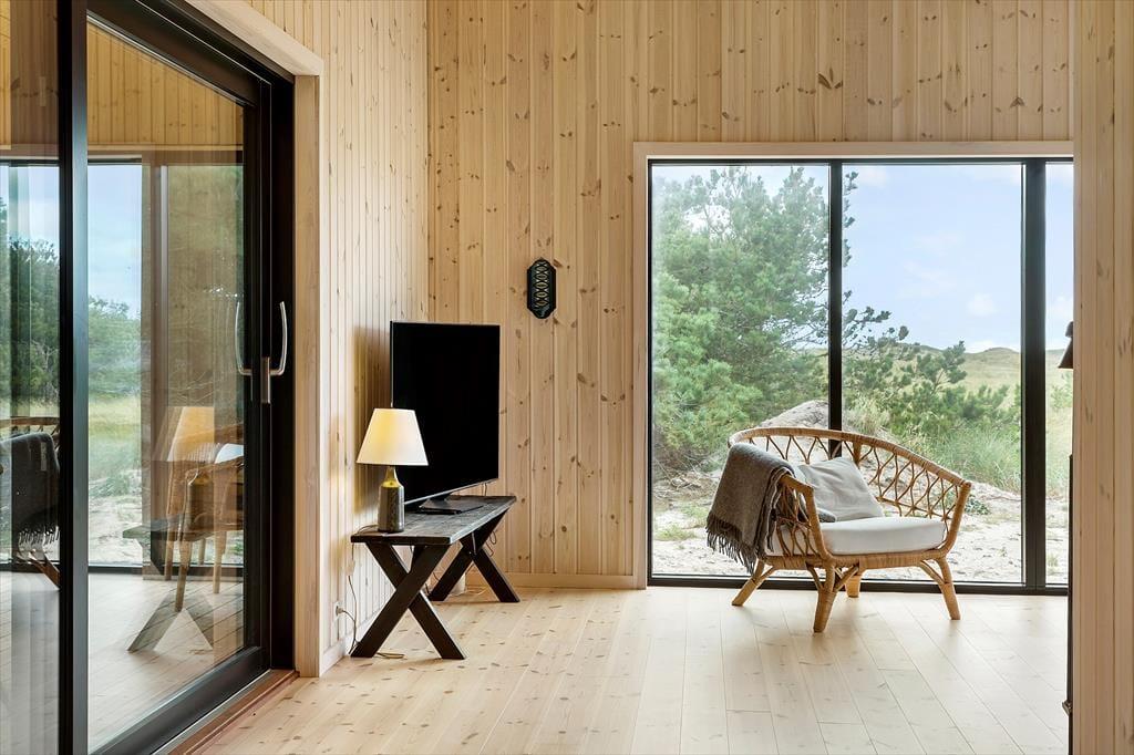 Når du træder ind i dette nybyggede træhus, bliver du mødt af en lys og moderne indretning, der byder på et varmt og indbydende miljø året rundt. Den energibesparende varmepumpe sikrer et behageligt indeklima, mens saunaen indbyder til ultimativ afslapning – perfekt efter en dag med friske gåture i klitterne. Husets rummelige planløsning gør det nemt at samles med familien, men også at finde ro i private kroge.