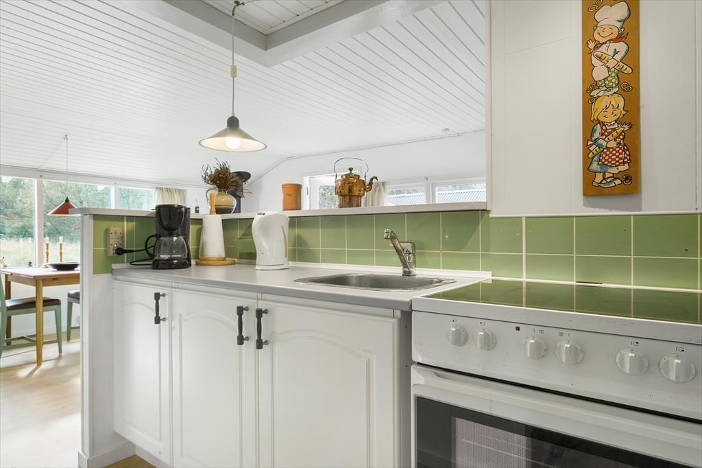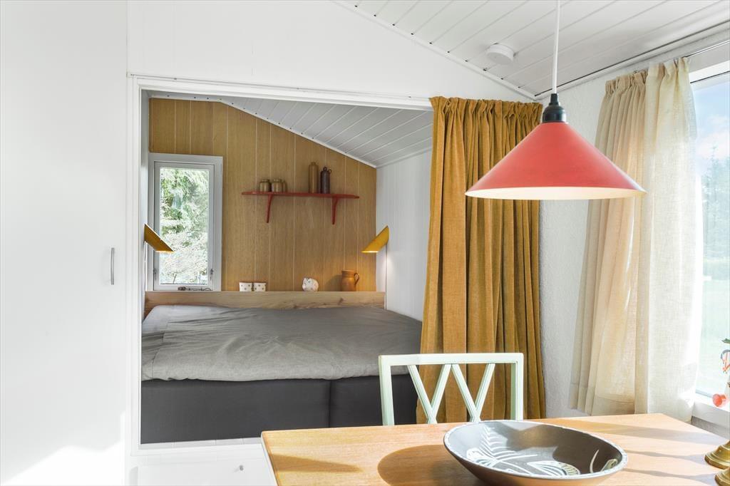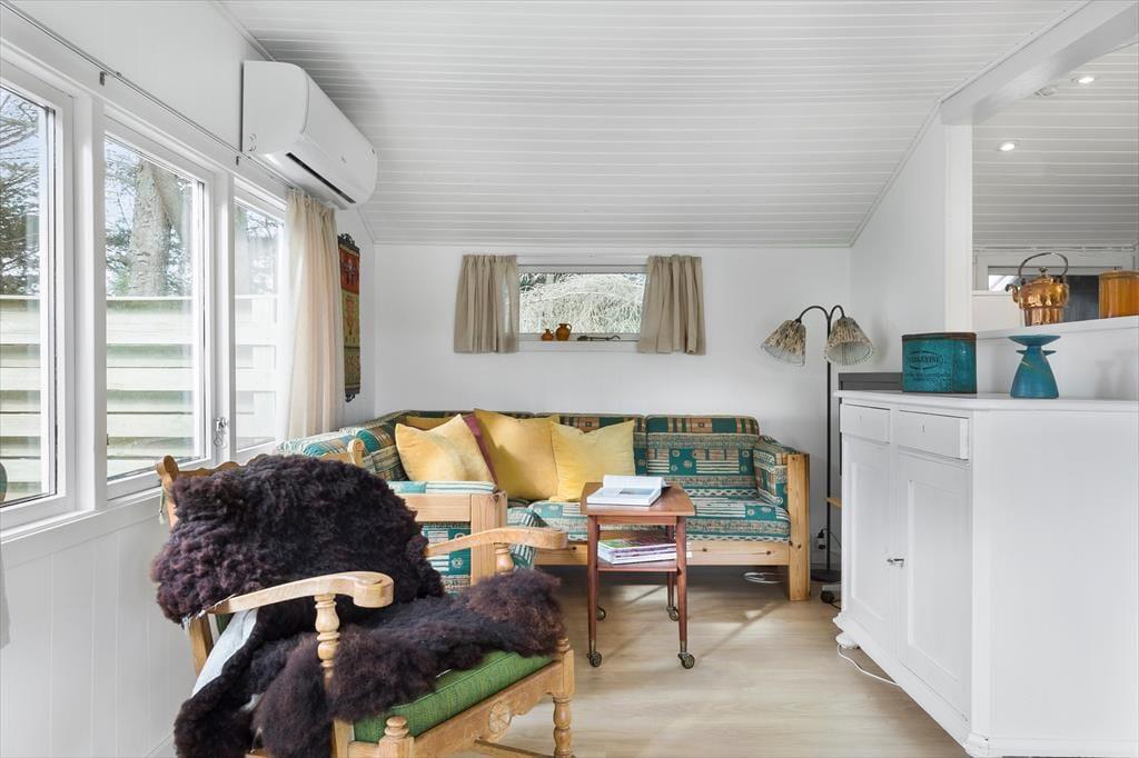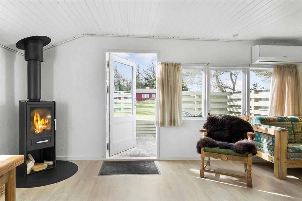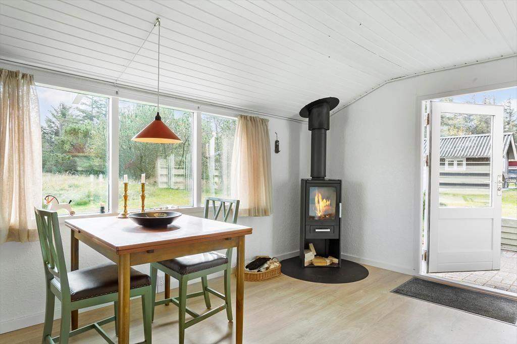 I dette hyggelige sommerhus bliver du mødt af en varm og afslappet stemning. Her er plads til fire personer, og indretningen er designet med tanke på ro og samvær. Stuen byder på et hjertevarmt samlingspunkt med en knitrende brændeovn og energivenlig varmepumpe, der skaber komfort året rundt. Forestil dig at tilbringe aftener foran ilden, mens du lader tiden stå stille og blot nyder den særlige ro, der kun findes i et sommerhus. Køkkenet er åbent og funktionelt, så du nemt kan tilberede måltider, der kan nydes ved spisebordet eller i stuen med udsigt til naturen udenfor.