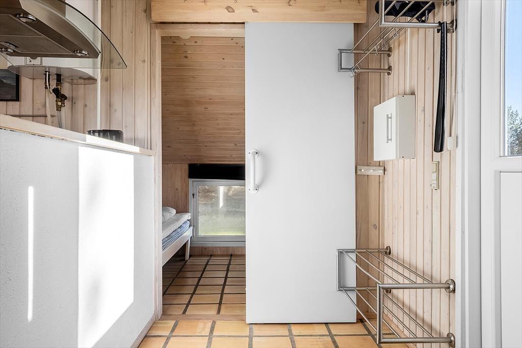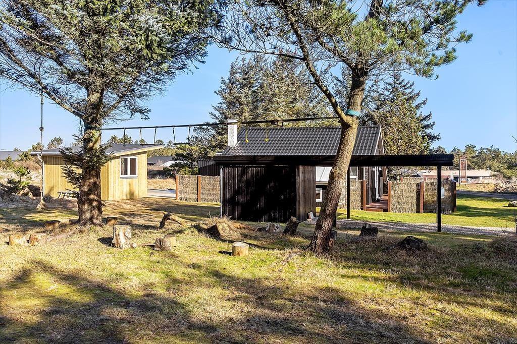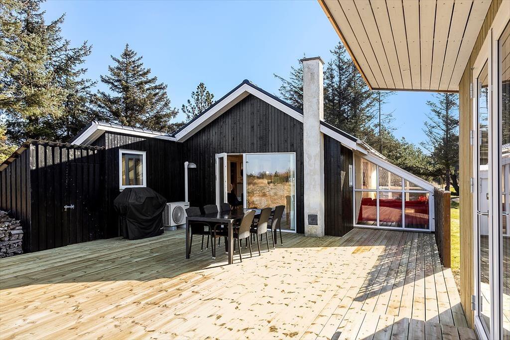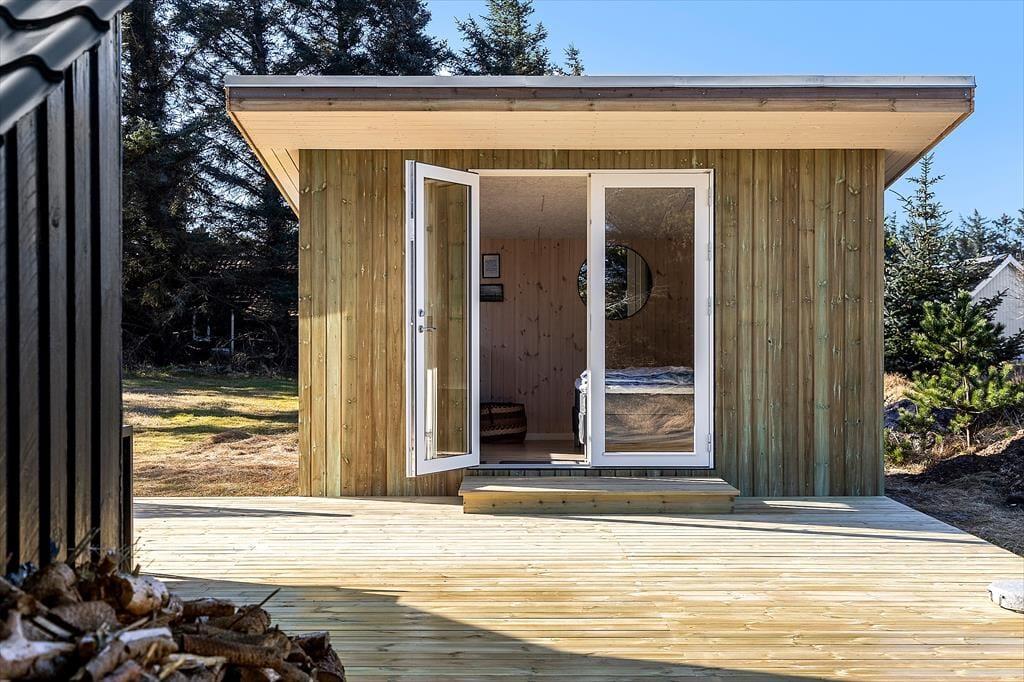 Udenfor finder du flere store terrasseområder, hvor lækroge sikrer en plads i læ for vinden og optimale forhold for afslapning under åben himmel. Terrasserne omkranser sommerhuset, så du altid kan finde en plads i solen, og haven tilbyder en rolig oase, hvor naturen er tæt på. Morgenkaffen kan nydes med udsigt til naturen, og aftenerne afsluttes med grillmad og samtaler under stjernerne. Her kan hver dag starte og slutte i harmoni med den omgivende natur.