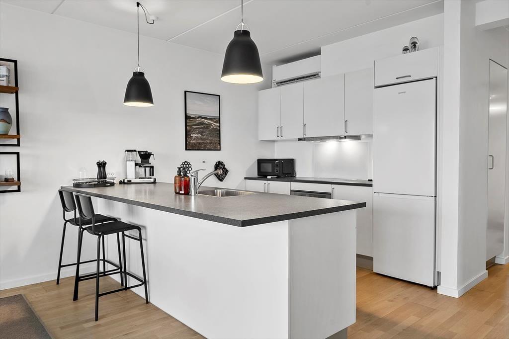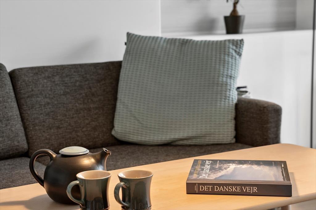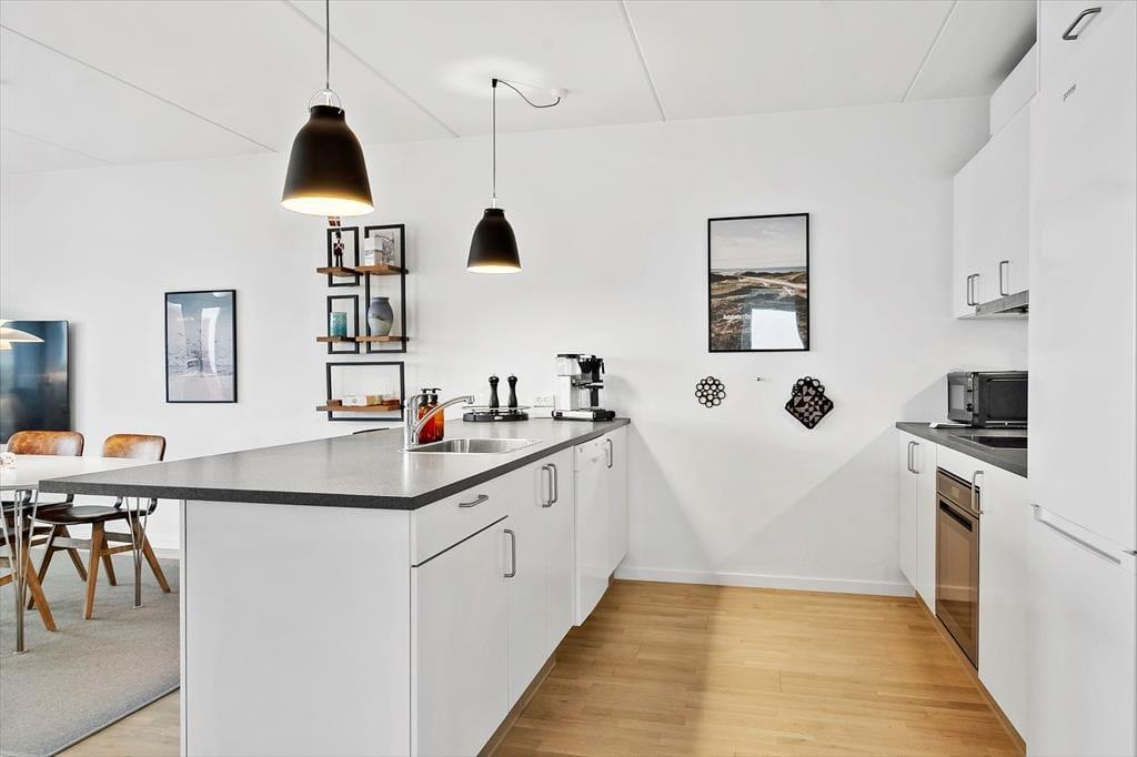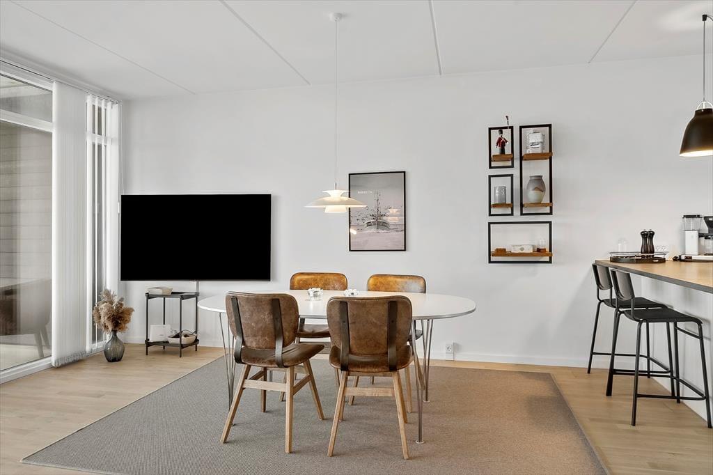 Når du træder ind i ferielejligheden på Havstokken 16 A, mødes du af en lys og indbydende atmosfære, hvor kvalitet og komfort går hånd i hånd. Den store opholdsstue, der er i åben forbindelse med køkken- og alrummet, giver masser af plads til både afslapning og samvær. Her kan du slappe af på den komfortable sofa og kigge ud over det imponerende hav, eller forberede lækre måltider i det veludstyrede køkken. Lejligheden er indrettet med fokus på detaljerne og tilbyder moderne bekvemmeligheder, som sikrer en bekvem og behagelig ferieoplevelse for den kræsne gæst. Den smagfulde indretning og de store vinduer, der giver lys og luft, bidrager til en følelse af luksus og ro.