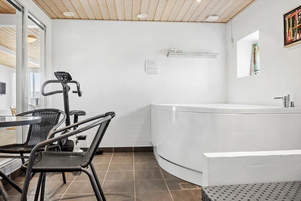 Allerede når du træder ind ad døren, mærker du, at her er god plads og en indbydende atmosfære. Det store og rummelige sommerhus byder på tre separate værelser og mange hyggelige kroge, hvor hele familien kan finde sig til rette. I husets lyse stue lokker brændeovnen med varme og knitrende hygge, og i aktivitetsområdet står bordfodbold og dart klar til timevis af venskabelige dueller. Når dagen lakker mod enden, kan I forkæle jer selv med en tur i husets spa eller en afslappende saunatur – det perfekte sted at lande efter en dag fyldt med strandture og naturoplevelser. Her er ganske enkelt tænkt på det hele, og du mærker hurtigt, hvordan feriestemningen sænker sig, når rammerne er så velfungerende og hjertevarme.