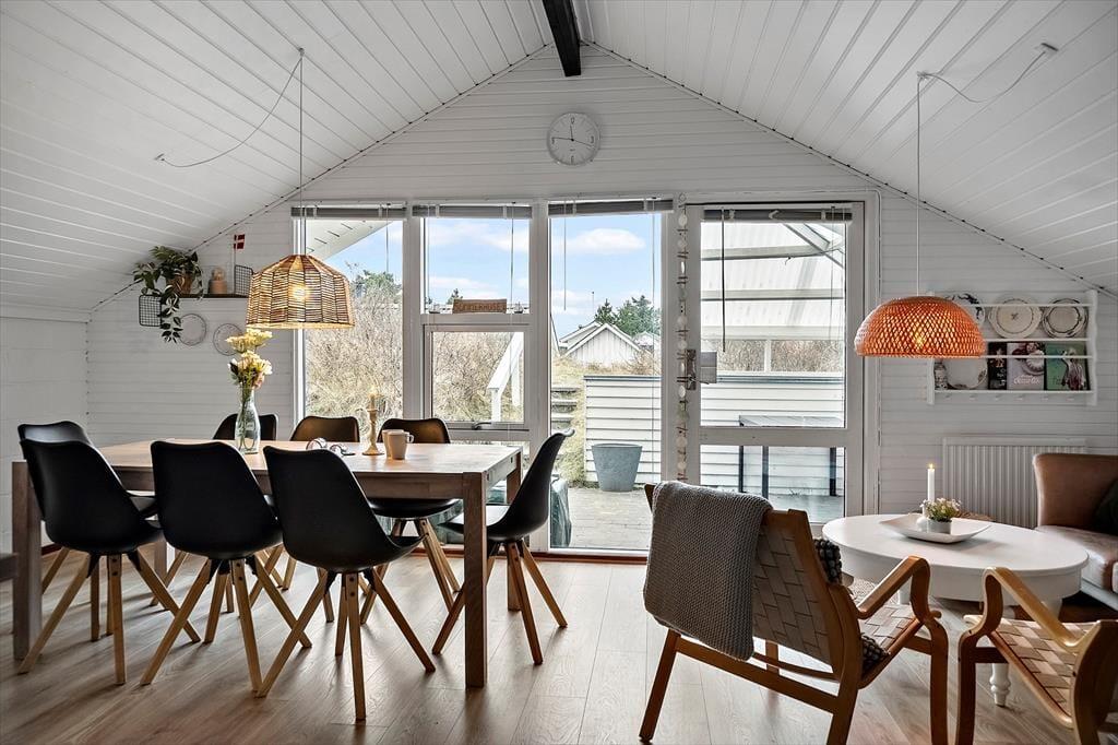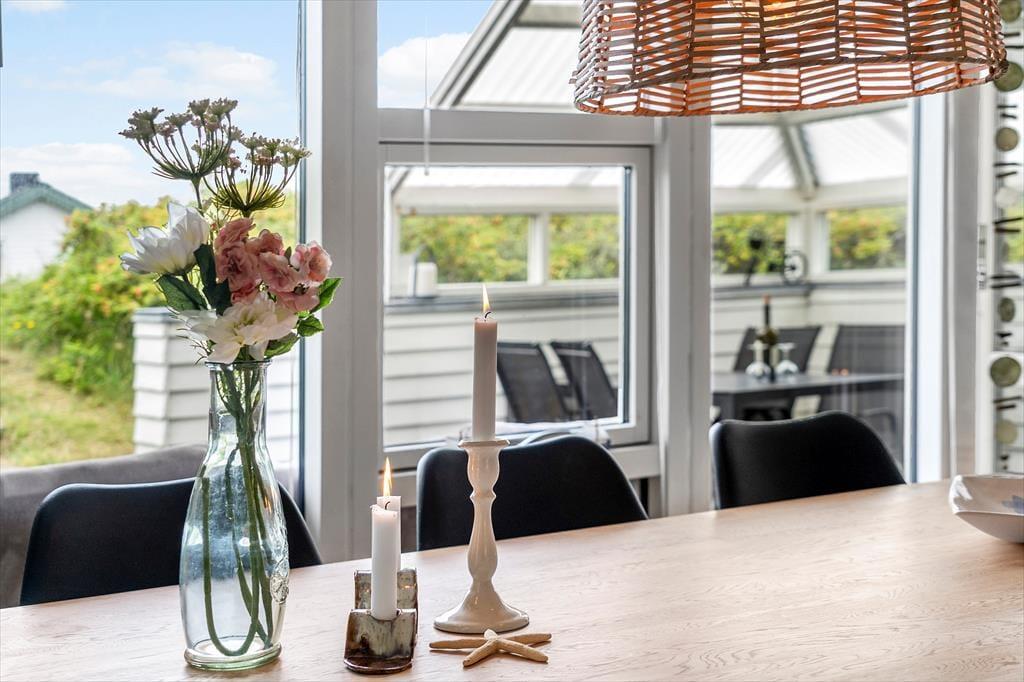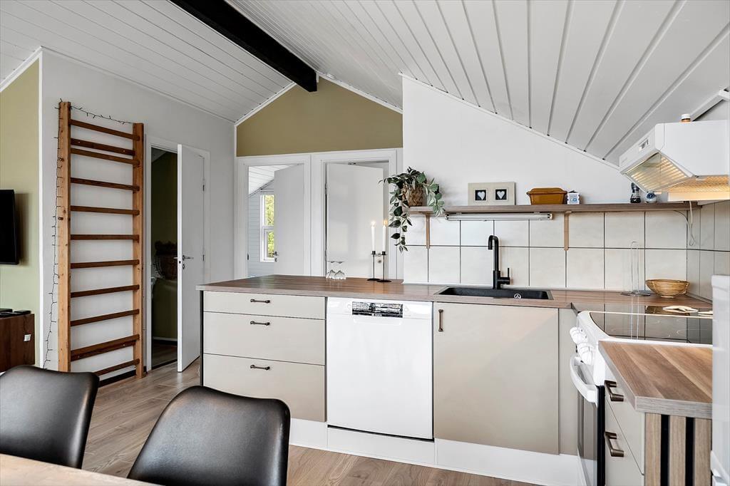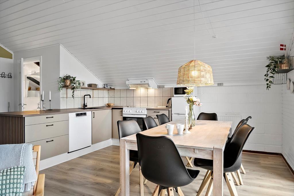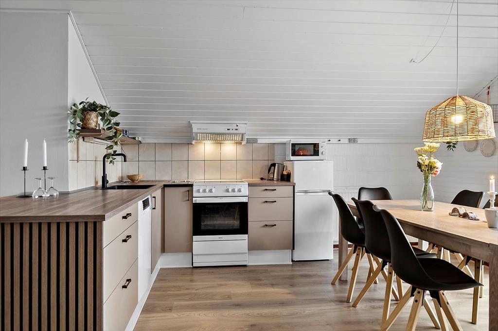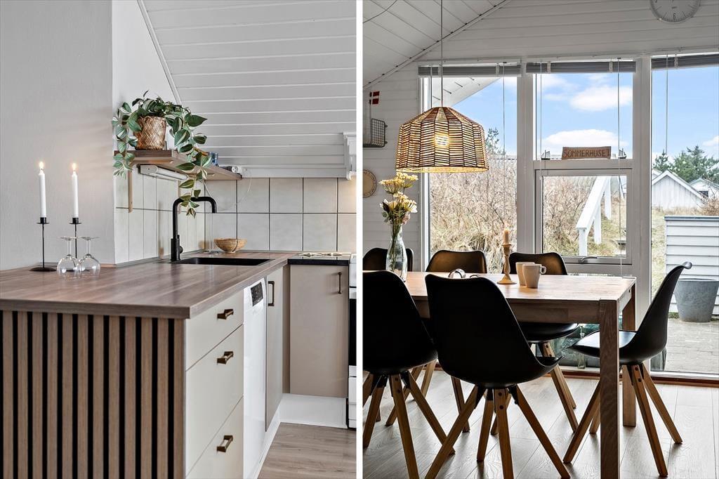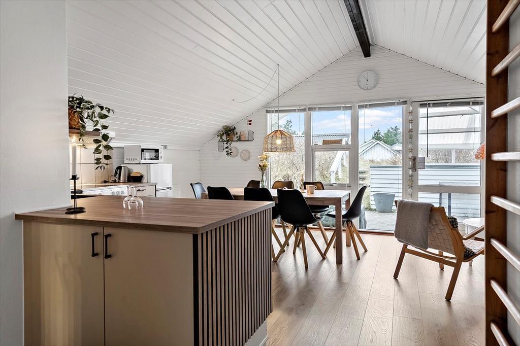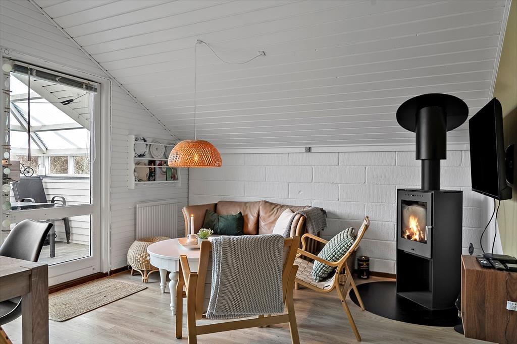 Træd ind i et lyst og venligt sommerhus, hvor det åbne køkken-alrum smelter sammen med den hyggelige opholdsstue. Her er der tænkt på komfort og afslapning – både for øjet og for kroppen. I 2025 har huset gennemgået en delvis renovering, hvilket tydeligt mærkes i det opdaterede interiør og det moderne udtryk, der stadig formår at bevare sommerhusets oprindelige charme. Den knitrende brændeovn bliver hurtigt samlingspunktet på kølige aftener, hvor du kan nyde et glas vin eller en god bog, mens varmen spreder sig og stemningen sænker sig. Lyset strømmer ind gennem de store vinduespartier og giver huset en særlig lethed og ro, som straks får skuldrene til at sænke sig.