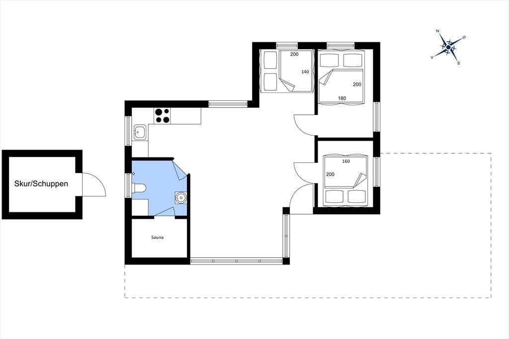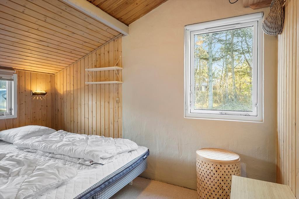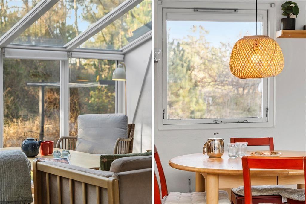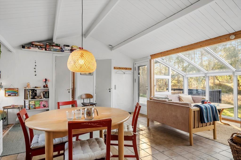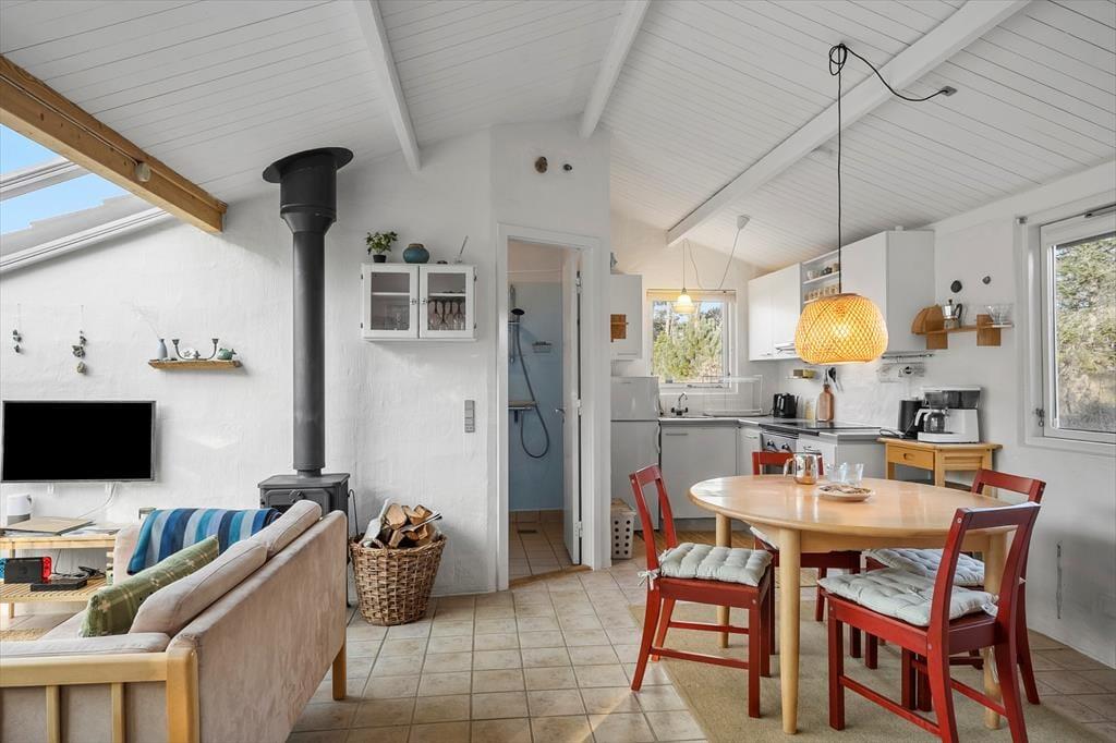 Når du træder ind i dette charmerende sommerhus i Vorupør, mødes du af en varm og imødekommende atmosfære. De store sydvendte vinduespartier lader lyset strømme ind og skaber et levende samspil mellem opholdsrum og natur – som om klitlandskabet bliver en del af indretningen. I stuen kan du synke ned i sofaen med udsigt til de bølgende klitter, mens den hyggelige brændeovn knitrer i baggrunden og spreder en helt særlig ro. Sammen med den energivenlige varmepumpe sikres et behageligt indeklima året rundt, uanset om solen står højt på himlen eller vinterstormene rusker udenfor. Badeværelset byder på ekstra luksus i form af en sauna, hvor du kan varme kroppen igennem efter en lang dag ved Vesterhavet – en perfekt afslutning på en dag fyldt med natur, havluft og god tid.