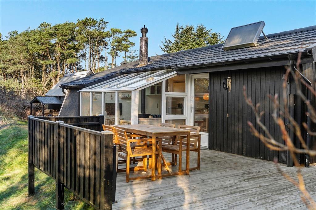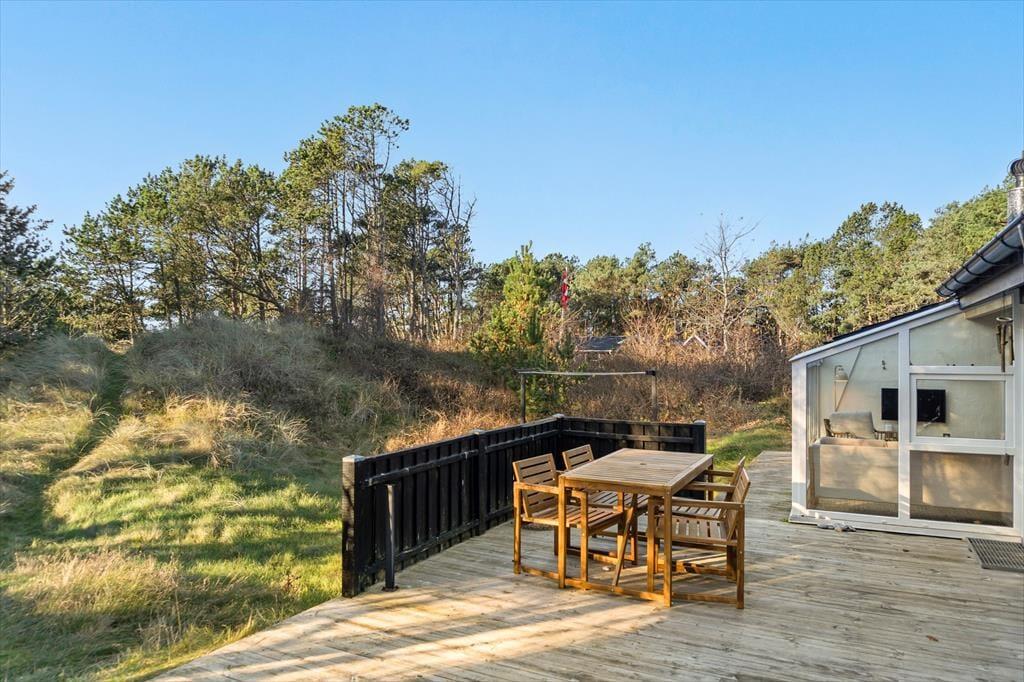 Udenfor venter en fin naturgrund, hvor du kan mærke stilheden, vinden og den særlige duft af marehalm og klitter. Sommerhuset ligger ugeneret og fredeligt, så du kan nyde morgenkaffen på terrassen, mens solen langsomt bevæger sig op over landskabet. Fuglene kvidrer i baggrunden, og du kan mærke, hvordan skuldrene sænker sig helt af sig selv. I løbet af dagen inviterer terrassen til alt fra solbadning til grillhygge, og de naturlige omgivelser giver børnene frihed til at lege og udforske området. Når aftenen falder på, kan du trække et tæppe over skuldrene og nyde himlen, der ofte folder sig ud i et væld af stjerner – helt uden forstyrrelser. Skal elbilen lades op, kan du gøre det direkte ved sommerhuset, så næste dags små udflugter i Thy ligger lige for.