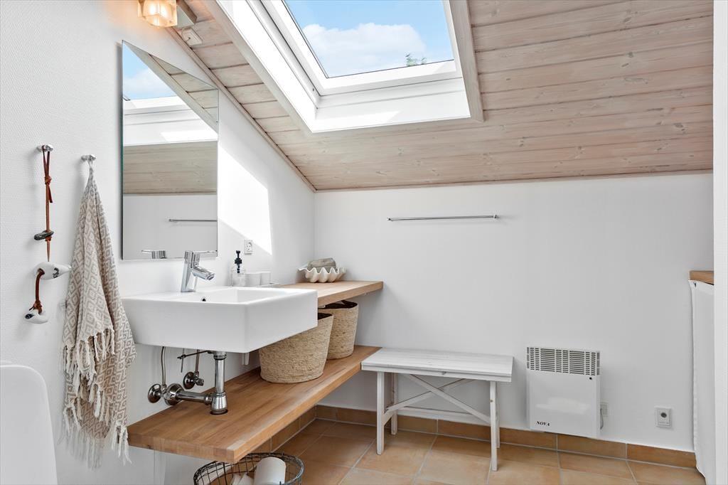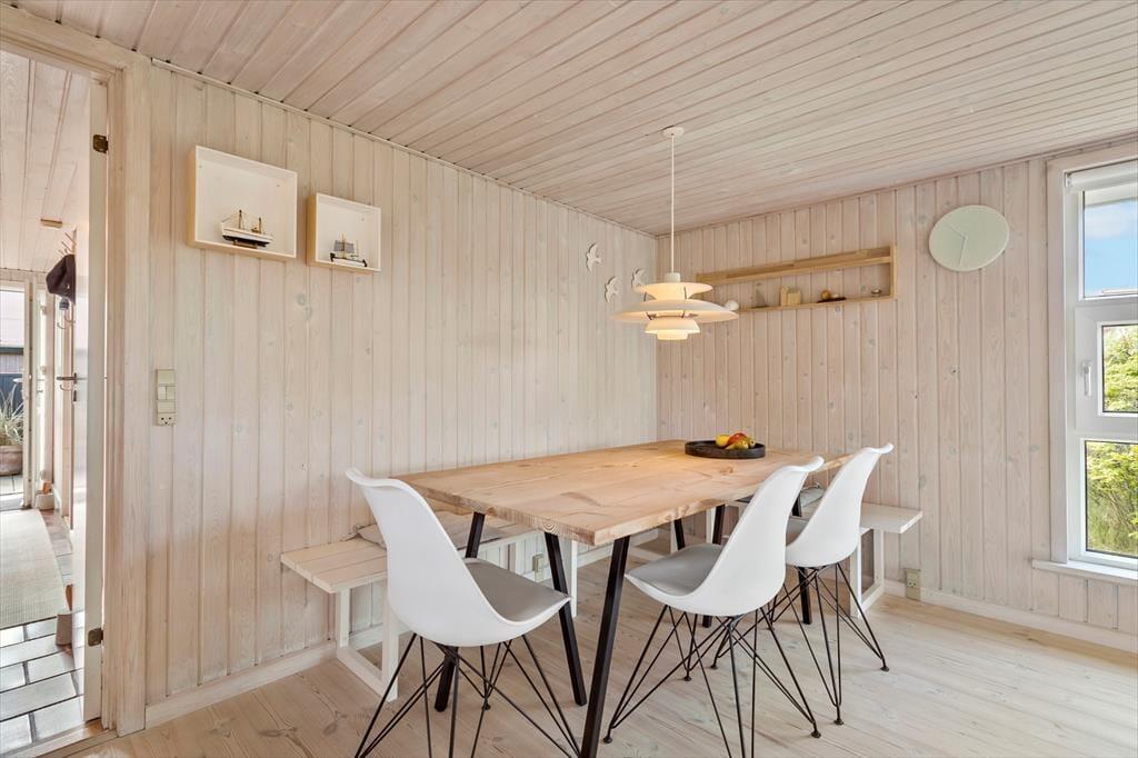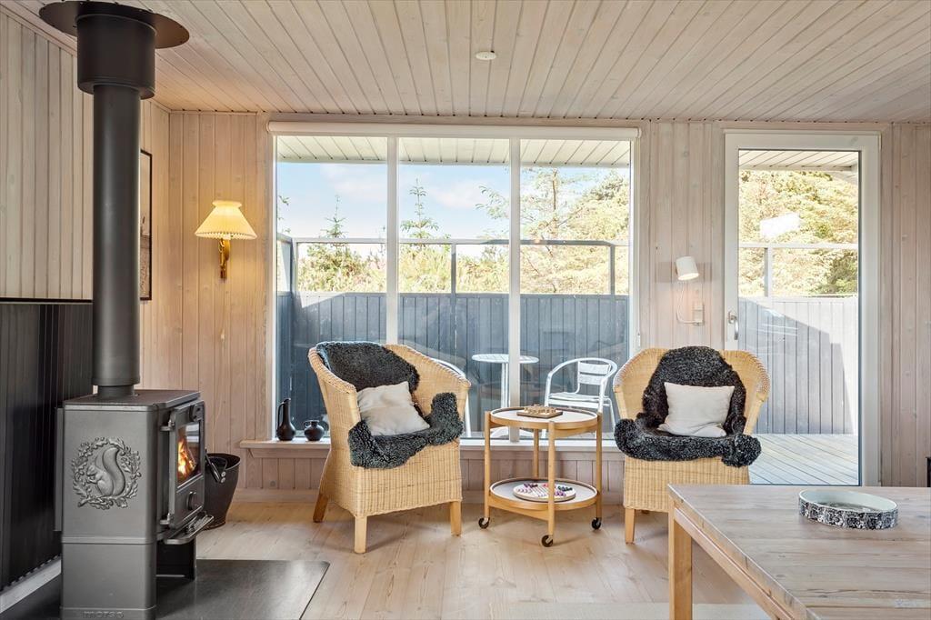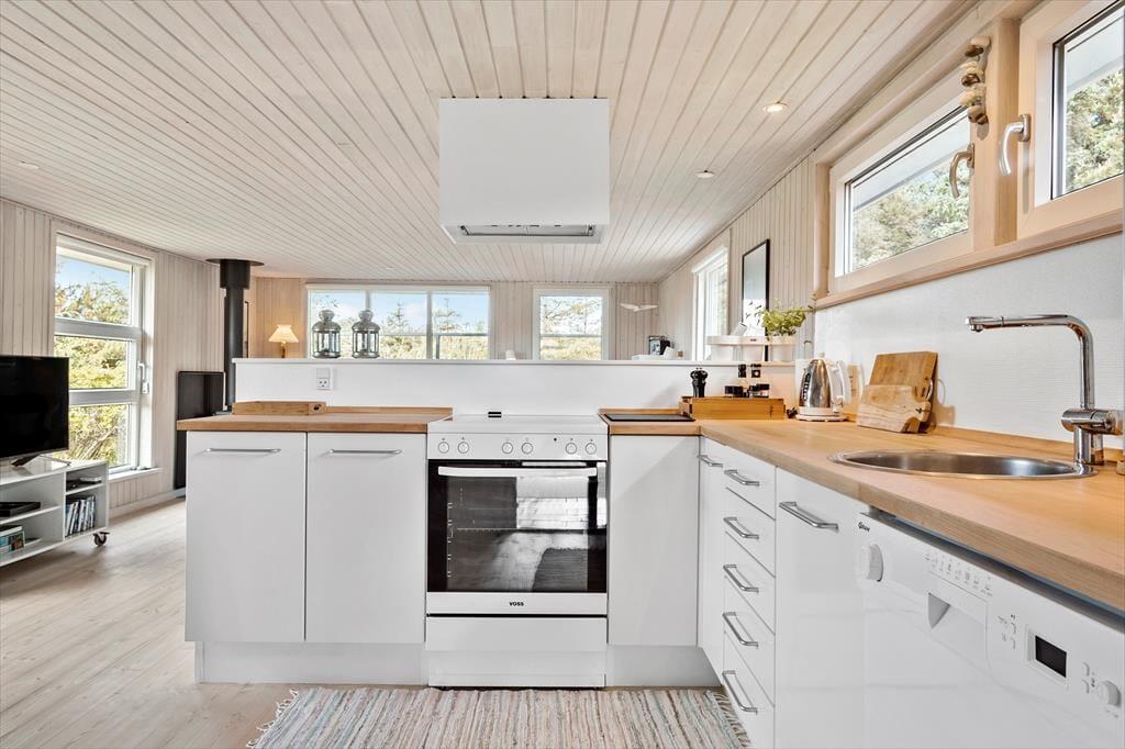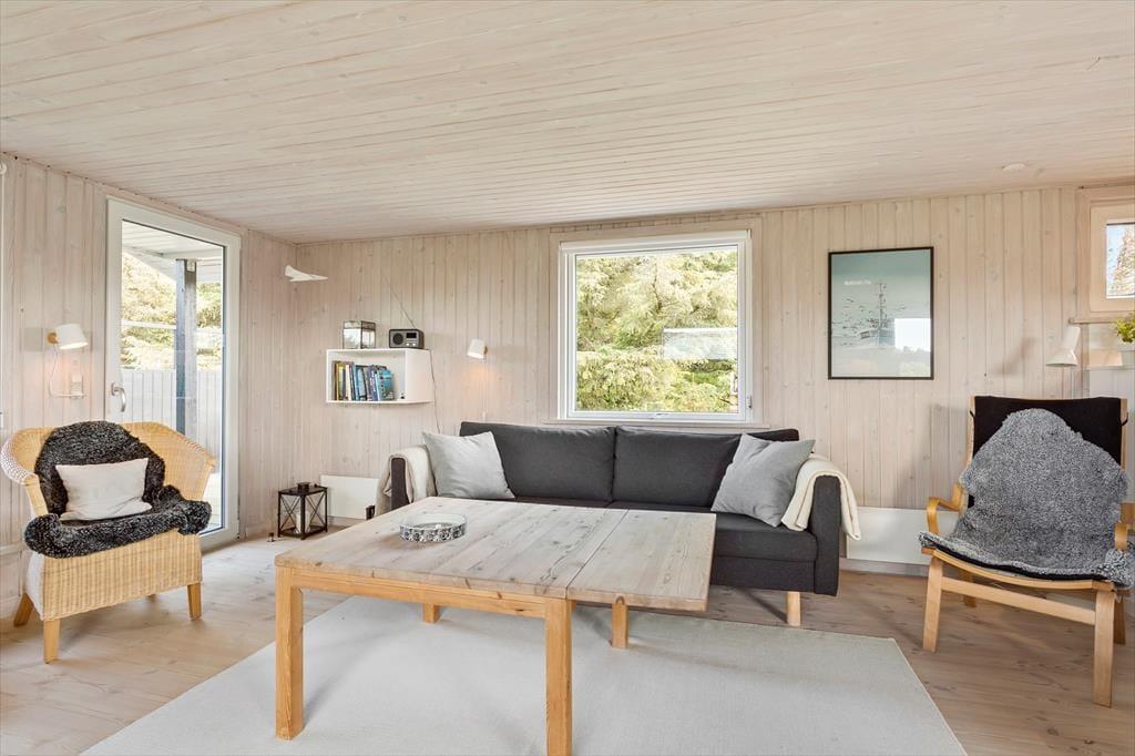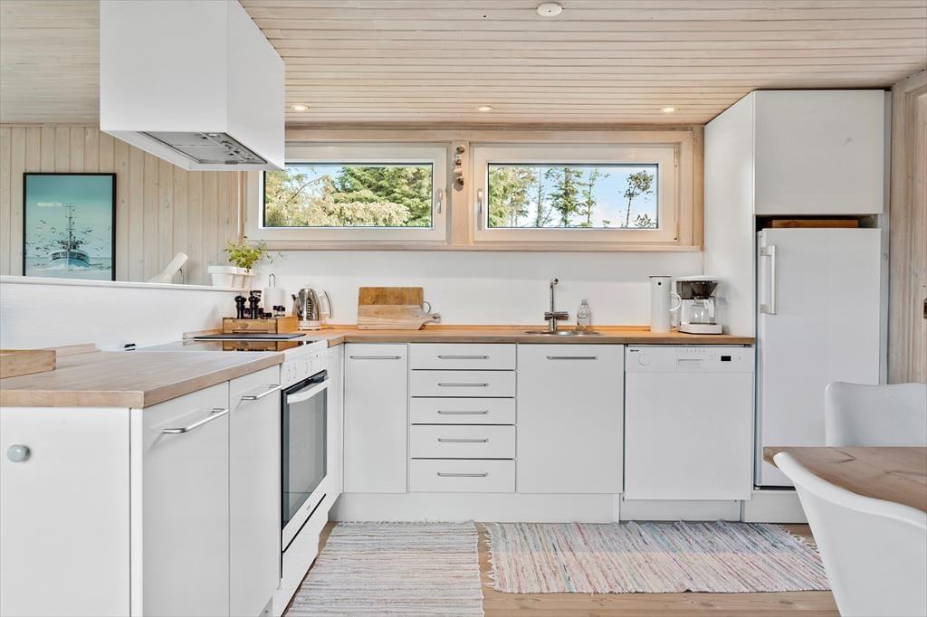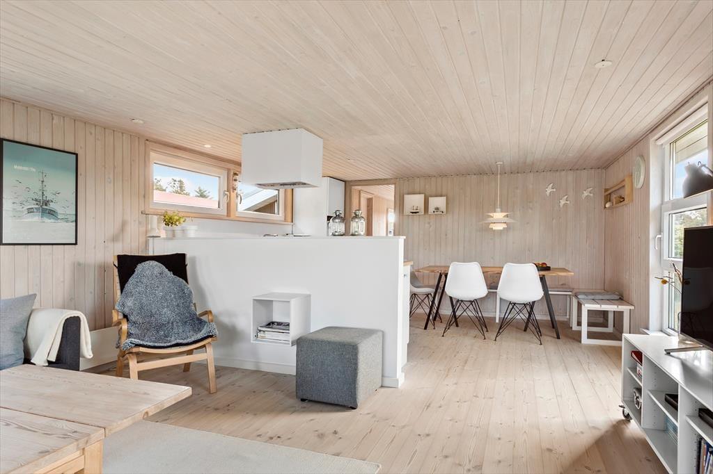 Når du træder indenfor i dette skønne sommerhus, mødes du af en varm og indbydende atmosfære. Indretningen er smagfuld, lys og typisk skandinavisk, hvor naturmaterialer og bløde nuancer skaber en afslappende stemning. Den hyggelige stue med brændeovn er hjertet i huset og det perfekte samlingspunkt for familien efter en dag i den friske havluft. Her kan du nyde varmen fra flammerne, mens du lytter til en god lydbog eller deler dagens oplevelser med dine nærmeste. Køkkenet er funktionelt og veludstyret, så du kan tilberede lækre måltider, som kan nydes ved spisebordet med udsigt til haven.