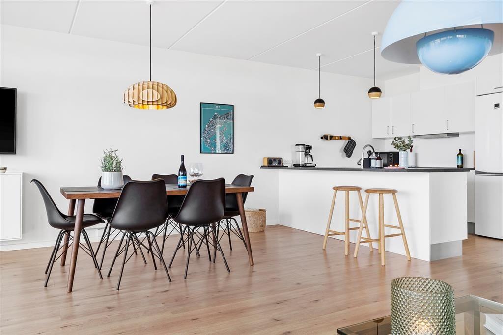 Indenfor mødes du af en stilren og hyggelig atmosfære, hvor store vinduer trækker lyset og naturen helt ind i rummene. Indretningen er moderne og smagfuld med en varm og indbydende stemning, der gør det nemt at slappe af. Stuen byder på en skøn sofa, hvor du kan synke ned med en god bog eller nyde en kop kaffe, mens du betragter det skiftende lys over klitterne. Køkkenet er veludstyret og åbent, så feriemåltiderne kan tilberedes i hyggelige rammer.