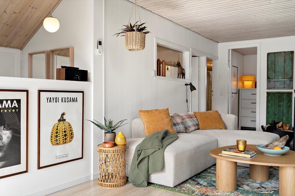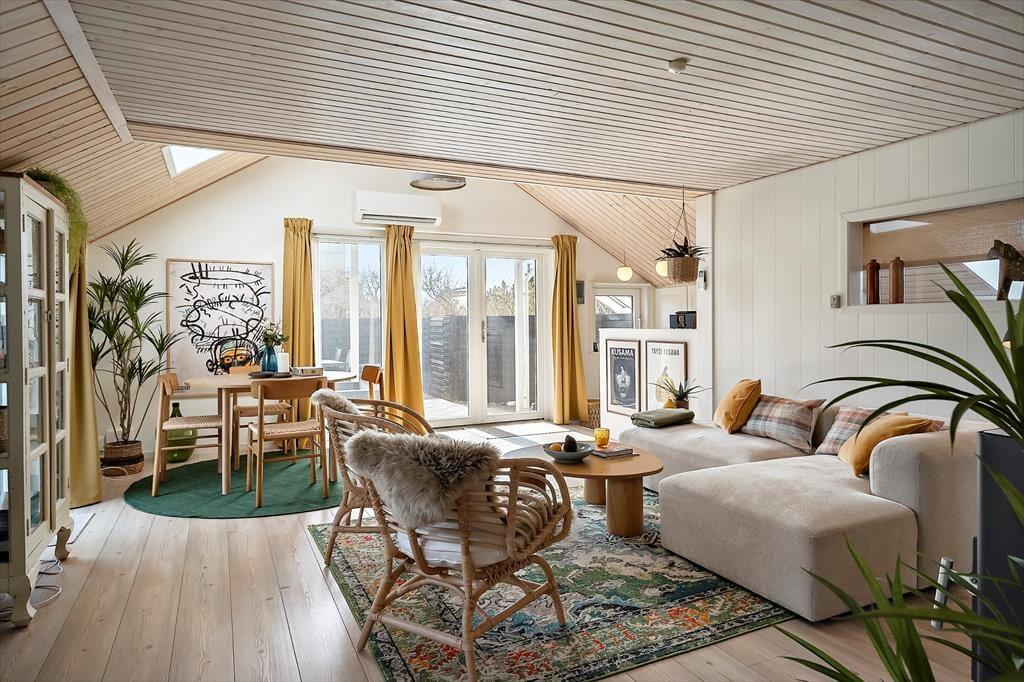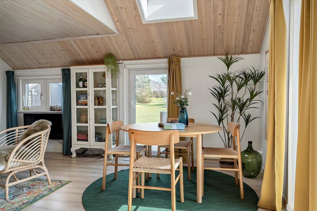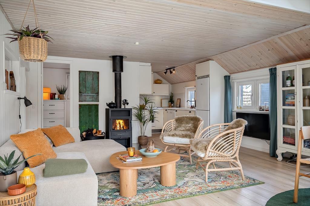 Træd indenfor i dette dejlige sommerhus, hvor en varm og indbydende atmosfære straks møder dig. Her skaber den moderne, men hyggelige indretning en skøn ramme om ferien, uanset om du søger afslapning eller kvalitetstid med familien. I stuen kan du samles omkring brændeovnen, hvis flammer spreder varme og hygge på kølige aftener, mens varmepumpen sikrer en behagelig temperatur året rundt. Huset er indrettet med et åbent opholdsrum, der kombinerer køkken, spiseområde og stue, så samværet altid er i centrum. De bløde møbler og den lyse, nordiske stil inviterer til afslapning med en god bog eller en brætspilsaften efter en dag med frisk havluft.