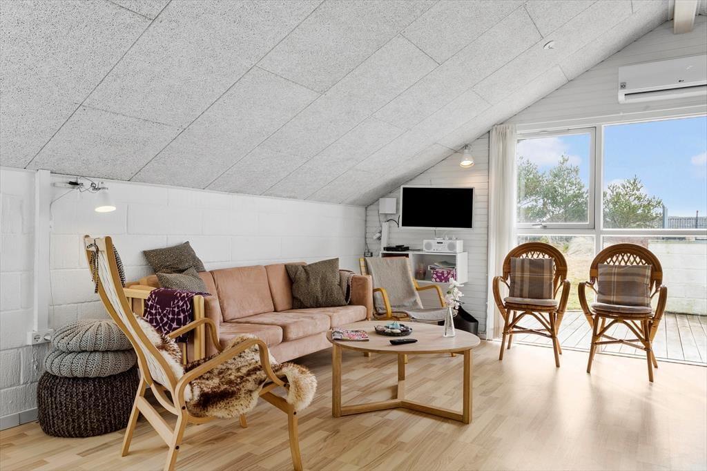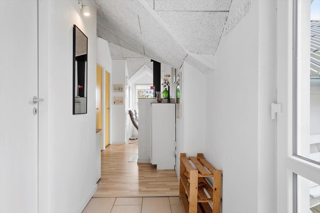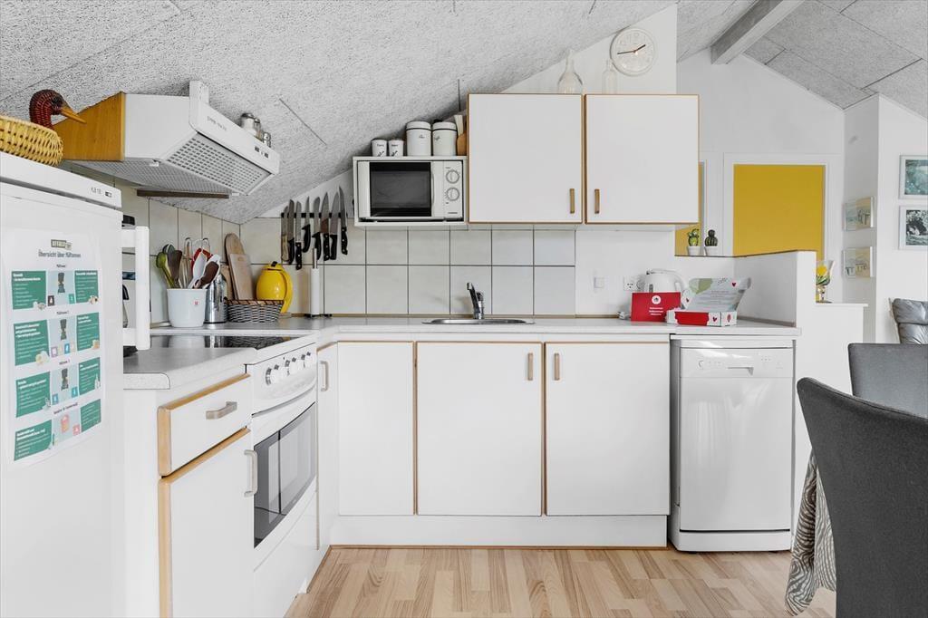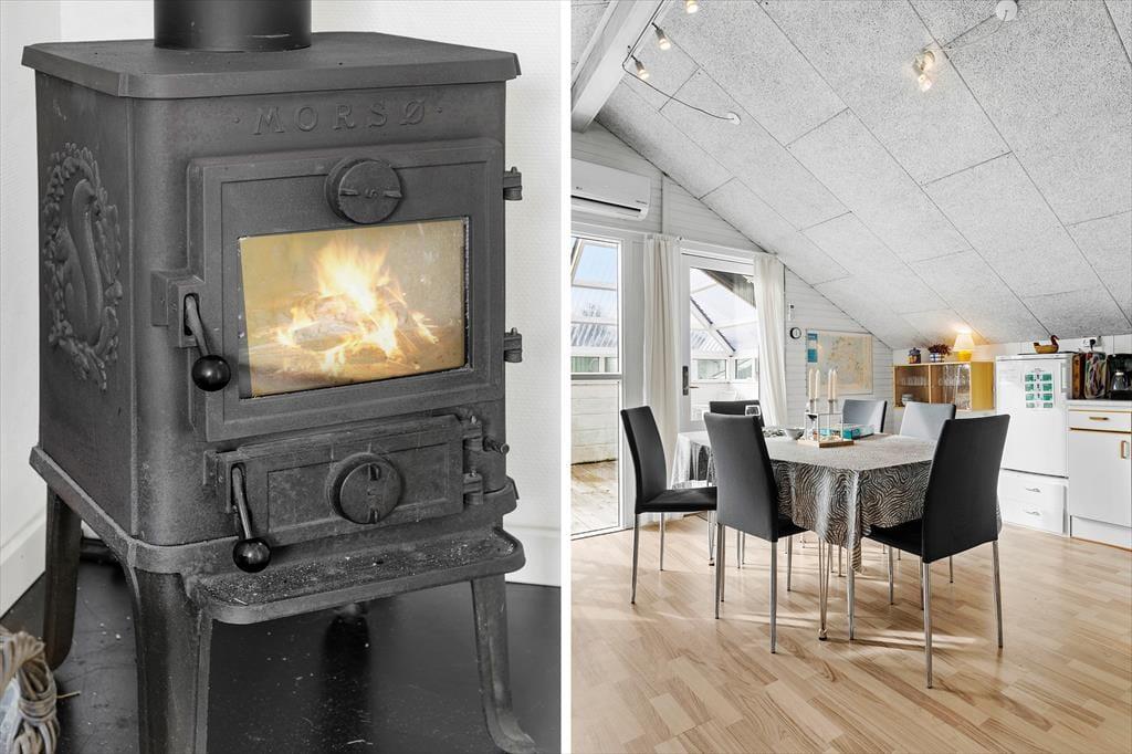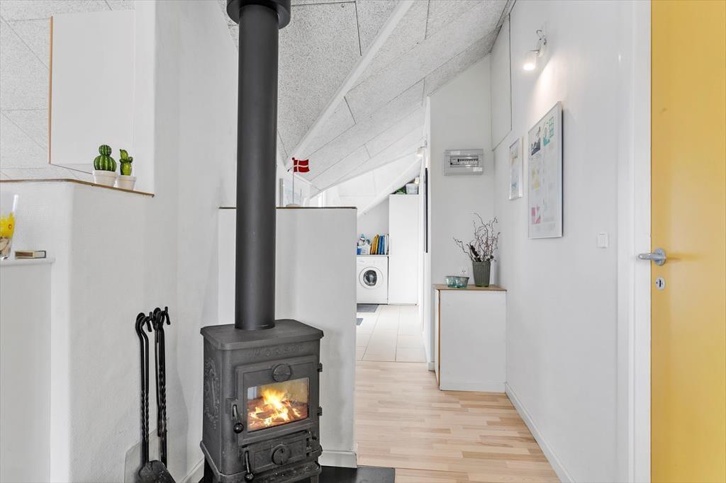 Når du træder ind i dette hyggelige sommerhus, bliver du mødt af en indretning, der emmer af varme og hjemlighed. De lyse rum, træbeklædte vægge og nøje udvalgte detaljer skaber en afslappende stemning, hvor du straks føler dig hjemme. Midtpunktet i opholdsrummet er den charmerende brændeovn, der spreder både varme og hygge på kølige dage – perfekt til lange aftener med spil, gode bøger eller bare ren afslapning i sofaen. Køkkenet er åbent og funktionelt, så det er nemt at samles om madlavningen og dagens måltider.