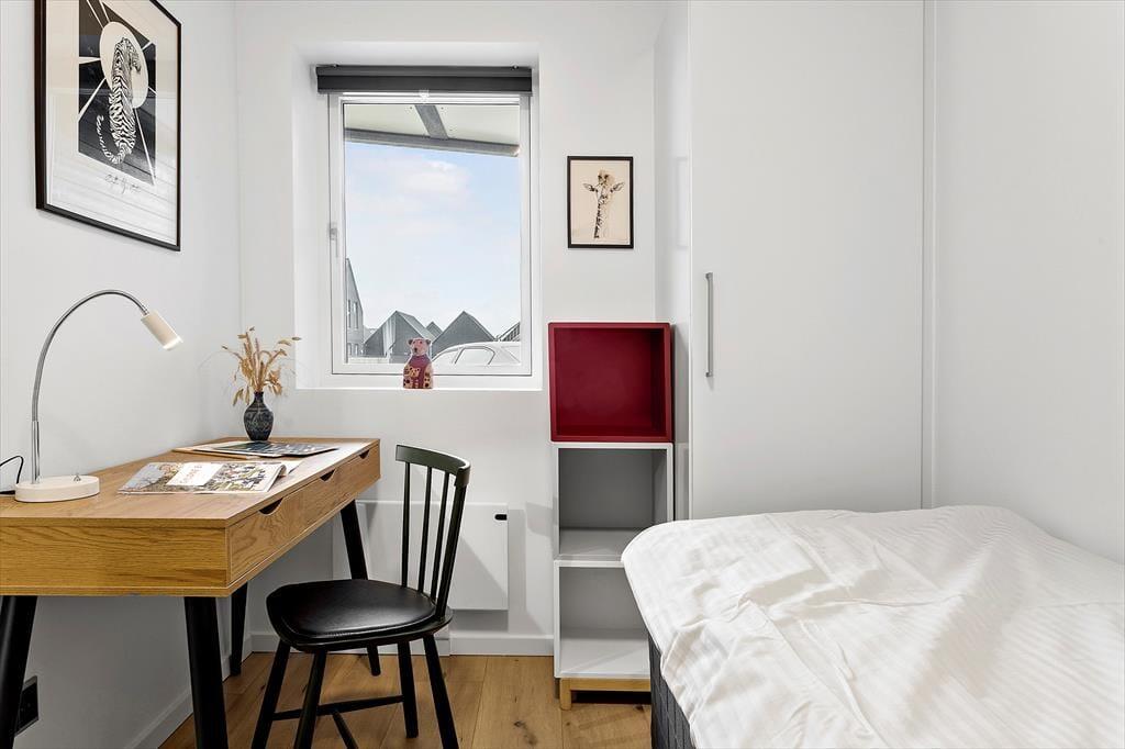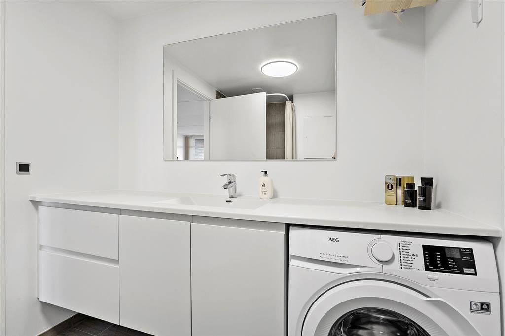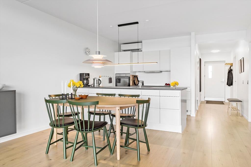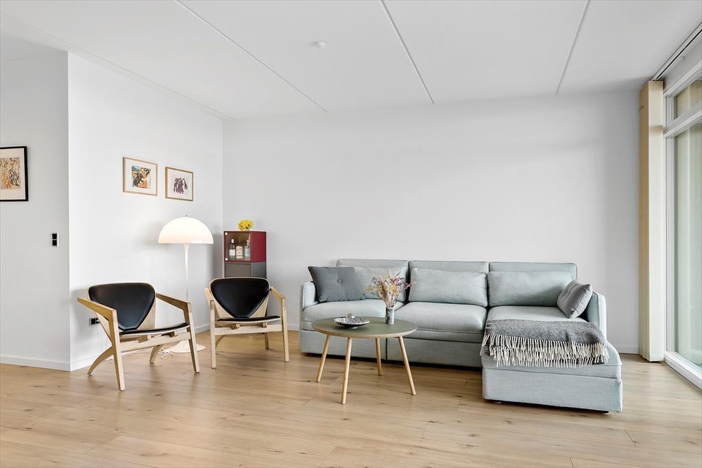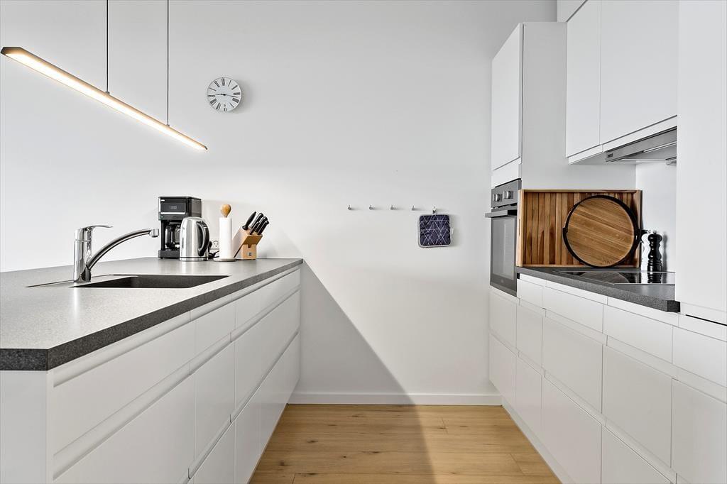 Træd ind i denne stilfulde og moderne lejlighed, hvor kvalitetsmaterialer og elegant design går hånd i hånd. Her vil du opleve en lys og indbydende atmosfære, hvor du straks føler dig hjemme. Det åbne køkken-alrum er hjertet i boligen, hvor du kan samles med familie og venner til hyggelige middage. Køkkenet er udstyret med moderne faciliteter, der gør madlavning til en leg. Stuen er et perfekt sted at slappe af, med store vinduer der lader dagslyset strømme ind og giver en fantastisk udsigt over havet. Om aftenen kan du nyde en god film eller blot sidde og lytte til bølgernes beroligende brusen.