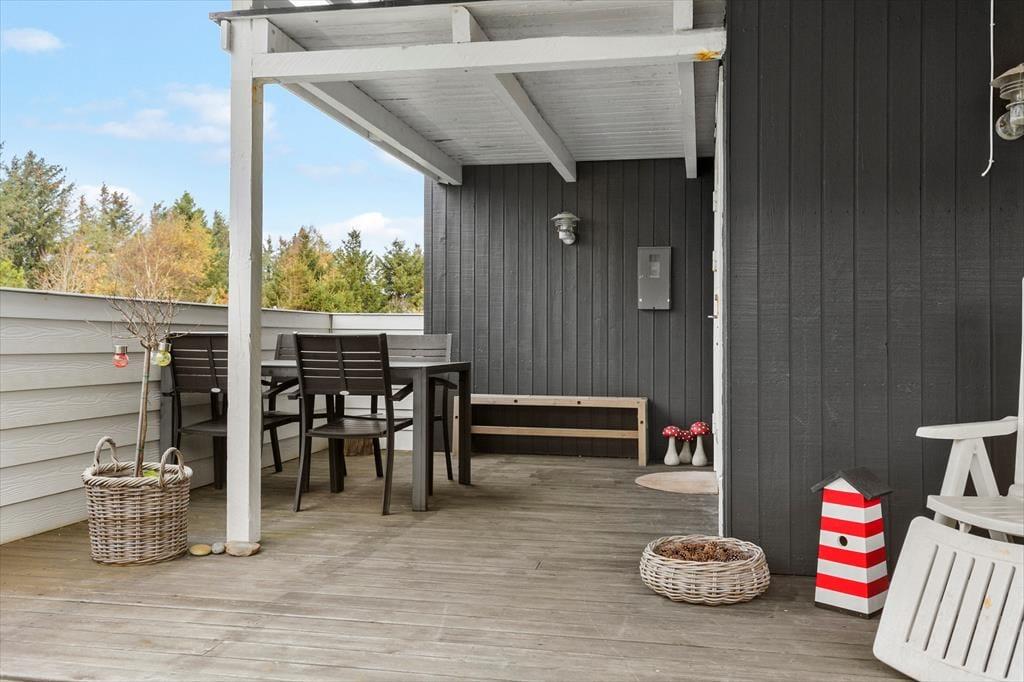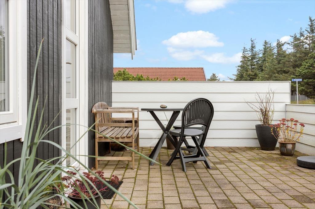 Dejlig terrasse, som er helt aflukket og delvist overdækket. Gode havemøbler, liggestole, grill og parasol. Kort gåafstand til læmolen, havbadet og det hyggelige miljø ved landingspladsen i Vorupør.