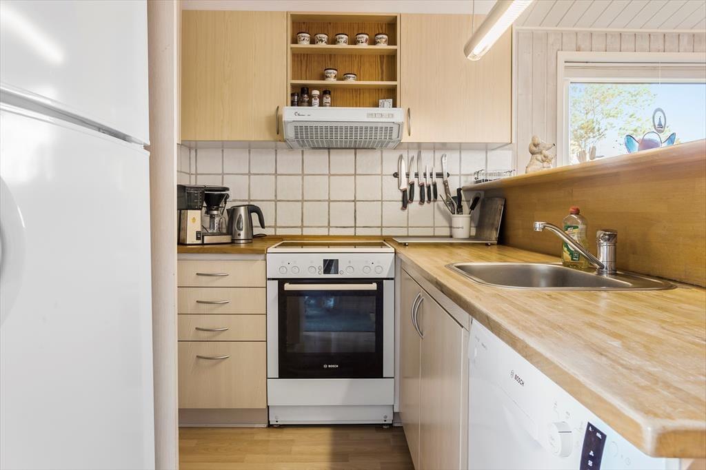 Træd indenfor og mærk den varme og indbydende atmosfære, der kendetegner sommerhuset. Allerede ved indgangen fyldes du af en følelse af hjemlig tryghed, hvor den knitrende brændeovn bidrager til en intim og hyggelig stemning på kølige aftener. Den velindrettede stue byder på en charmerende kombination af moderne komfort og rustik stil, hvor de bløde farver og naturlige materialer understreger den afslappende atmosfære. Her er der plads nok til hele familien – op til fem personer – og den omhyggeligt udvalgte indretning sikrer, at både små og store kan finde deres egen krog til at drømme sig væk. Du kan næsten fornemme varmen fra ilden og høre den sagte brummen fra naturen udenfor, mens du nyder et godt måltid eller en hyggestund med en god bog.