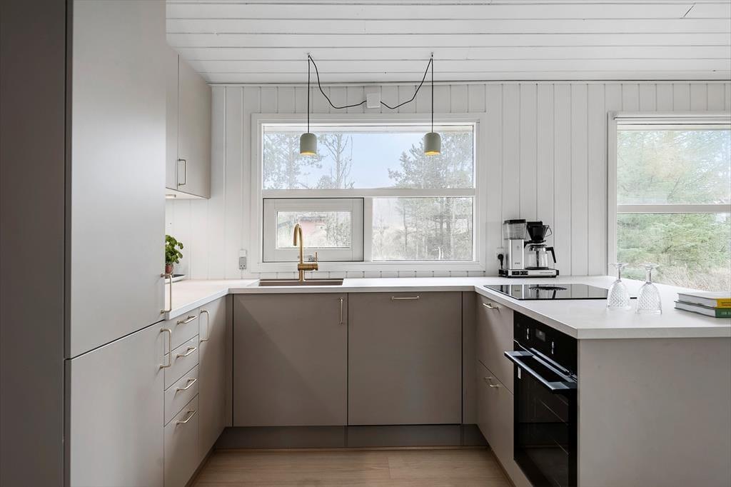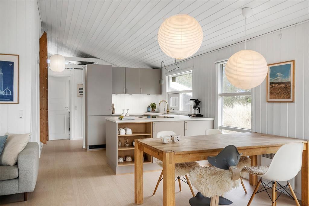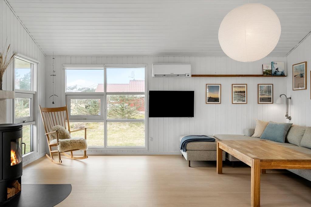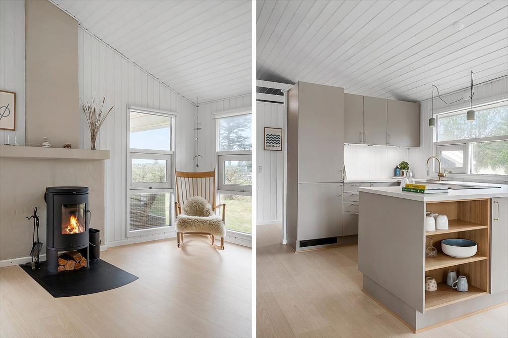 Når du træder ind i sommerhuset, bliver du mødt af en varm og indbydende atmosfære, der straks får dig til at føle dig hjemme. Den hyggelige stue med sin charmerende brændeovn skaber en beroligende ramme, hvor du kan nyde de stille aftener, mens ilden knitrer og spreder en blid varme. Her findes også en moderne sauna, der byder på en unik mulighed for velvære og afslapning – perfekt til at forynge krop og sind efter en dag fyldt med aktiviteter. Det indrettede interiør udstråler ægte sommerhuscharme med nøje udvalgte detaljer og en rolig farvepalette, som vækker minder om lange, solrige dage ved kysten. Stemningen er præget af en autentisk og rustik stil, der sammen med de nøje gennemtænkte materialevalg sikrer, at du oplever en ferie med en særlig personlig atmosfære.