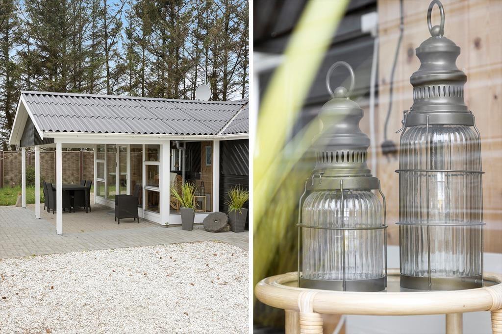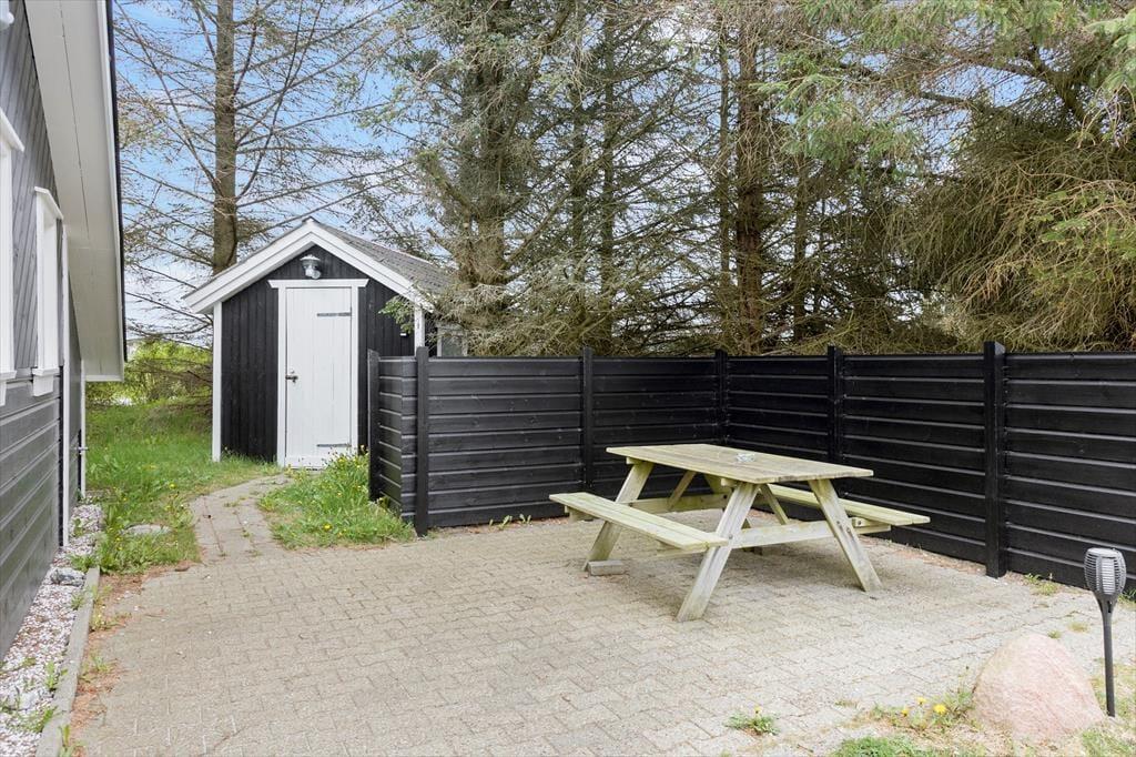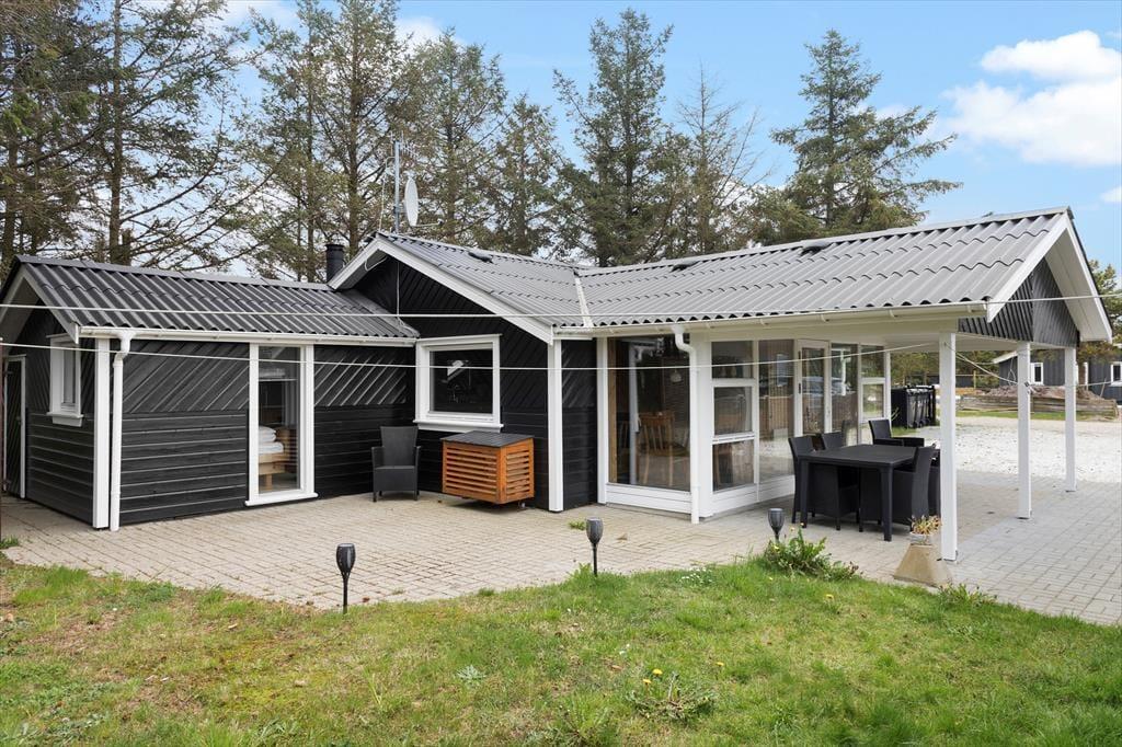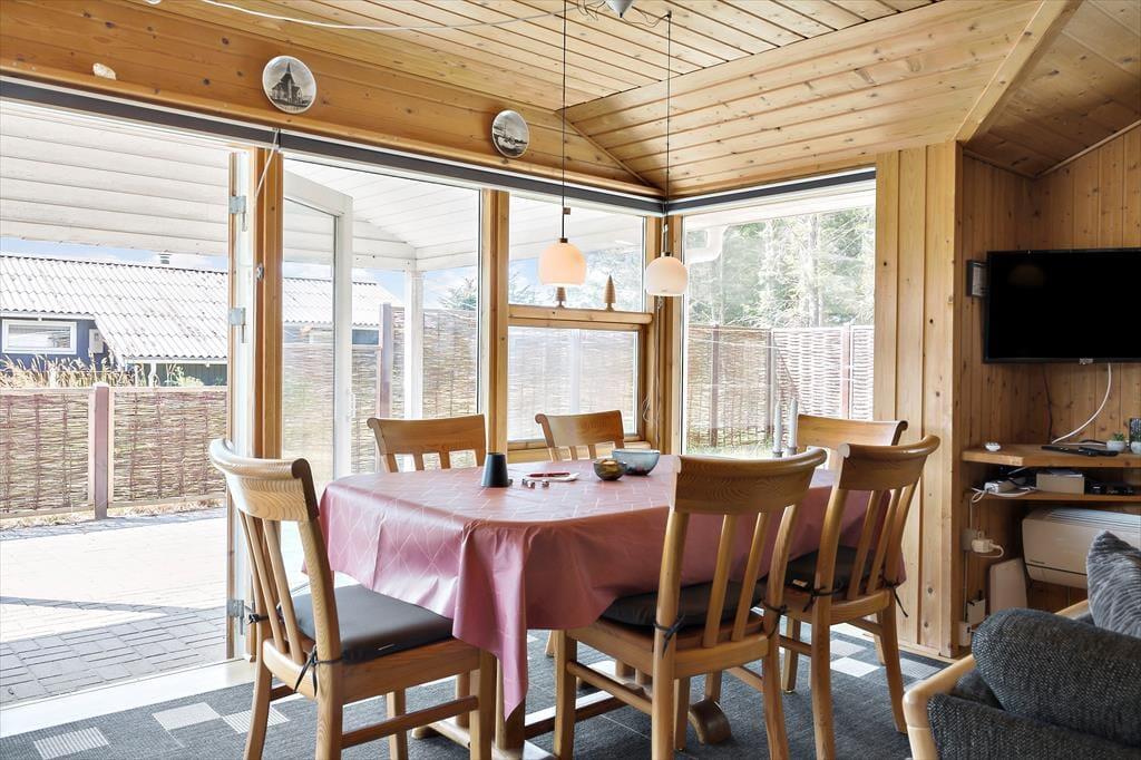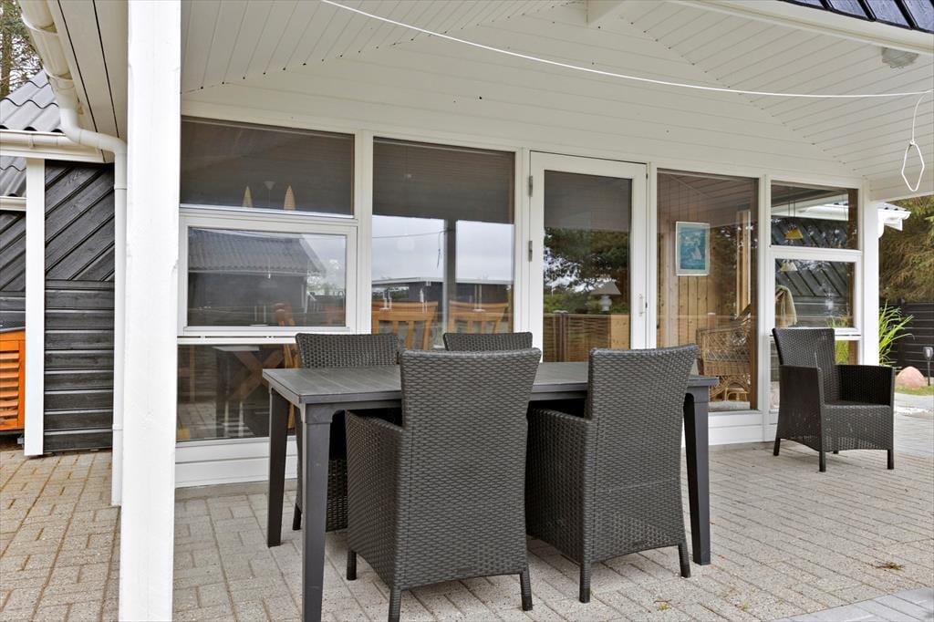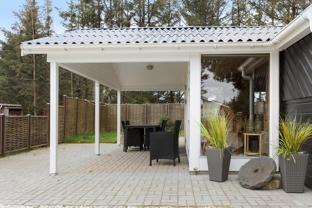 Udenfor venter en overdækket terrasse, som tilbyder det perfekte sted for udendørs hygge, uanset vejret. Her kan du starte dagen med en kop kaffe og lyden af fuglesang, eller slutte aftenen af med god grillmad og hyggeligt selskab. Terrassen og den omkringliggende have skaber ideelle rammer for afslapning, leg og samvær under åben himmel. Sommerhusets placering indbyder til at opleve naturen på tæt hold og nyde de lange lyse sommeraftener i fulde drag.