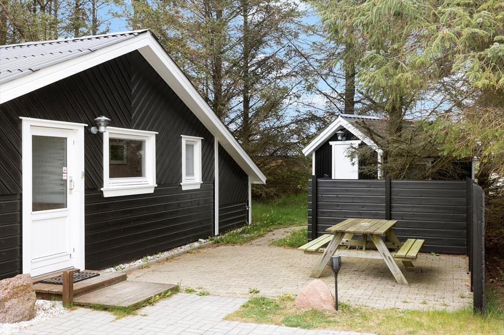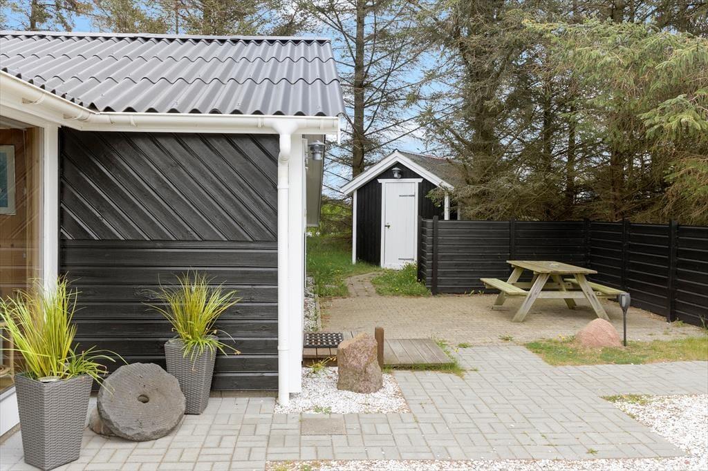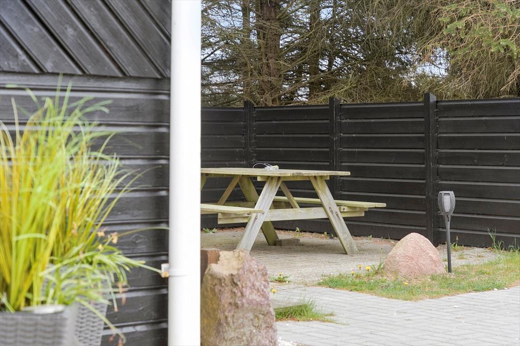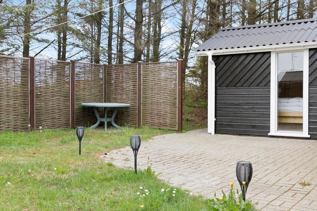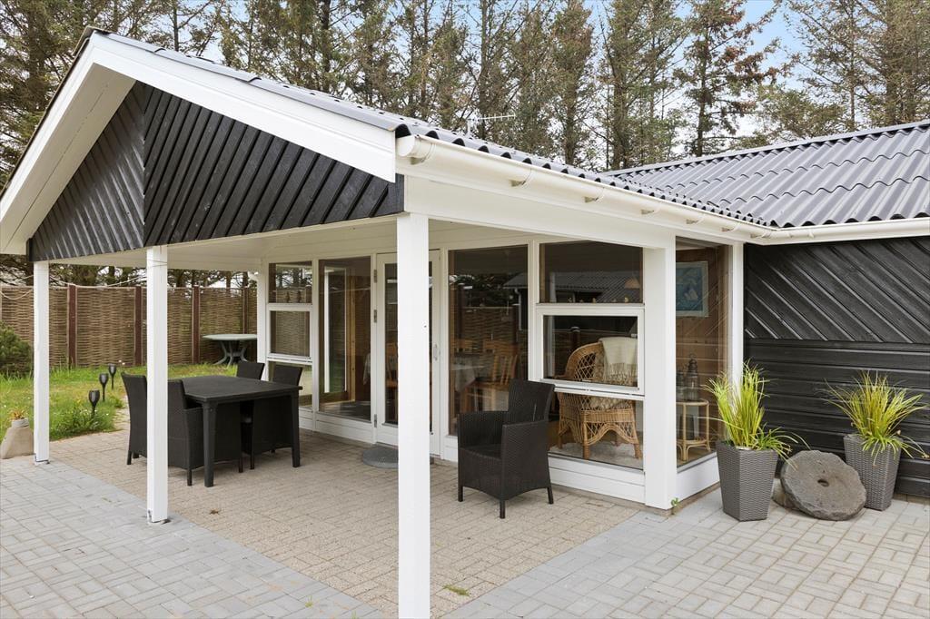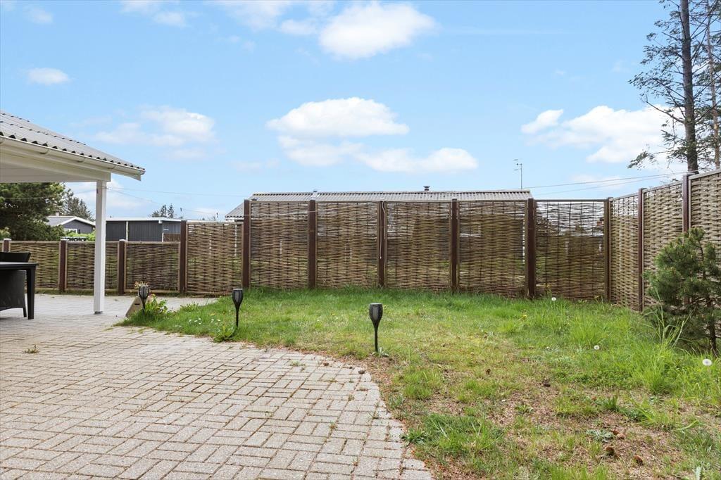Udenfor venter en overdækket terrasse, som tilbyder det perfekte sted for udendørs hygge, uanset vejret. Her kan du starte dagen med en kop kaffe og lyden af fuglesang, eller slutte aftenen af med god grillmad og hyggeligt selskab. Terrassen og den omkringliggende have skaber ideelle rammer for afslapning, leg og samvær under åben himmel. Sommerhusets placering indbyder til at opleve naturen på tæt hold og nyde de lange lyse sommeraftener i fulde drag.