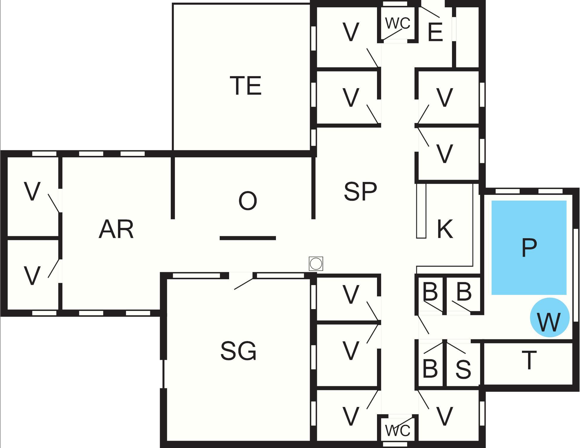 10 Soveværelser: (1DS)+(1DS)+(1DS)+(1DS)+(1DS)+(1DS)+(1DS)+(1DS)+(2K+1DO)+(2K+1DO), barneseng