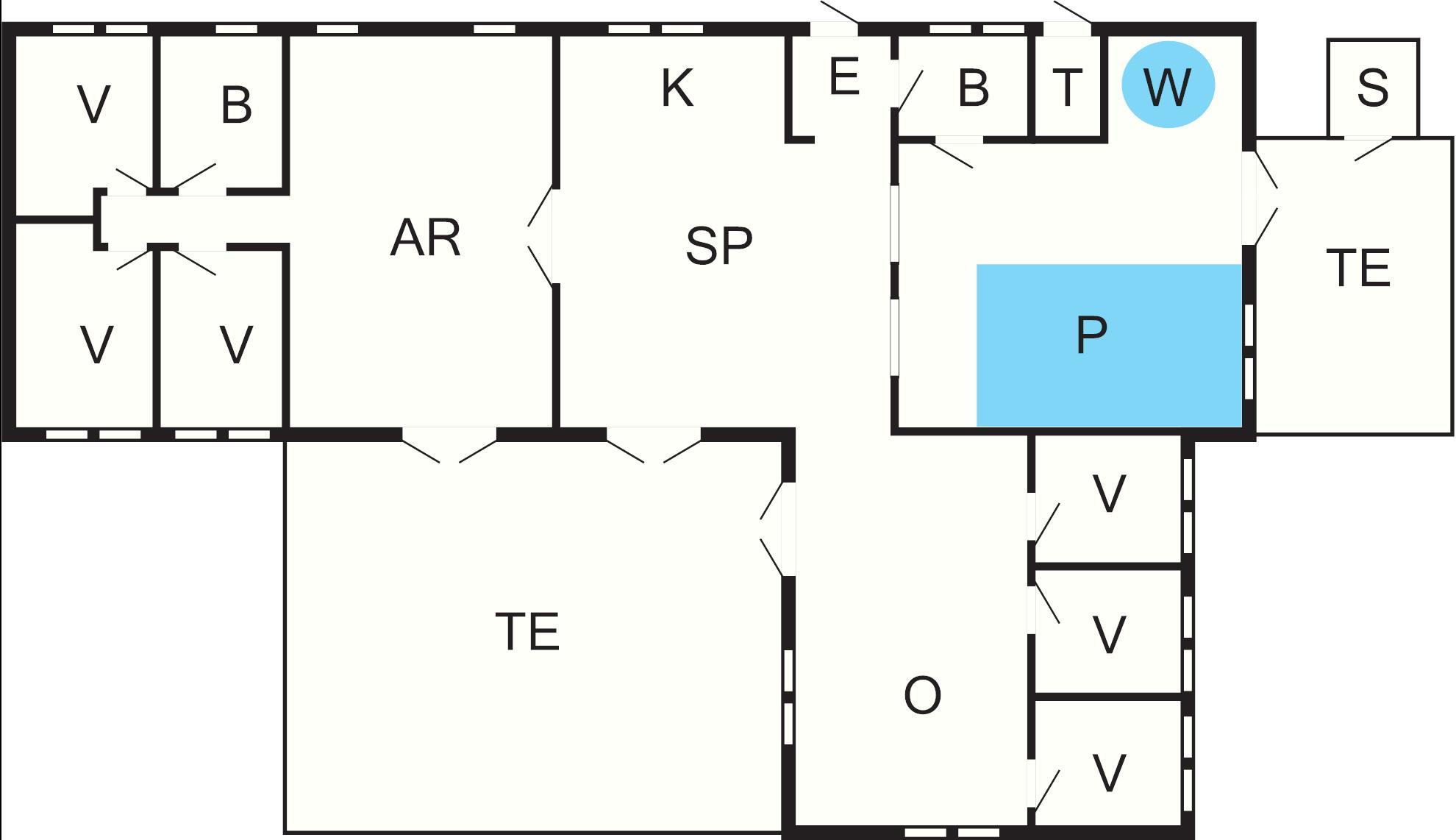 På den ene side af dette findes aktivitetsrummet med billard og bordfodbold, badeværelse og 3 af husets soveværelser. I den anden ende har I poolen og husets anden afdeling med opholdsrum og de andre 3 soveværelser.