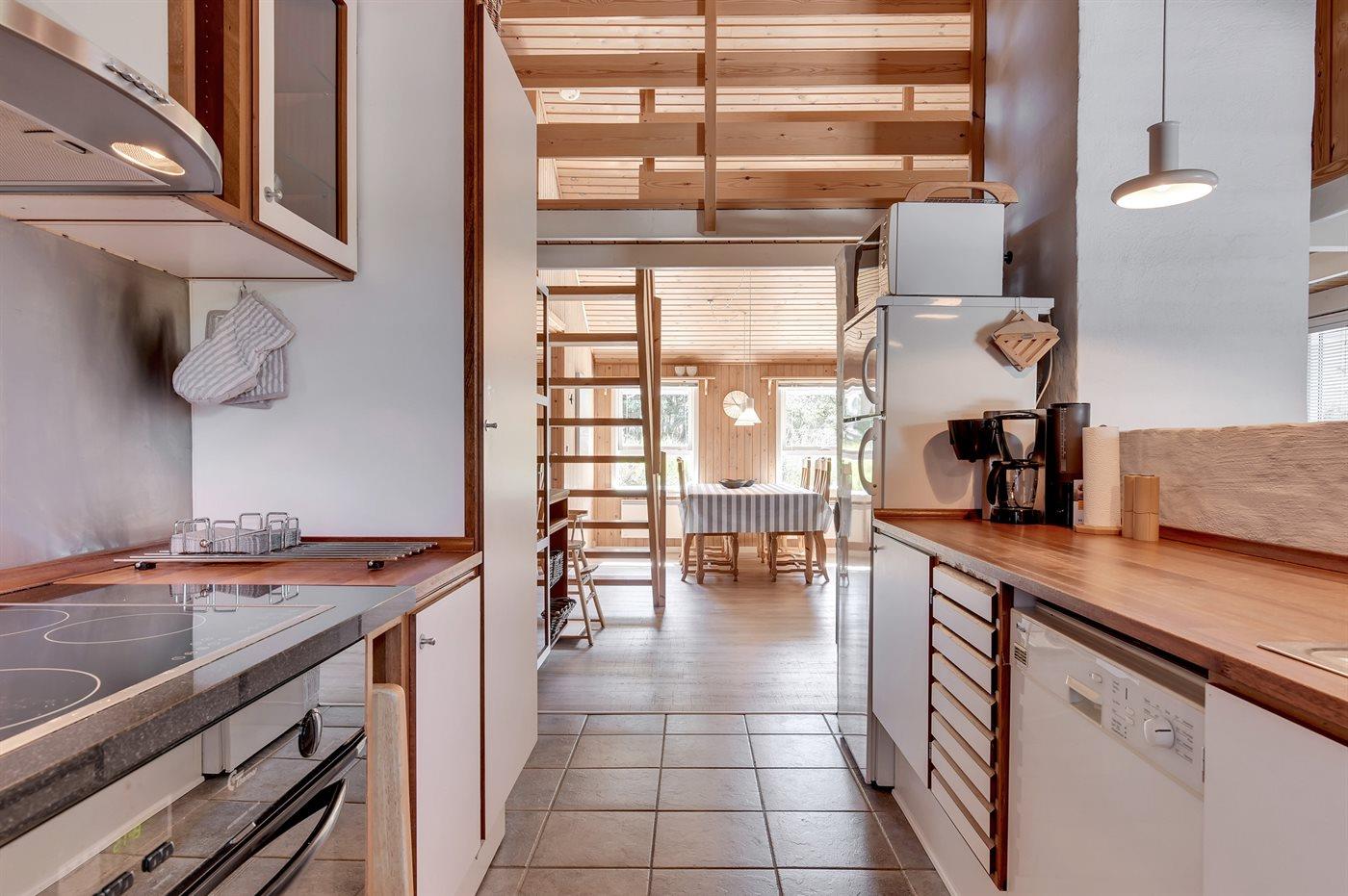 Køkkenet er udstyret med 1 køleskab. Der er 4 elkogeplader, bageovn, mikrobølgeovn samt opvaskemaskine.