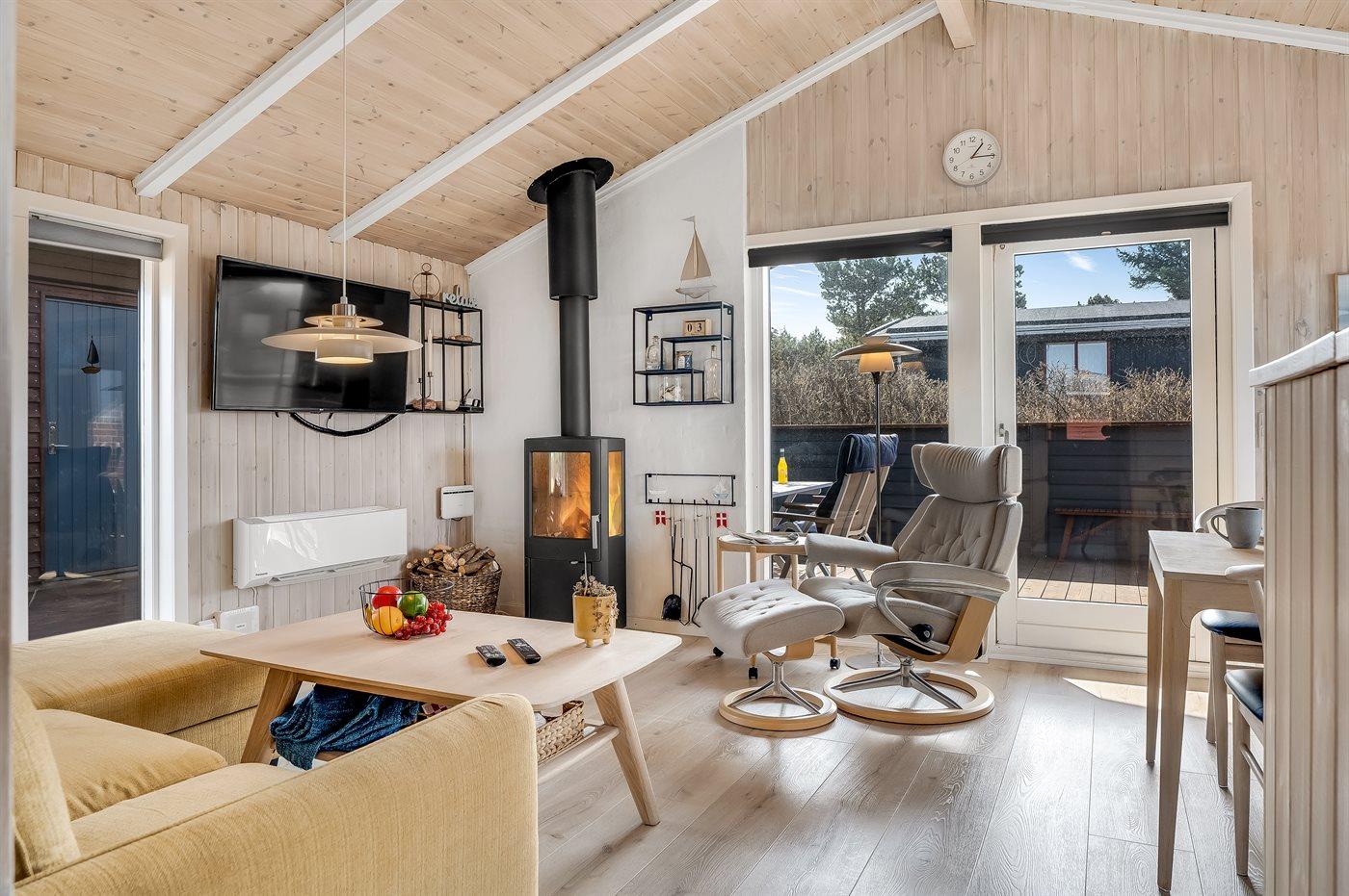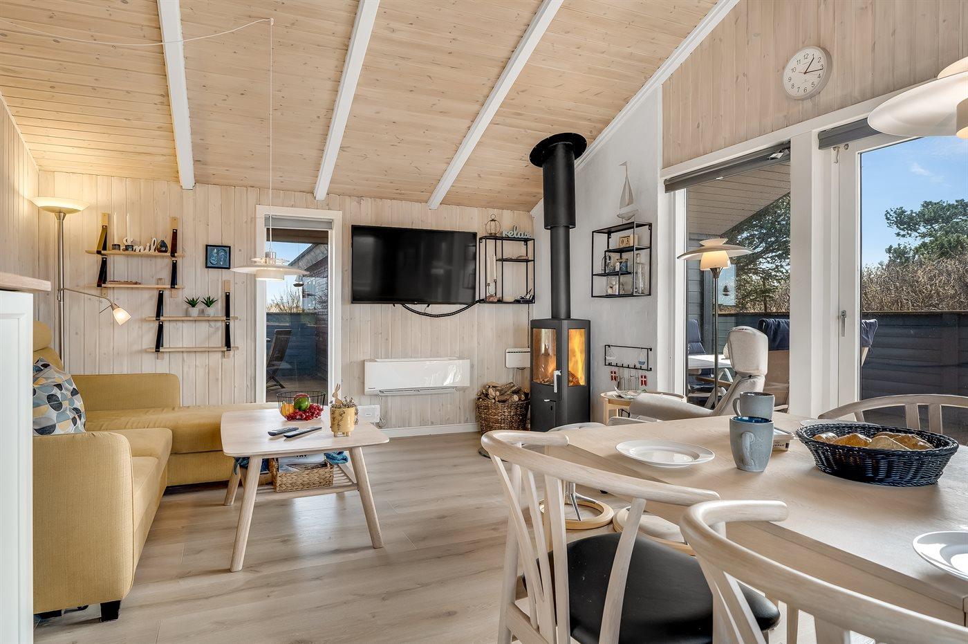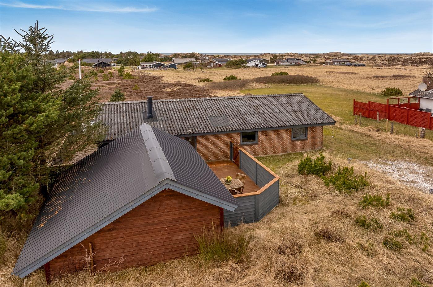 Charmerende sommerhus i Vorupør med store terrasser og brændeovn nær Vesterhavet.