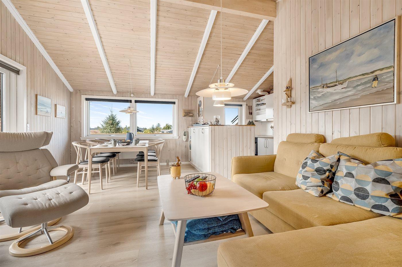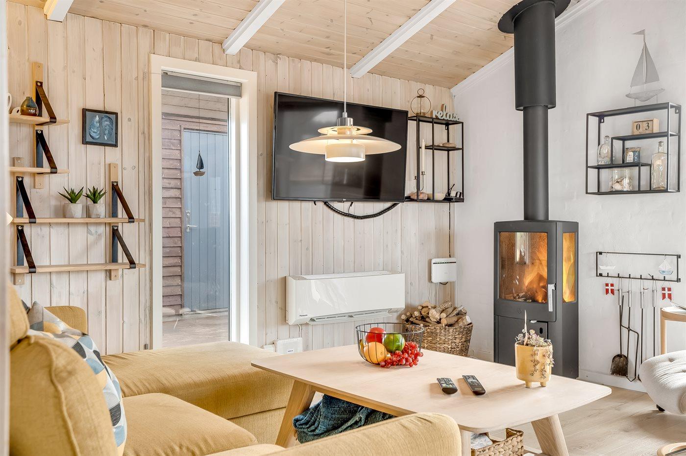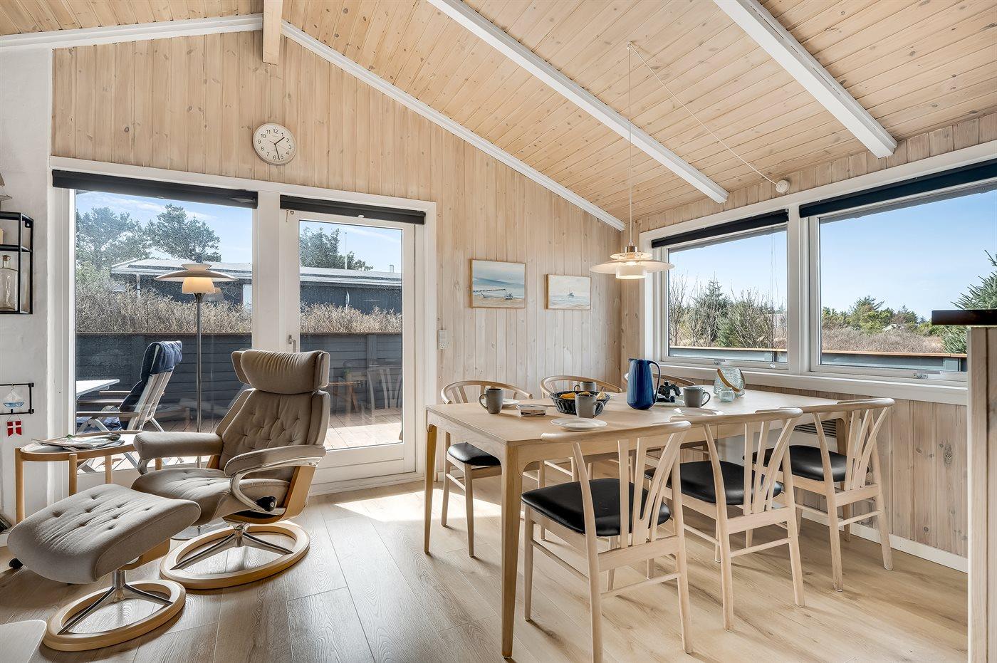Charmerende sommerhus i Vorupør med store terrasser og brændeovn nær Vesterhavet.