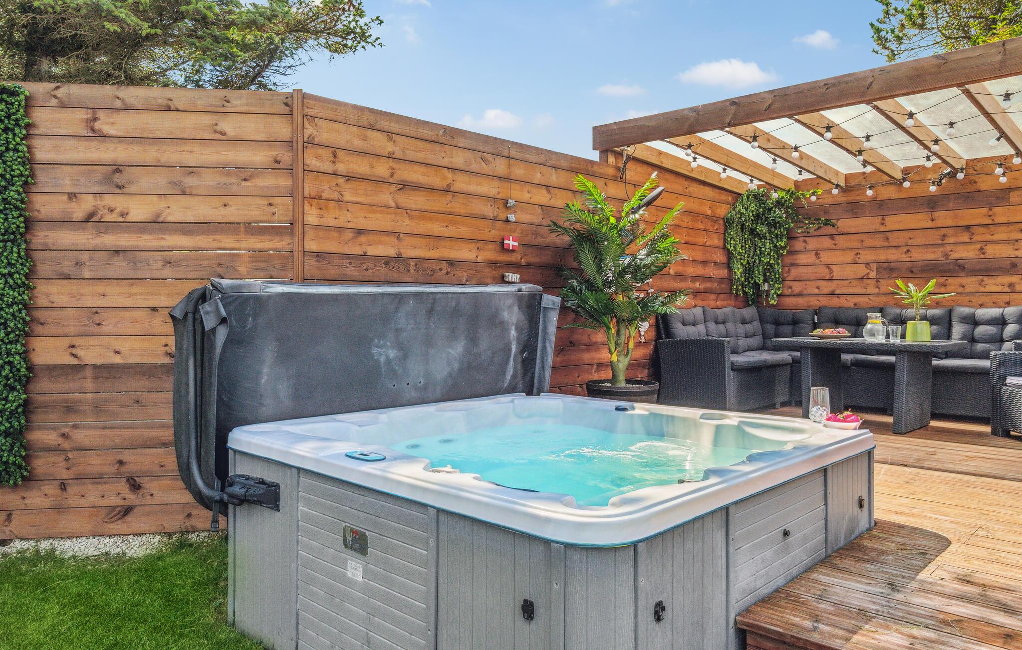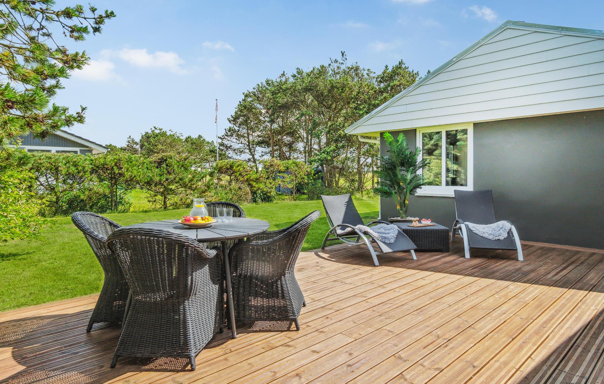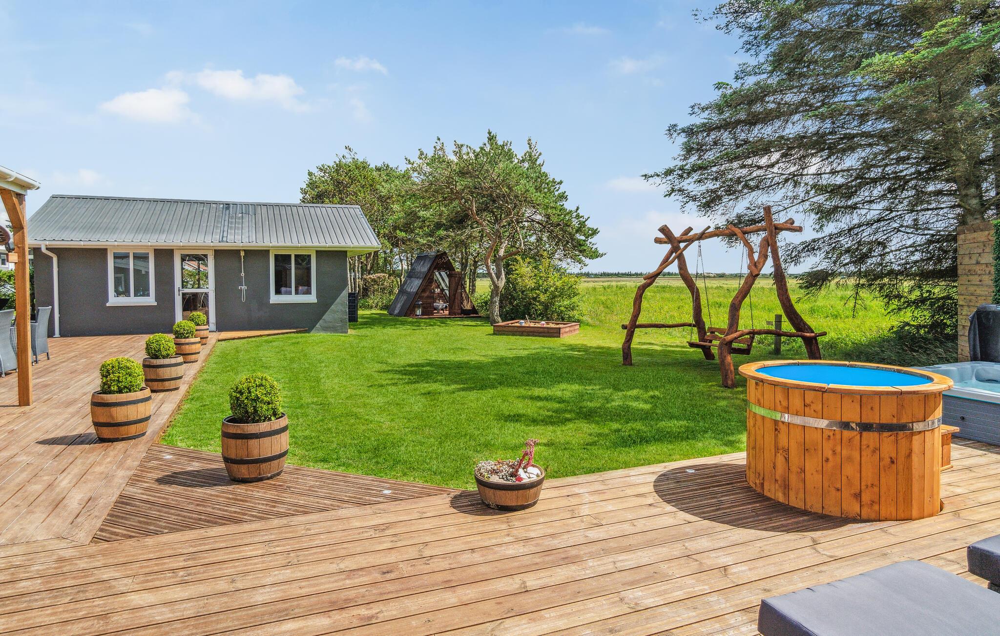 Rummeligt og moderne feriehus nær Vesterhavet med sauna, whirlpool og stor have for afslapning i naturskønne omgivelser.