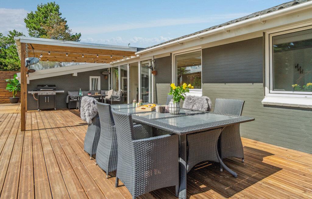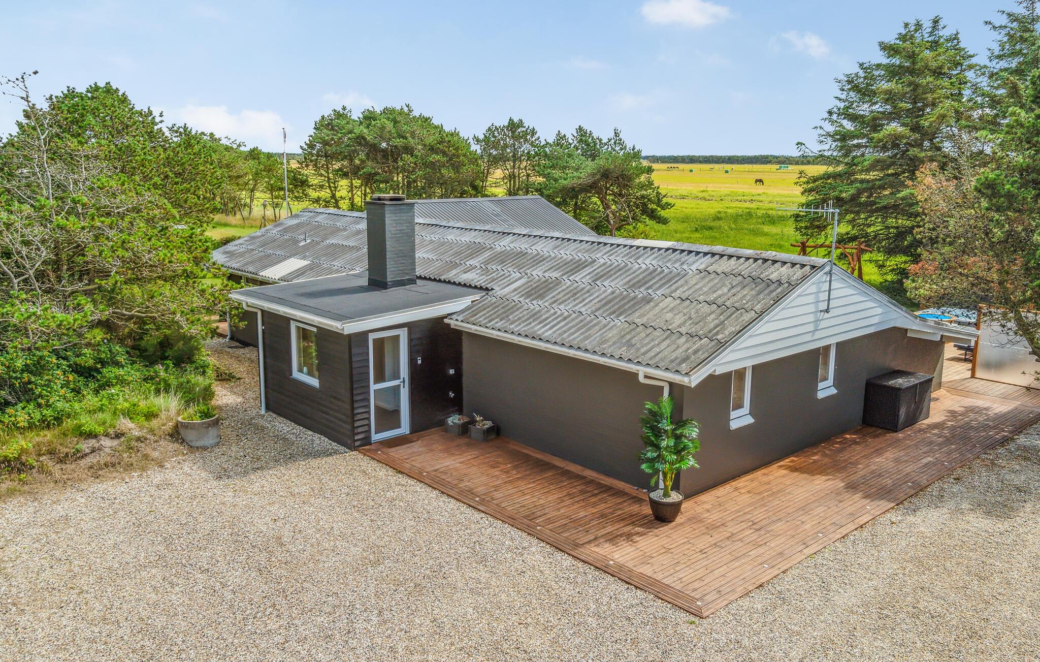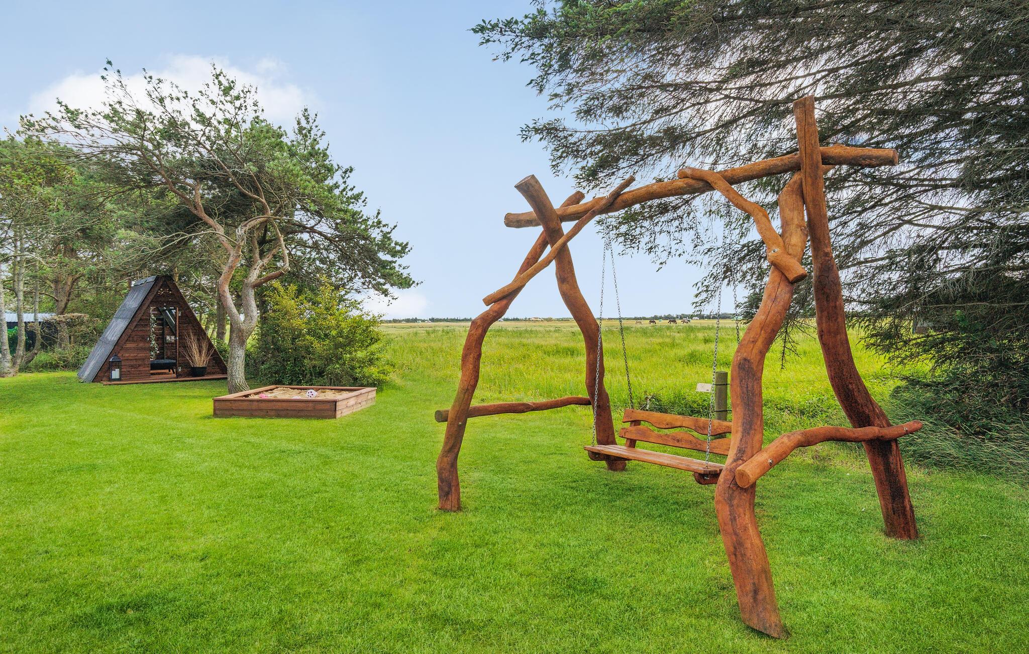 Glæd jer til en dejlig ferie i dette rummelige feriehus med et unikt udemiljø, hvor I tilmed er tæt på Vesterhavet og områdets skønne kystbyer.