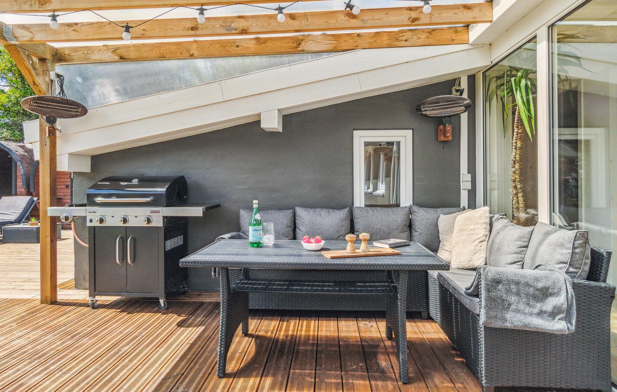 Det kæmpestore udendørsområde inviterer til mange skønne timer under åben himmel. Slap af på den delvist overdækkede terrasse, spis lækre retter fra grillen, mens børnene boltrer sig i haven, og hvis luften er lidt frisk, kan I tænde for terrassevarmeren.
