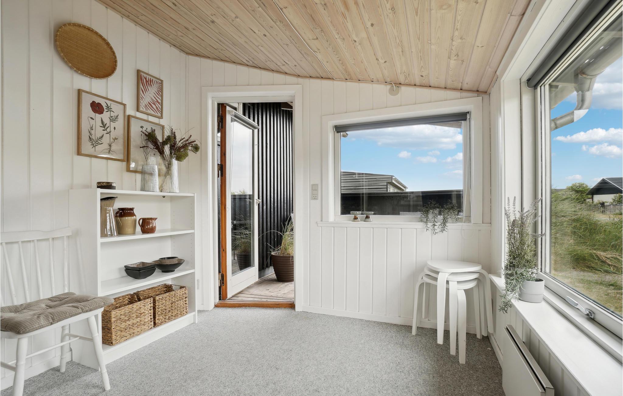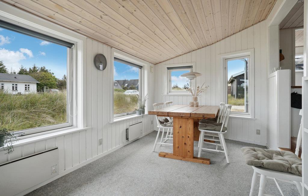 I charmerende Vorupør finder I dette attraktive sommerhus. Huset er pænt og minimalistisk indrettet i en lys farveskala. Stuen bliver rammen om dagens hyggelige måltider og afslapning i sofaen efter en lang dag ude i den friske, vestjyske luft. I årets kolde måneder er det ekstra hyggeligt med varmen fra brændeovnen.