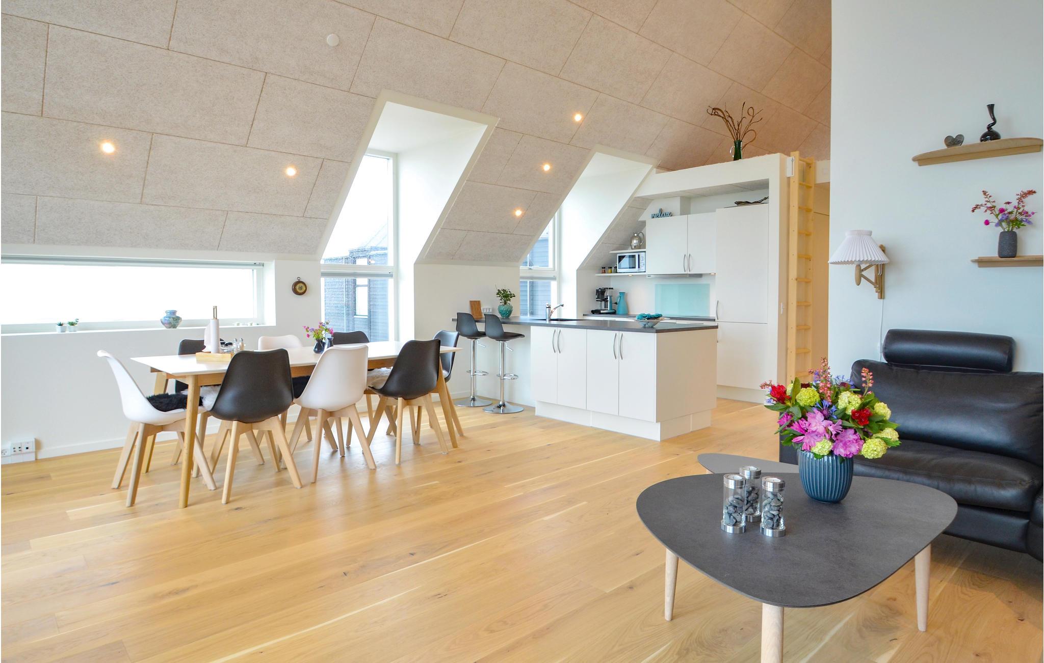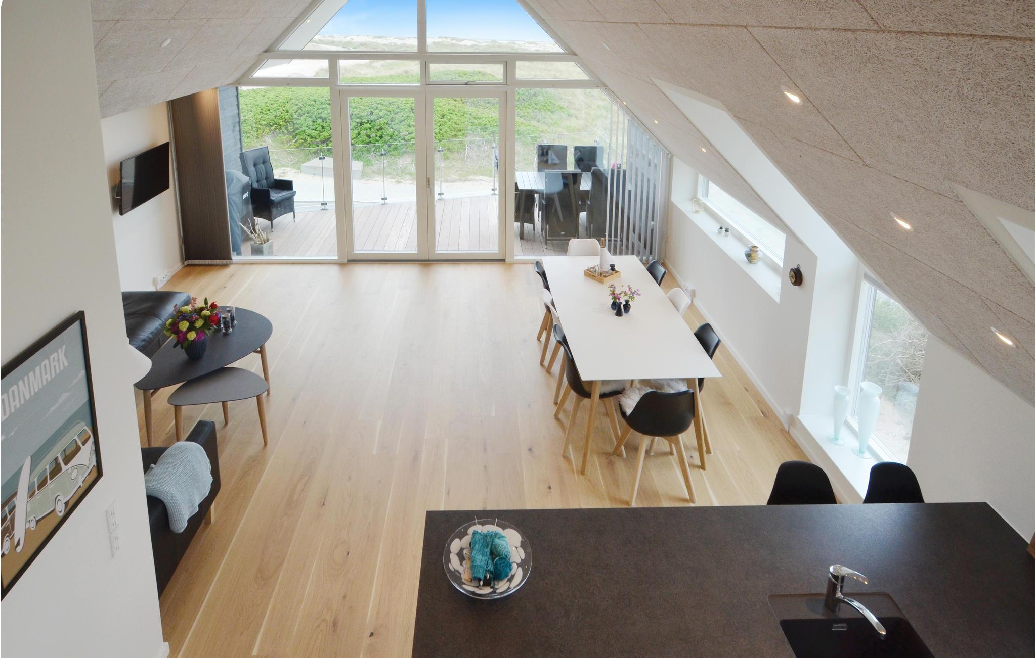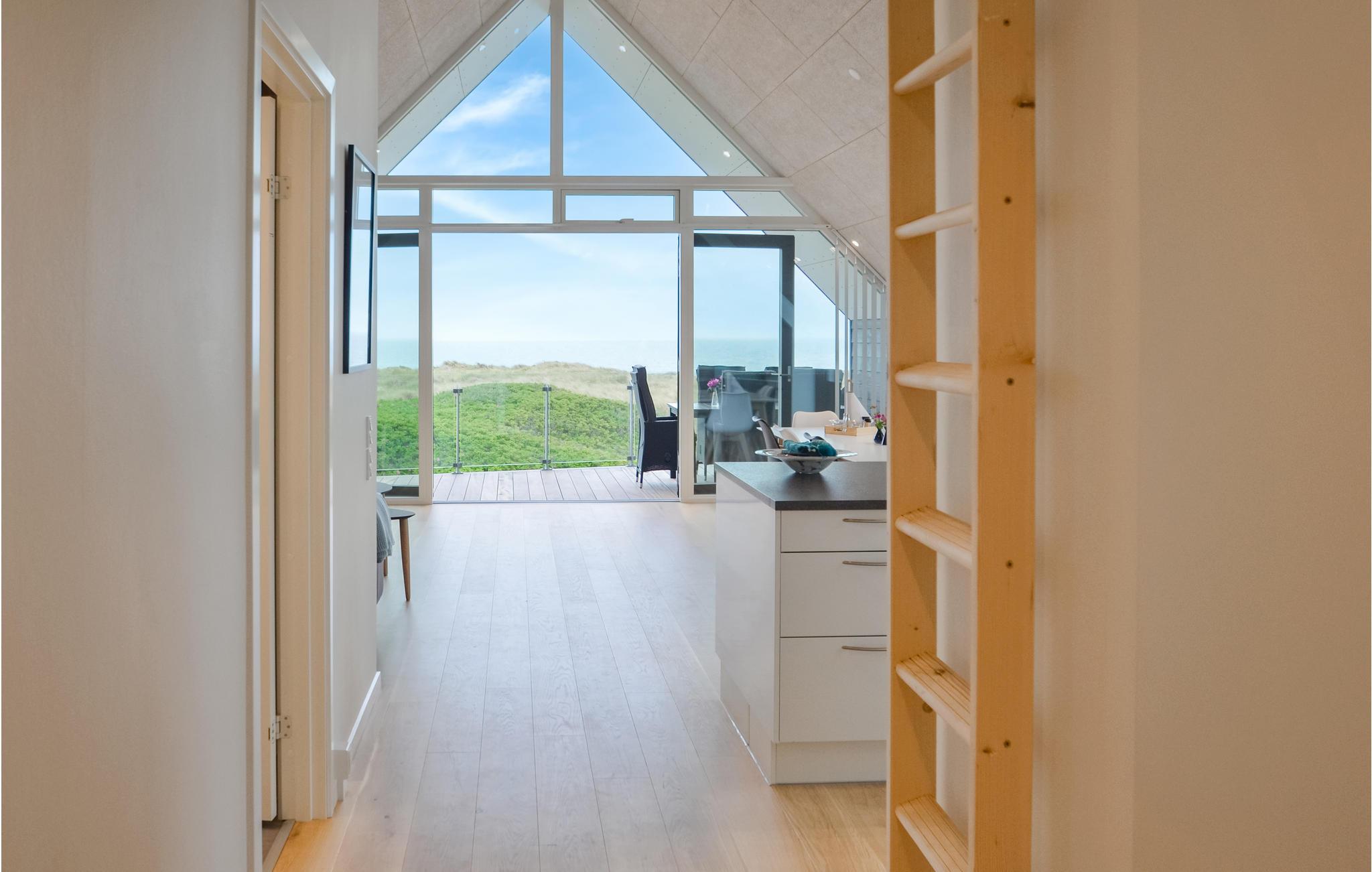 Her er ferielejligheden for jer, som absolut ikke vil gå på kompromis med hverken kvalitet eller beliggenhed. Med 180 graders panorama udover Vesterhavet får I næsten følelsen af at sidde ude i Vesterhavet. Lejligheden er indrettet i meget høj kvalitet med en god rumfornemmelse, lys og venlig indretning og med loft til kip. Overalt i lejligheden har I udsigten - forestil jer f.eks. at ligge i den store dobbeltseng og se den næsten maleriske udsigt over havet. Så er I til Vesterhav, så er det lige her I skal bo. Vorupør er et lille hyggeligt fiskerleje med en masse små butikker og masser af turistliv, dog med respekt for naturen.