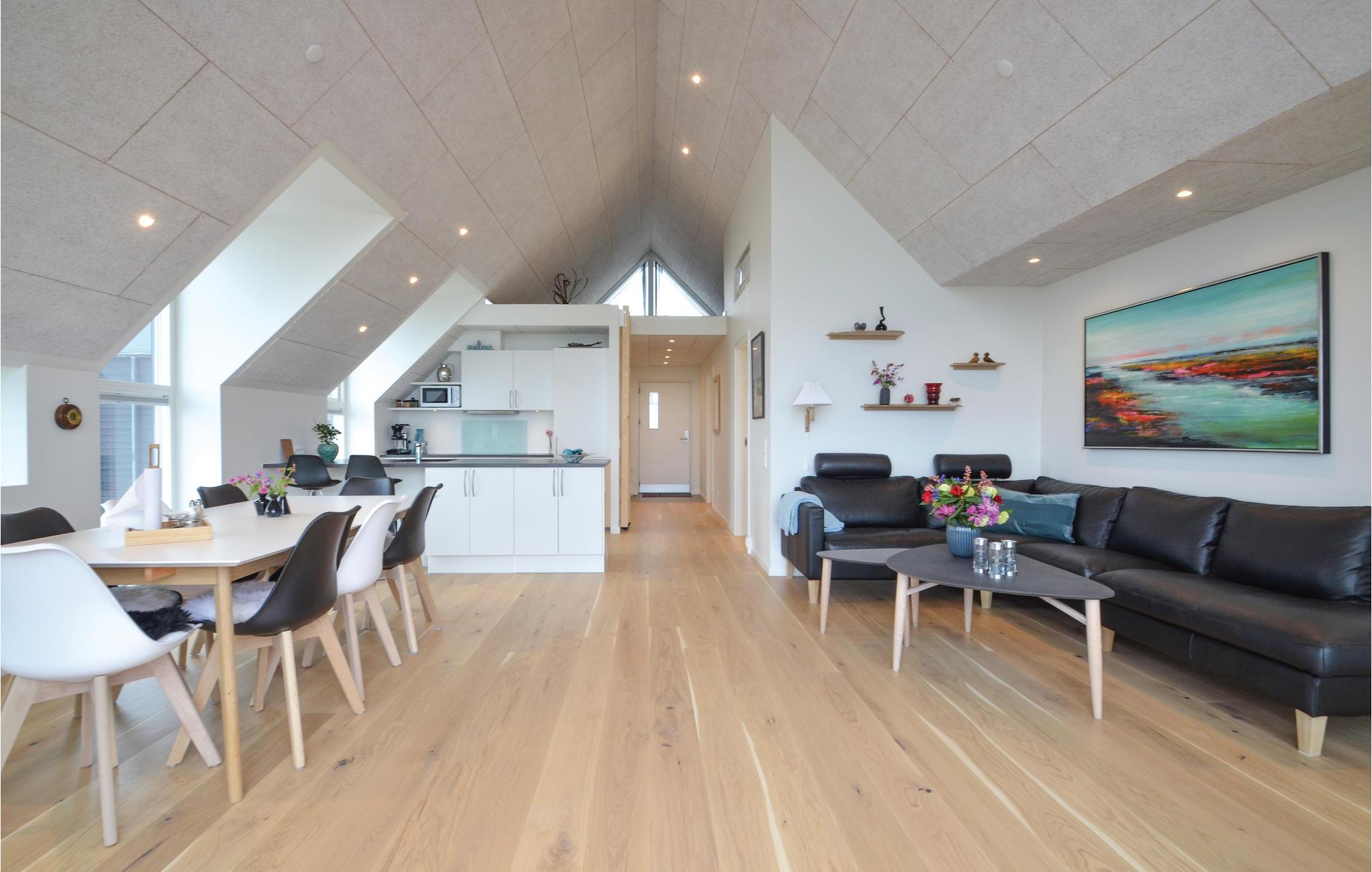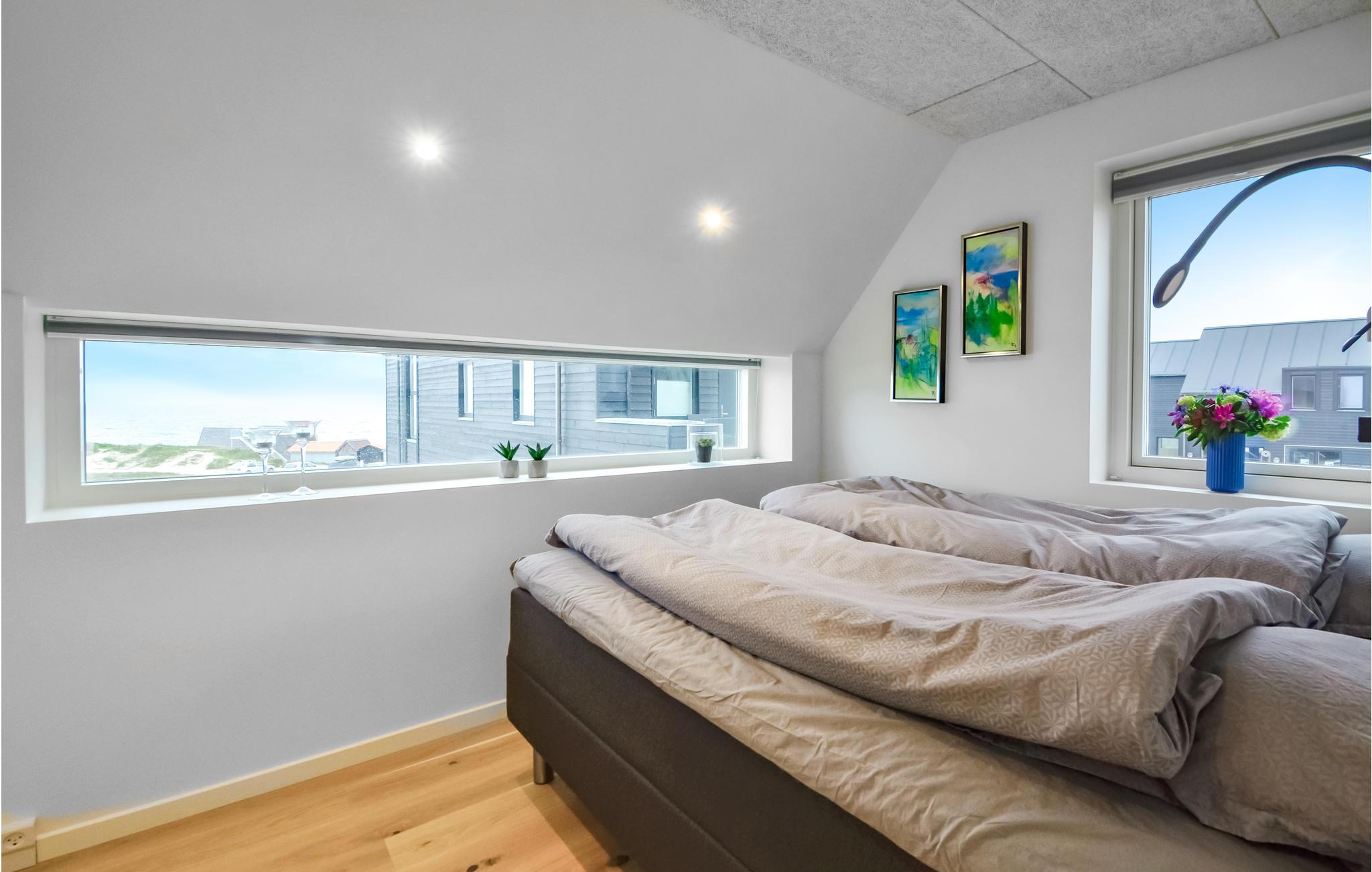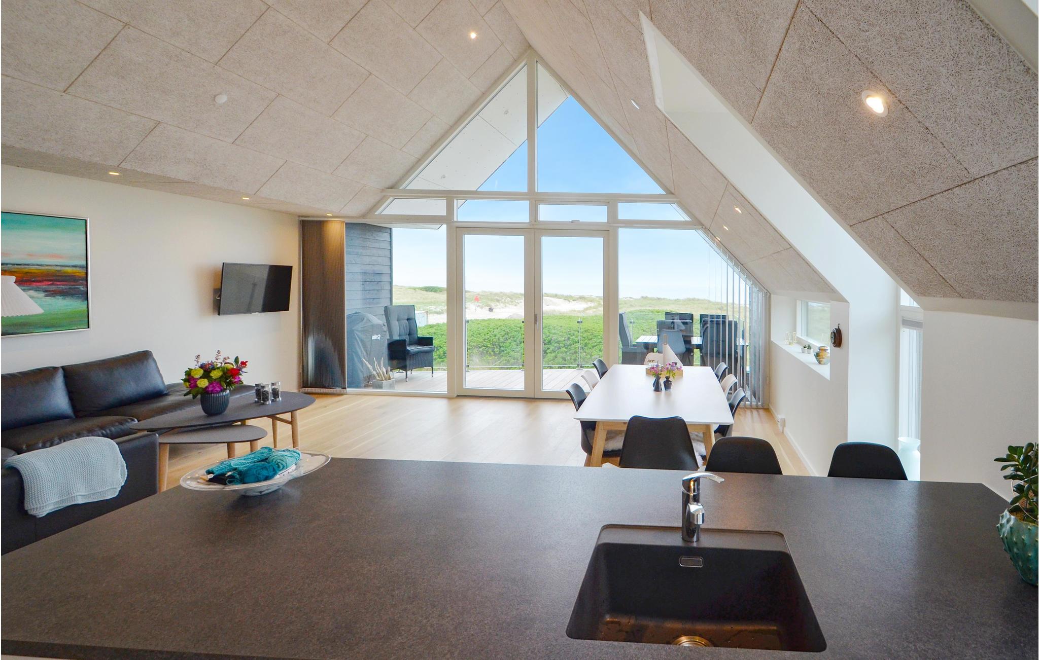 Her er ferielejligheden for jer, som absolut ikke vil gå på kompromis med hverken kvalitet eller beliggenhed. Med 180 graders panorama udover Vesterhavet får I næsten følelsen af at sidde ude i Vesterhavet. Lejligheden er indrettet i meget høj kvalitet med en god rumfornemmelse, lys og venlig indretning og med loft til kip. Overalt i lejligheden har I udsigten - forestil jer f.eks. at ligge i den store dobbeltseng og se den næsten maleriske udsigt over havet. Så er I til Vesterhav, så er det lige her I skal bo. Vorupør er et lille hyggeligt fiskerleje med en masse små butikker og masser af turistliv, dog med respekt for naturen.