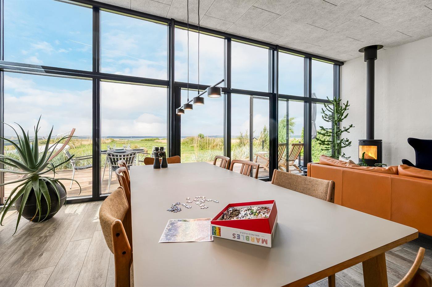 Indenfor er stue og køkken samlet i ét åbent og lyst rum med store vinduespartier, så udsigten hele tiden er nærværende. Når det bliver køligt, spreder brændeovnen varme og ro, og huset er i det hele taget udstyret til at kunne bruges hele året, uden at det går ud over den enkle sommerhusstemning.