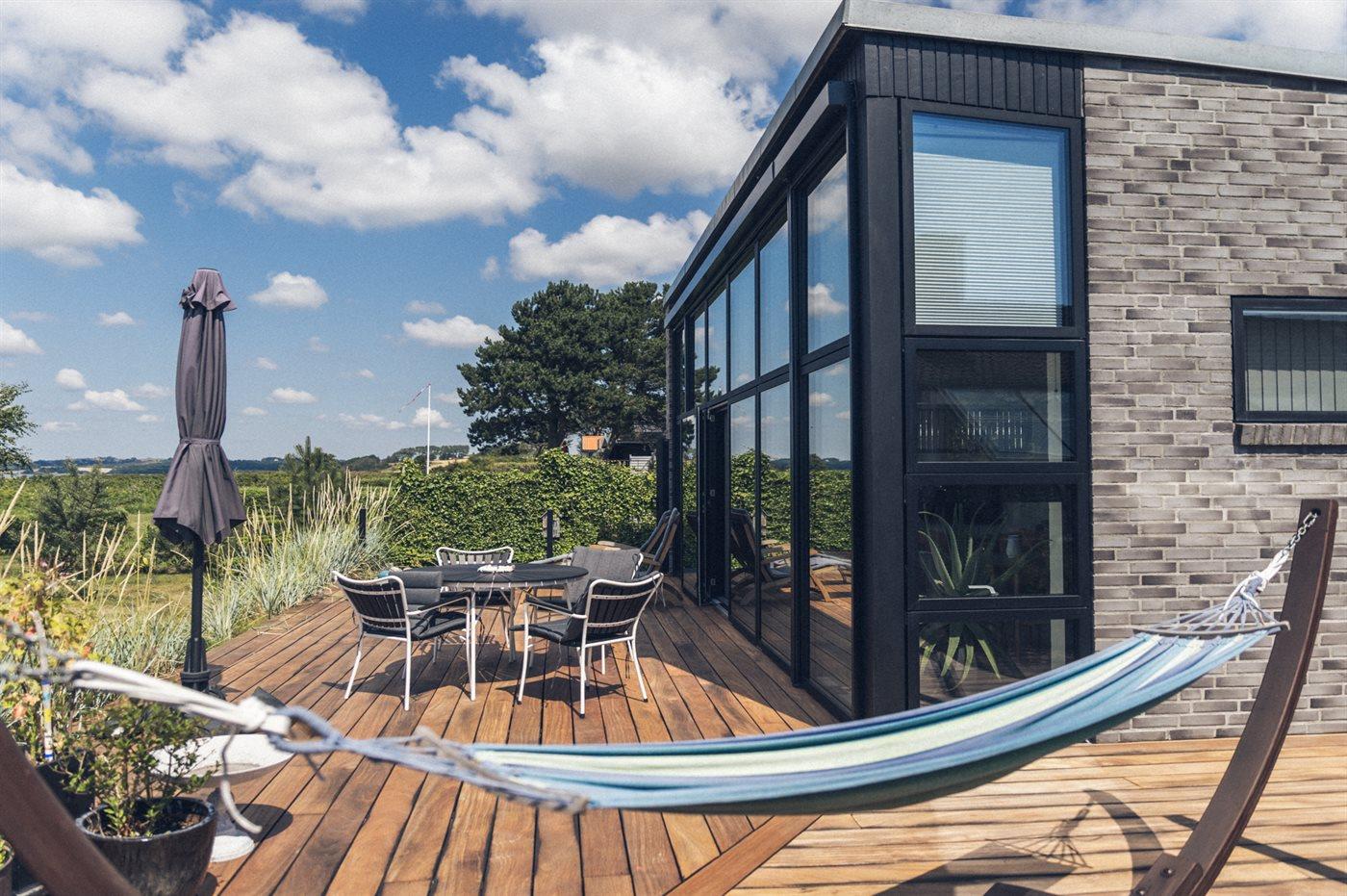 Nyt sommerhus i første række ved Århus Bugten med spa, stor terrasse og havudsigt.