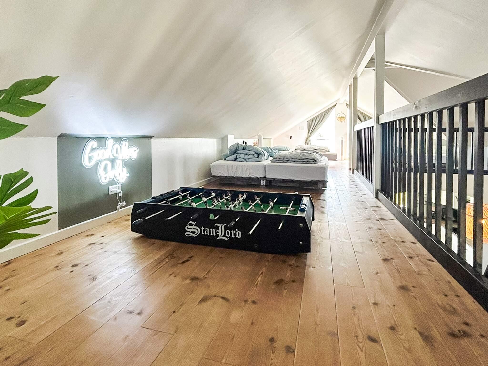 Sovepladserne fordeler sig på fem værelser med hver to enkeltsenge samt en stor hems på ca. 65 m² med seks sovepladser. Hemsens hyggerum er indrettet med PlayStation, smart-tv med streamingmuligheder, bordfodbold m.m. Derudover er der to enkeltsenge i husets anneks.