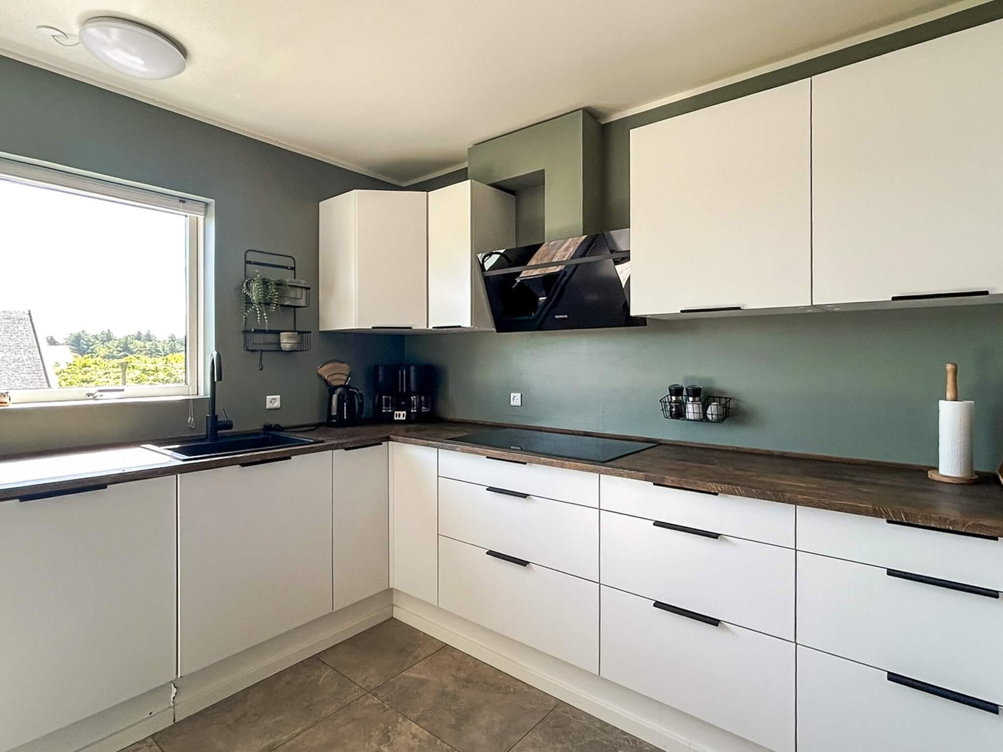 Det veludstyrede køkken ligger i åben forbindelse med stuen og er bl.a. indrettet med opvaskemaskine, mikroovn, induktionskogeplader, 2 varmluftovne samt stort køle-/fryseskab. Fra køkkenet er der udgang til en mindre terrasse, hvor morgensolen kan nydes.