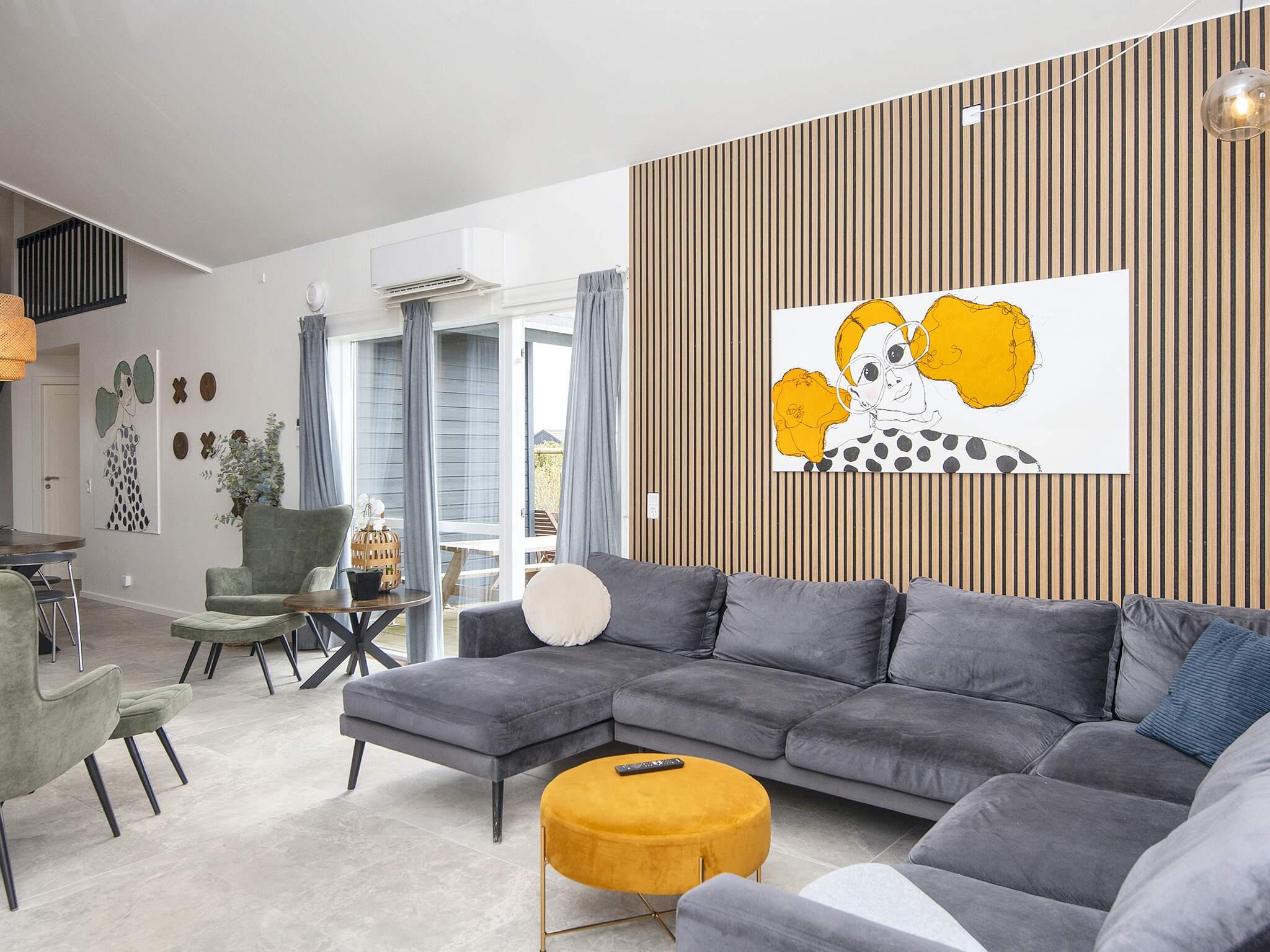 Fra entréen er der adgang til den store opholds- og spisestue med brændeovn, som skaber hygge på kølige sommeraftener eller regnfulde efterårsdage. Her er også smart-tv med både danske og tyske kanaler samt mulighed for at streame egne tv-tjenester.