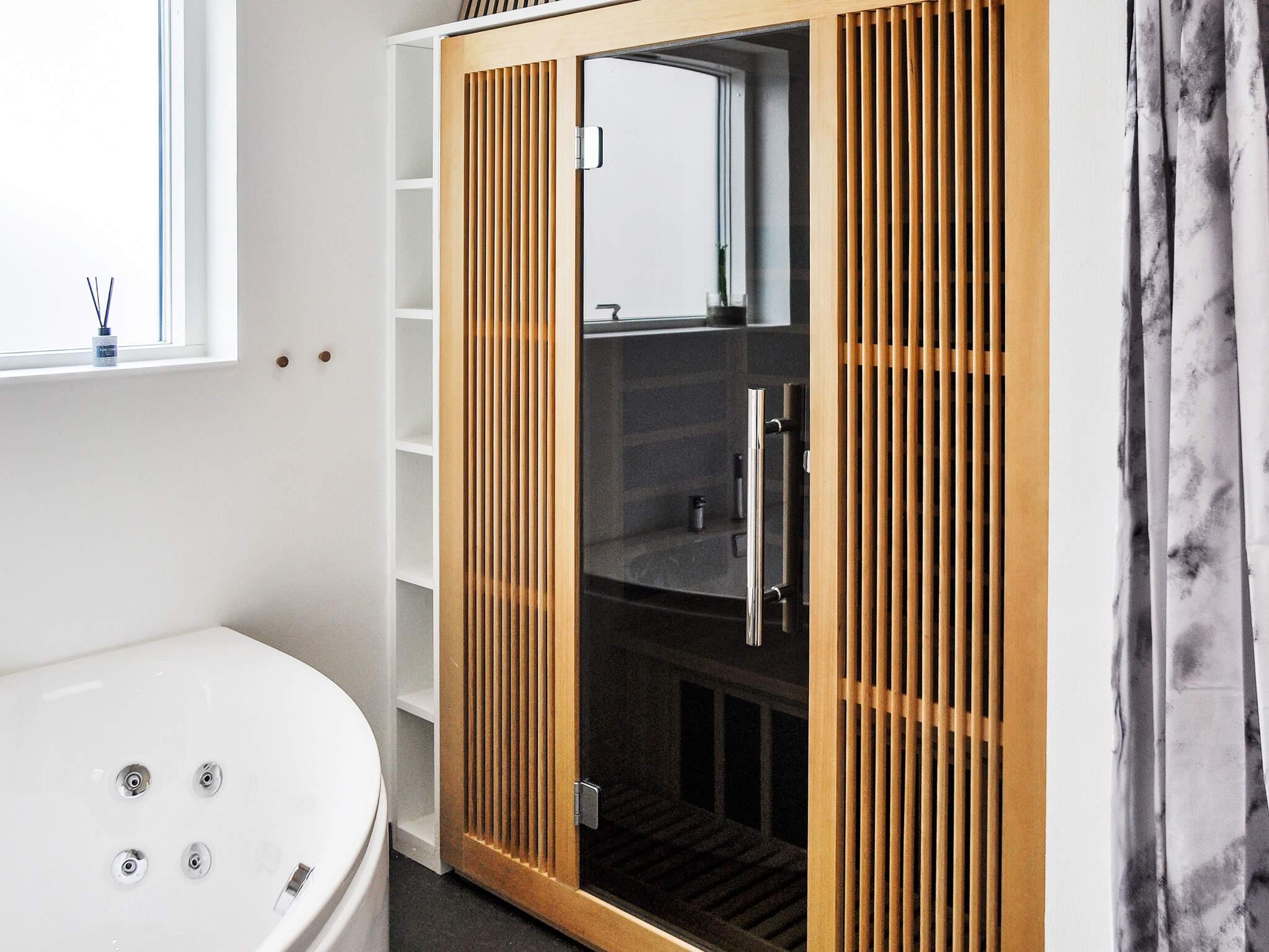Stort badeværelse i høj kvalitet med 2-personers spabad, bruseniche, adgang til husets 3-personers infrarød sauna samt gulvvarme. Derudover gæstebadeværelse med bademiljø, toilet samt gulvvarme.