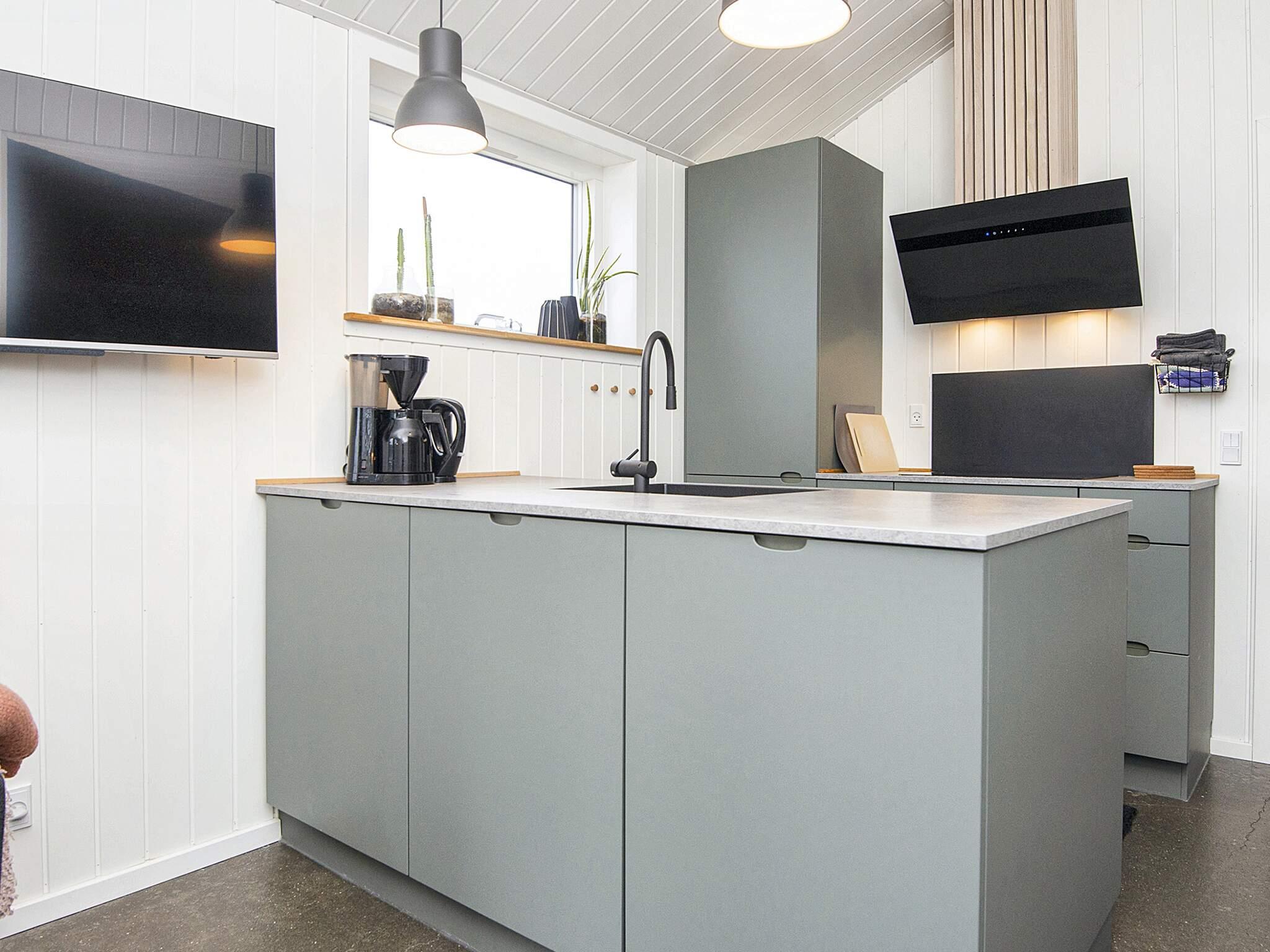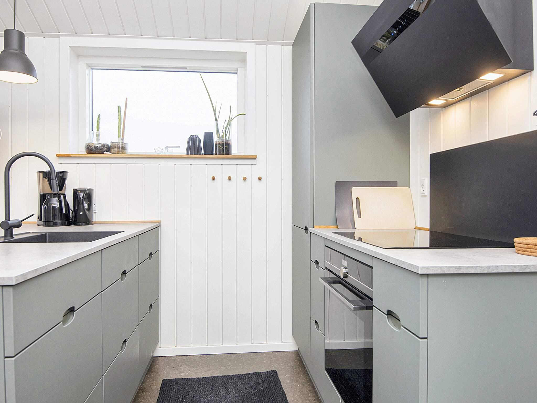 Køkkenet er i høj kvalitet blandt andet veludstyret med keramisk kogeplade, køle/frys, separat ovn med grill samt indbygget mikroovnsfunktion, emhætte, opvaskemaskine samt kaffemaskine. Køkken/alrum med stort spisebord samt direkte adgang til husets større terrasser med gode havemøbler, solvogne samt grill, hvor I kan nyde aftensmaden, mens solen går ned over Vesterhavet. Derudover er der gennemgående terrasser rundt om hele huset.