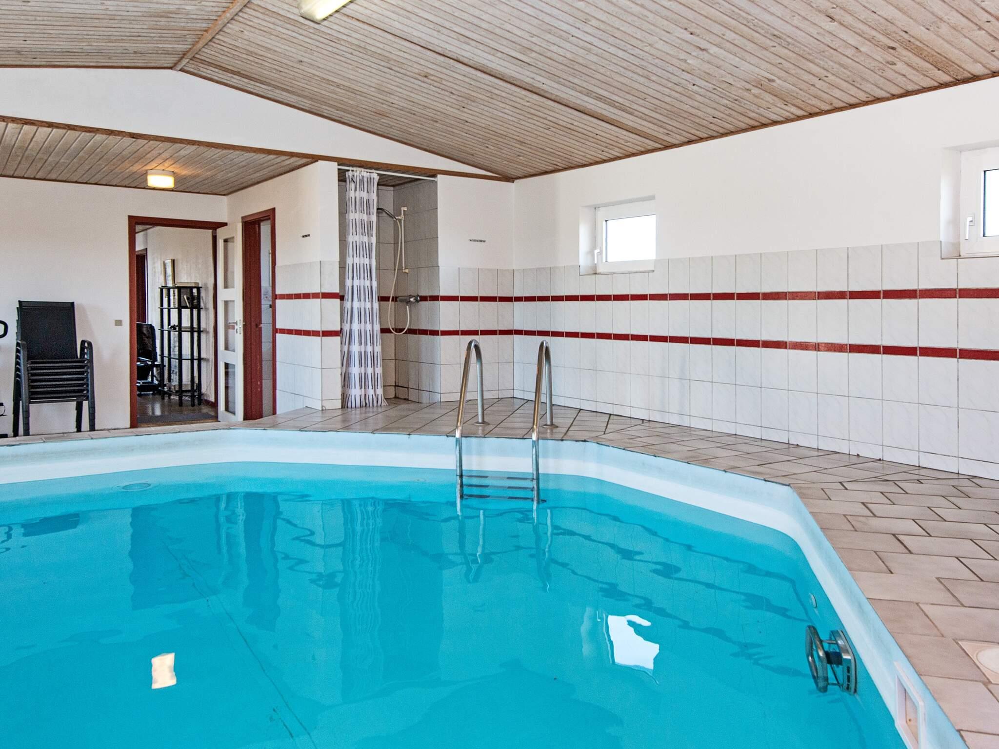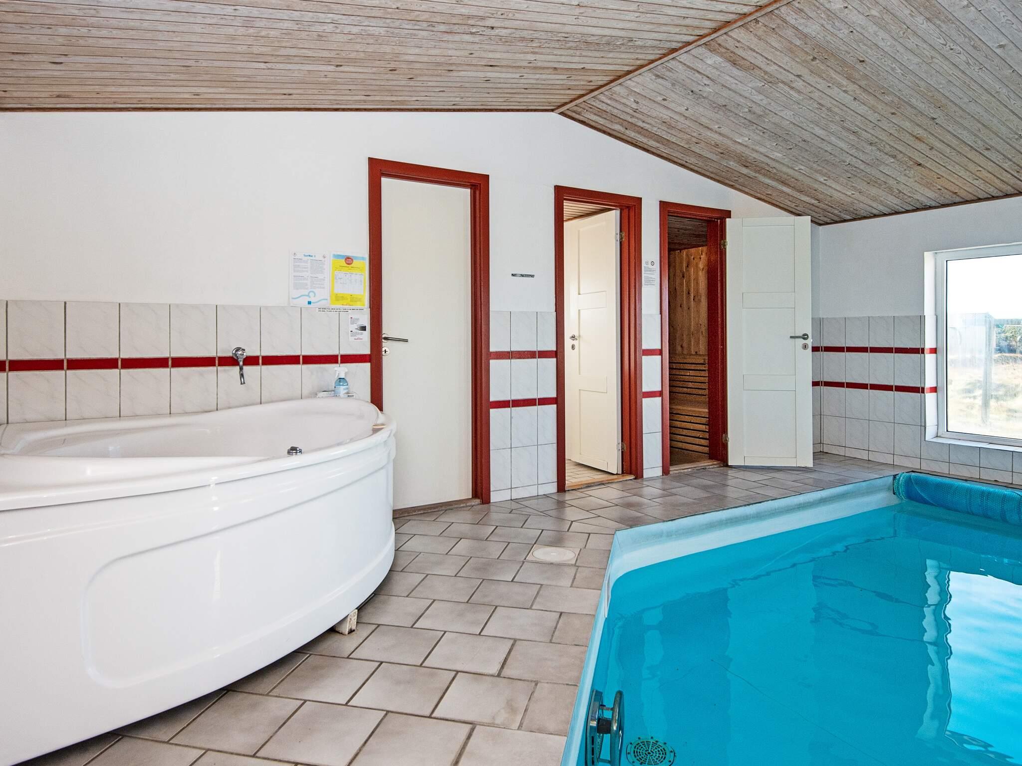 På en 2500 m² stor naturgrund ca. 400 fra Vesterhavet har I mulighed for en afslappet ferie i dette sommerhus med egen swimmingpool, spabad og sauna. Der er svømmetræner, og trænger I til at få varmen efter en lang gå- eller cykeltur i det skønne område, er en tur i saunaen lige hvad I trænger til. I pooolrummet er der også 2-personers spabad, så der er rig mulighed for en afslappet ferie, hvad enten I er rigtige vandhunde eller til en aktiv ferie. Det er også her, I finder husets bruseniche. Køjesengene har en bredde på 70 cm. Der er åbent køkken, så I har mulighed for at hygge jer med gæsterne i stuen, mens madlavningen klares. I huset forefindes desuden bordfodbold, dart og PlayStation 3 med dertilhørende spil. Området byder desuden på et hav af muligheder for aktiviteter og oplevelser bl.a. Mini Sommerpark med hesteudlejning, Put and Take fiskesø, legefaciliteter, fodbold, golf, butikscenter, restauranter, caféer, museer m.m.