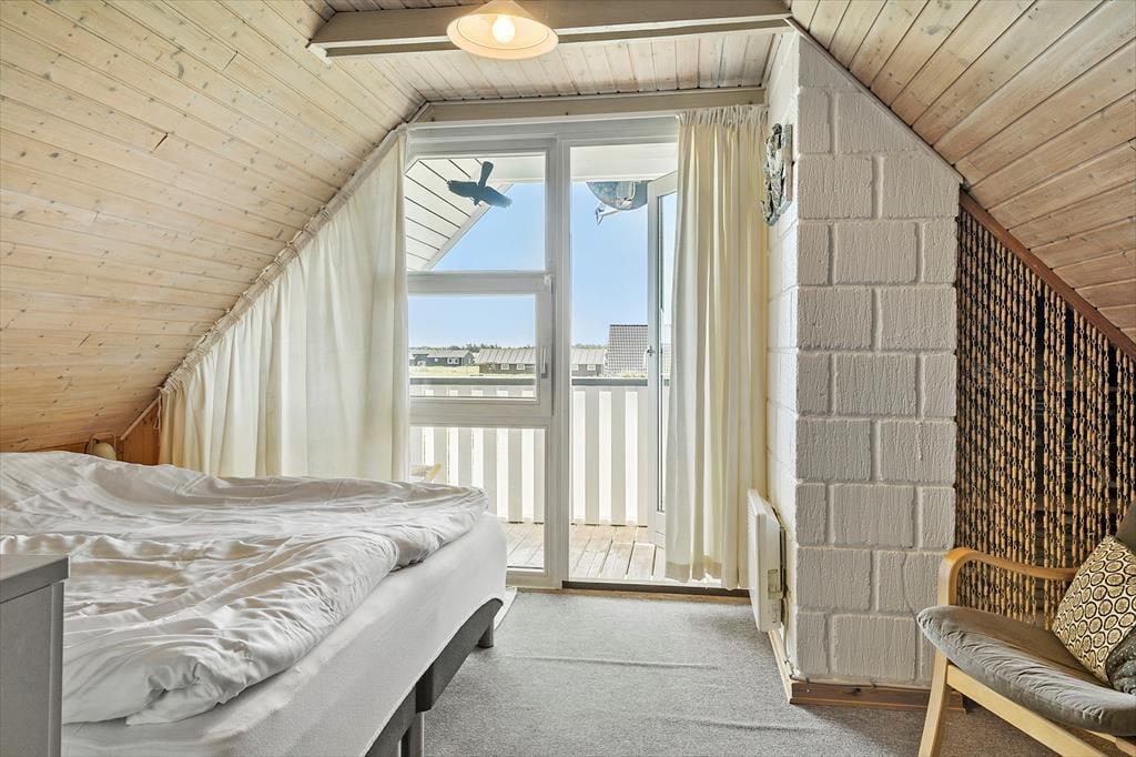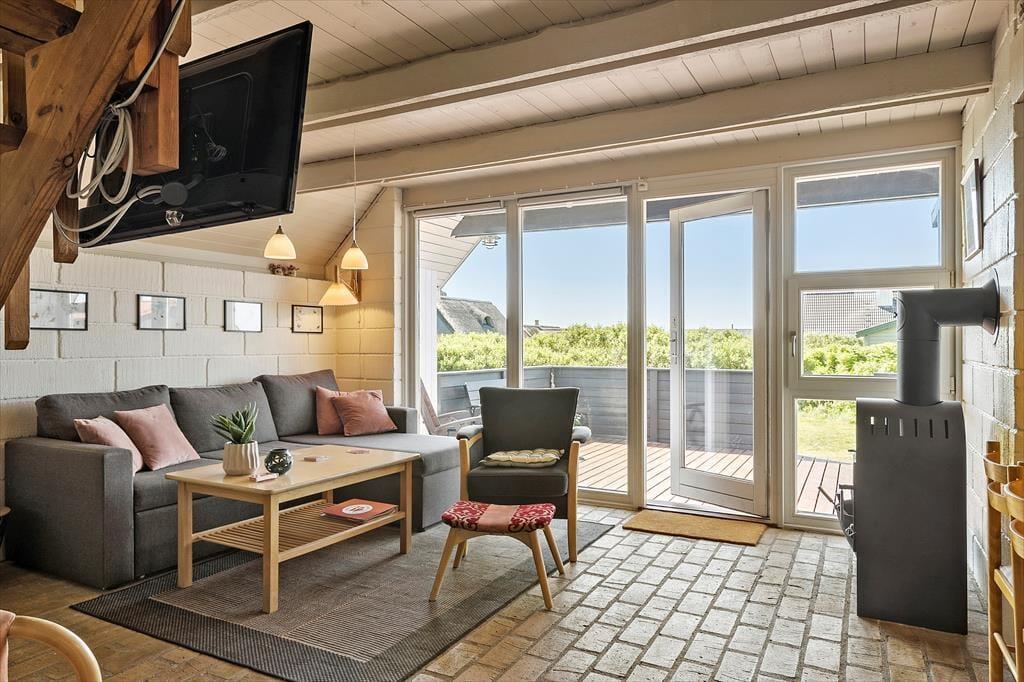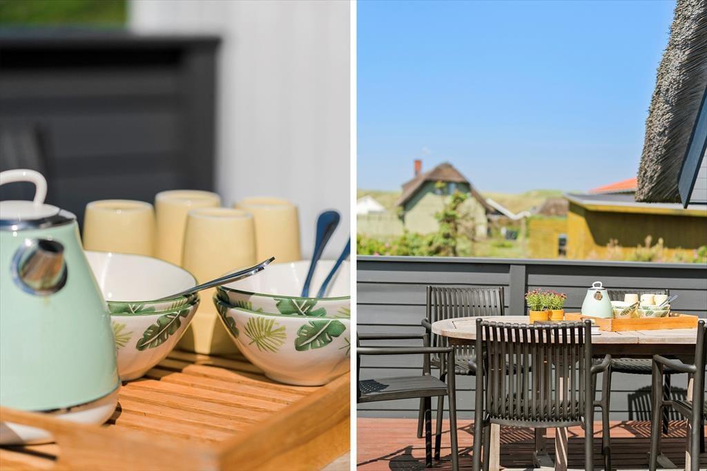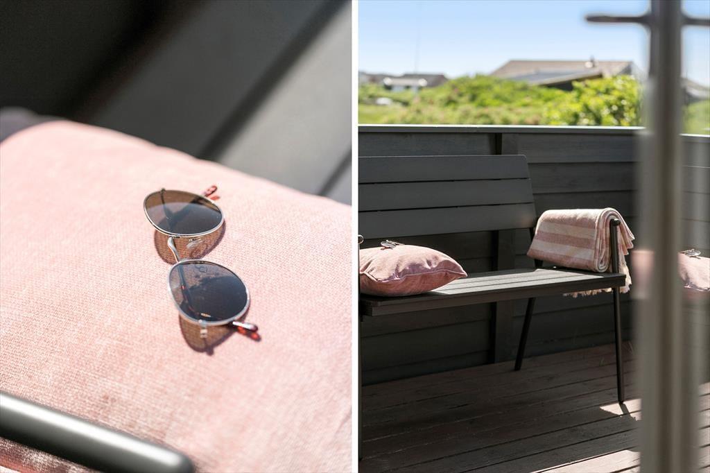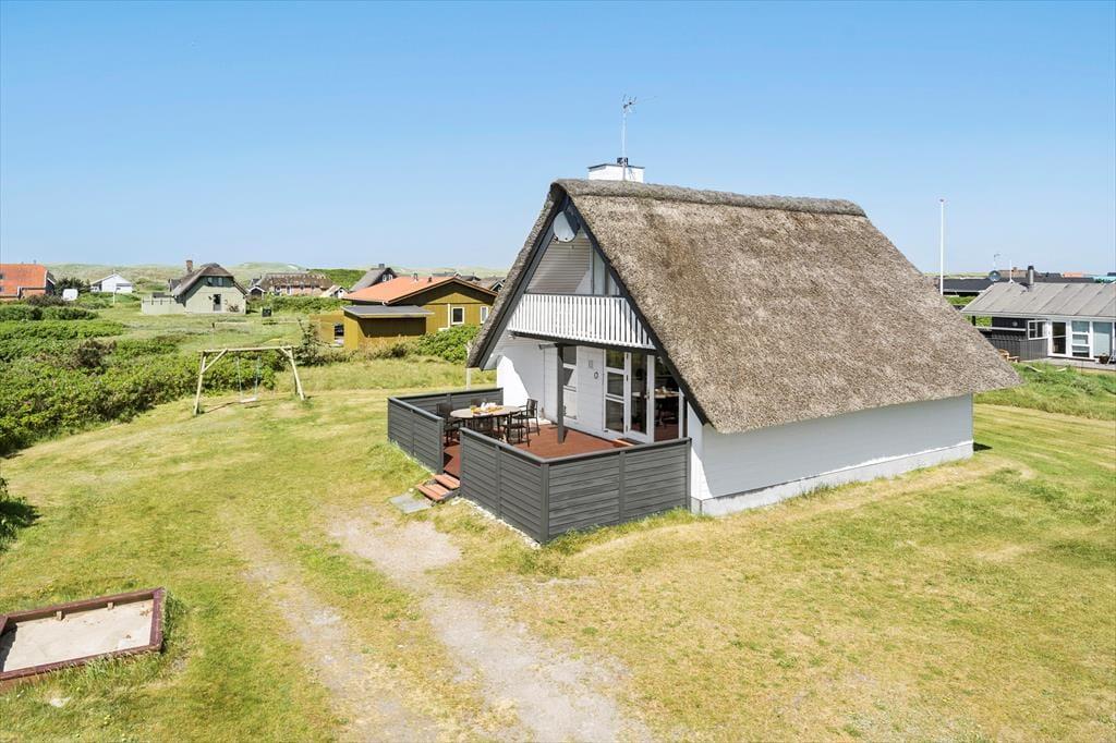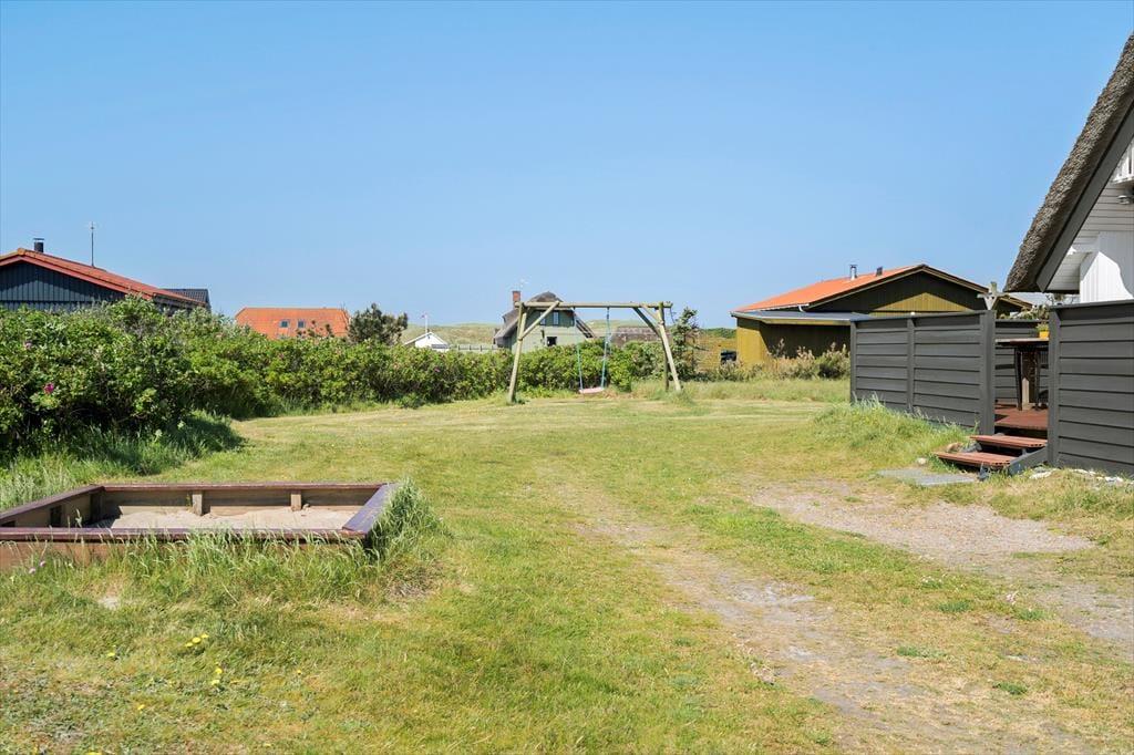 Det dejlige uderum omkring sommerhuset giver dig masser af muligheder for at nyde ferien under åben himmel. Terrassen er oplagt til alt fra morgenkaffe til grillhygge, og børnene kan slå sig løs i haven, hvor både sandkasse og gynge står klar. Her er plads til leg, grin og stille stunder – og måske endda en lur i havestolen med vinden, der suser let gennem klitterne. Terrassen har både solrige og mere skyggefulde hjørner, så du altid kan finde et godt sted at slå dig ned. Den fredelige placering gør det også trygt at lade hunden snuse rundt og børnene lege frit, mens de voksne nyder en kop kaffe og roen i baggrunden.