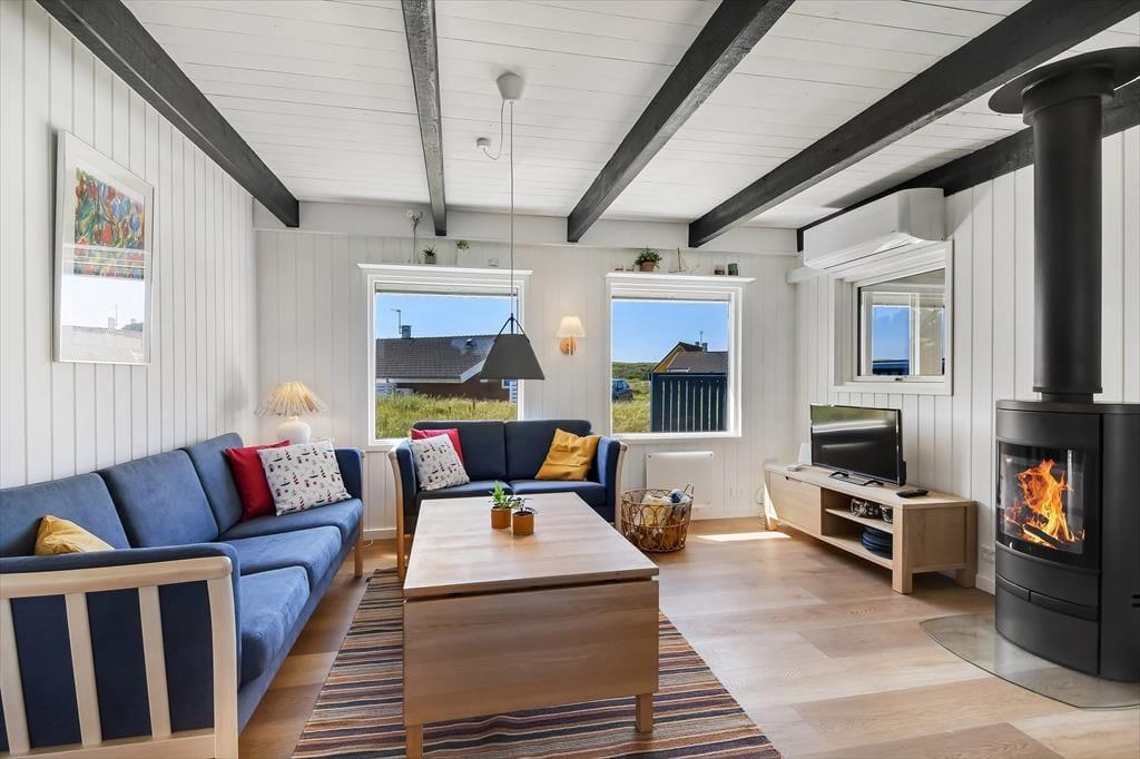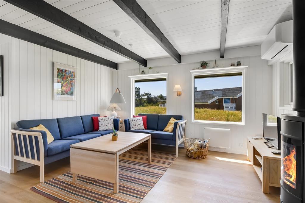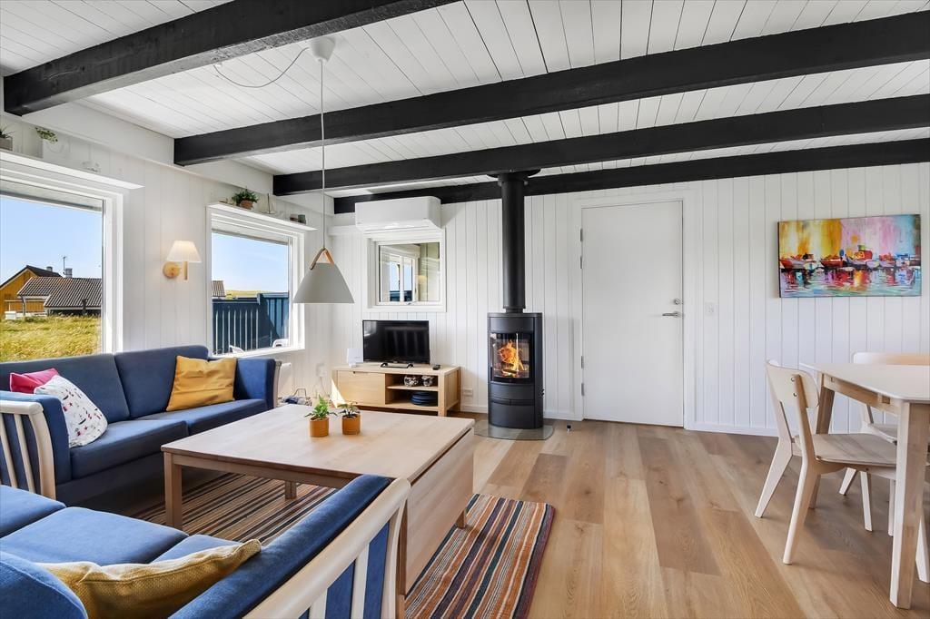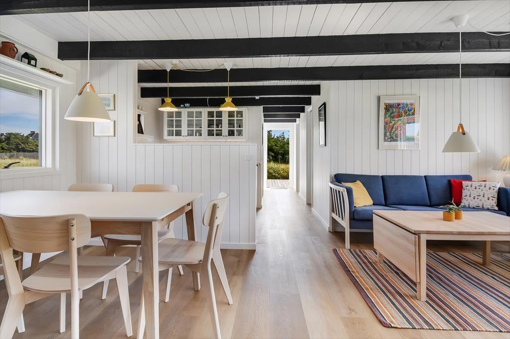 Sommerhuset byder indenfor til en indretning, der hurtigt får skuldrene til at sænke sig. Her er der skabt plads til det nære og hyggelige, hvor stuen bliver det naturlige samlingspunkt – med sofaer, der indbyder til afslapning, fælles grin og måske en god film, når dagen går på hæld. Køkkenet ligger i åben forbindelse med stuen, og det er nemt at forestille sig feriemorgener med duften af kaffe og nybagt brød, mens samtalen går rundt om spisebordet. Med tre soveværelser fordelt i huset er her plads til hele familien, og den venlige stemning i rummene gør det nemt at føle sig hjemme fra første øjeblik.