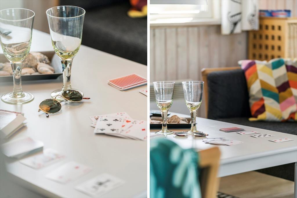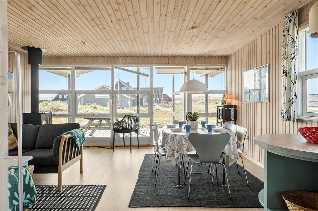 Indenfor i sommerhuset bliver du mødt af en varm og imødekommende stemning, som straks sætter gang i feriefølelsen. Huset er lyst og indrettet med sans for hygge, hvor træets naturlige materialer – både på vægge og lofter – giver en afslappet og autentisk atmosfære. Det åbne køkken- og opholdsområde er perfekt til fælles ferietid, hvor familien kan samles omkring madlavning, brætspil eller en god film på en regnvejrsdag. De store vinduer lukker lyset ind og skaber en fin forbindelse til naturen udenfor, så du hele tiden har fornemmelsen af at være tæt på det, du kom for – nemlig ro og natur.