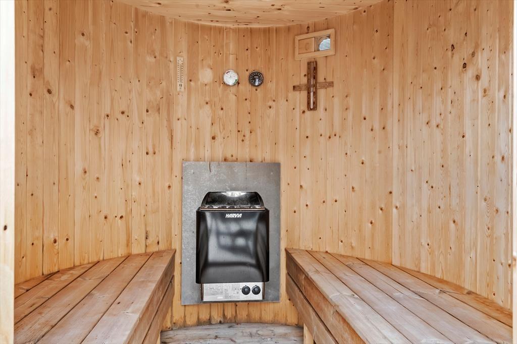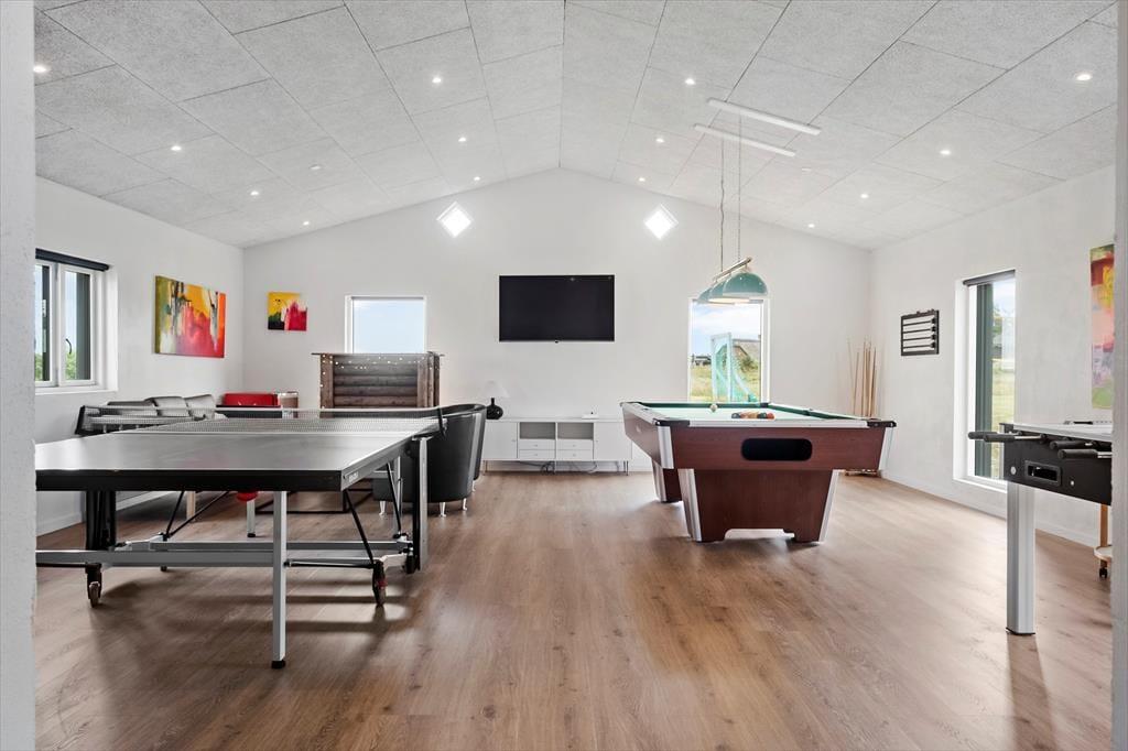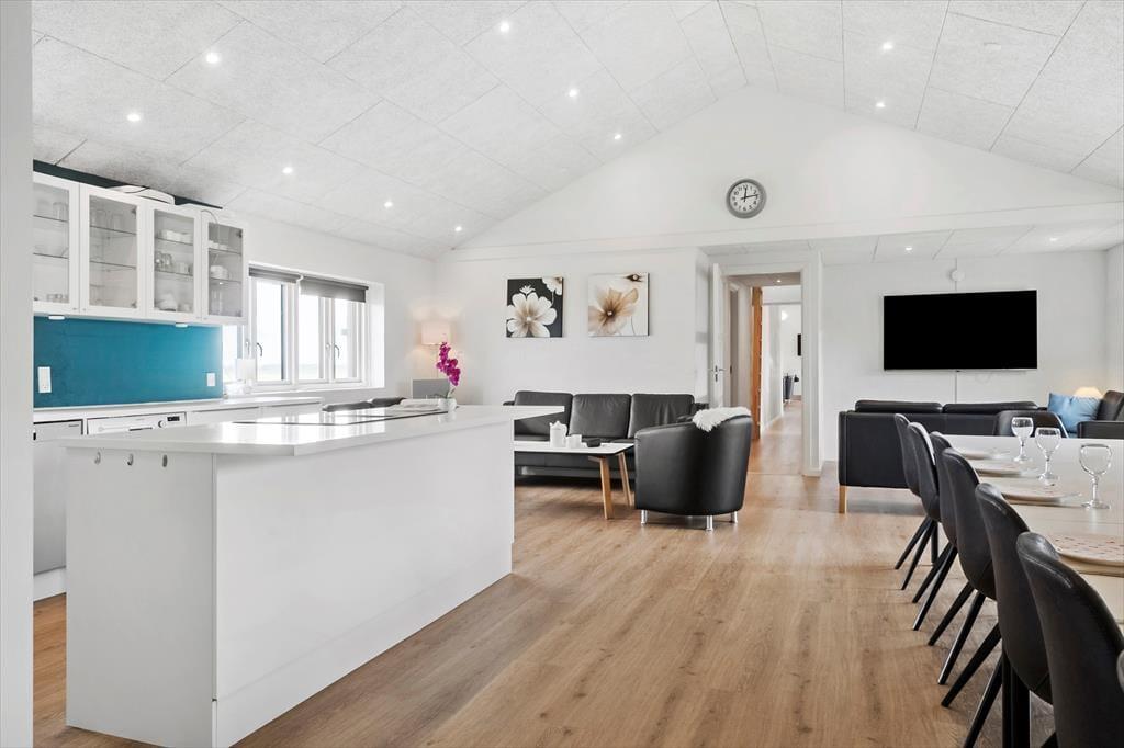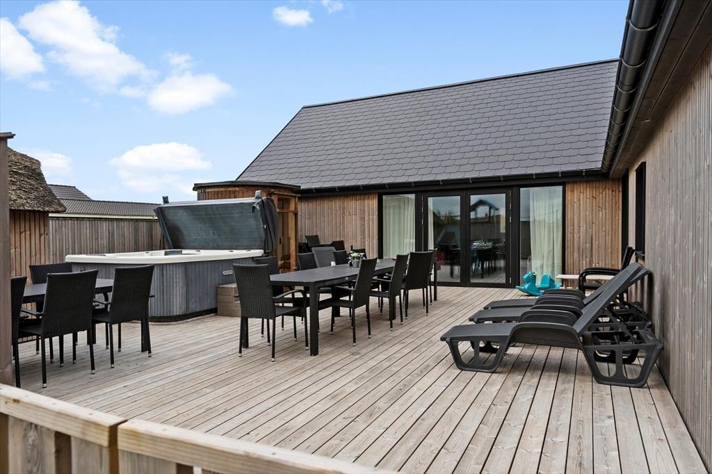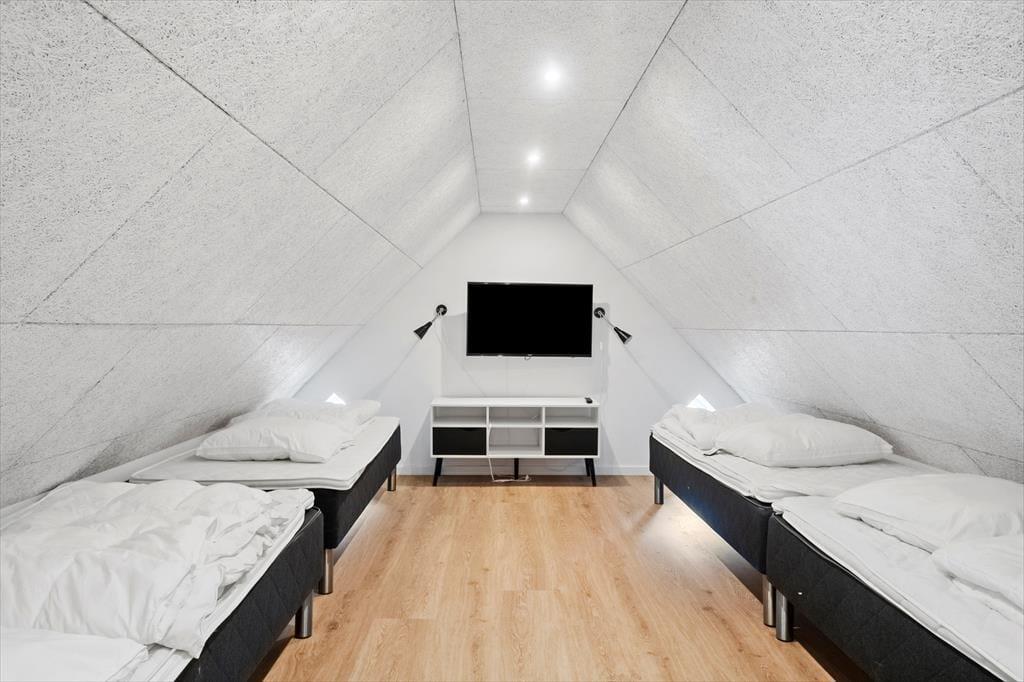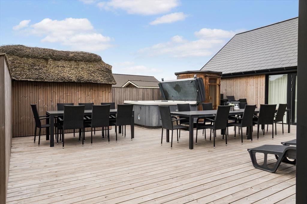 Allerede når du træder indenfor i sommerhuset, fornemmer du den moderne og indbydende stemning, som gennemsyrer hele huset. Her er plads til, at mange gæster kan være sammen og hver for sig, og hjerterummet bliver hurtigt det åbne opholdsrum med køkken og stue, hvor madlavning, spil og snak går hånd i hånd. Men det stopper ikke her – for her venter også et stort aktivitetsrum, der inviterer til timevis af sjov. Dyst mod hinanden i bordtennis, pool, bordfodbold og dart, eller slå jer bare løs med grin og højt humør. Når I trænger til at slappe af, er der heldigvis også tænkt på det: den indendørs pool på 18 m2 med rutsjebane og det lækre spabad er perfekte til stille stunder med varmt vand og afslappet velvære, uanset årstid og vejr.