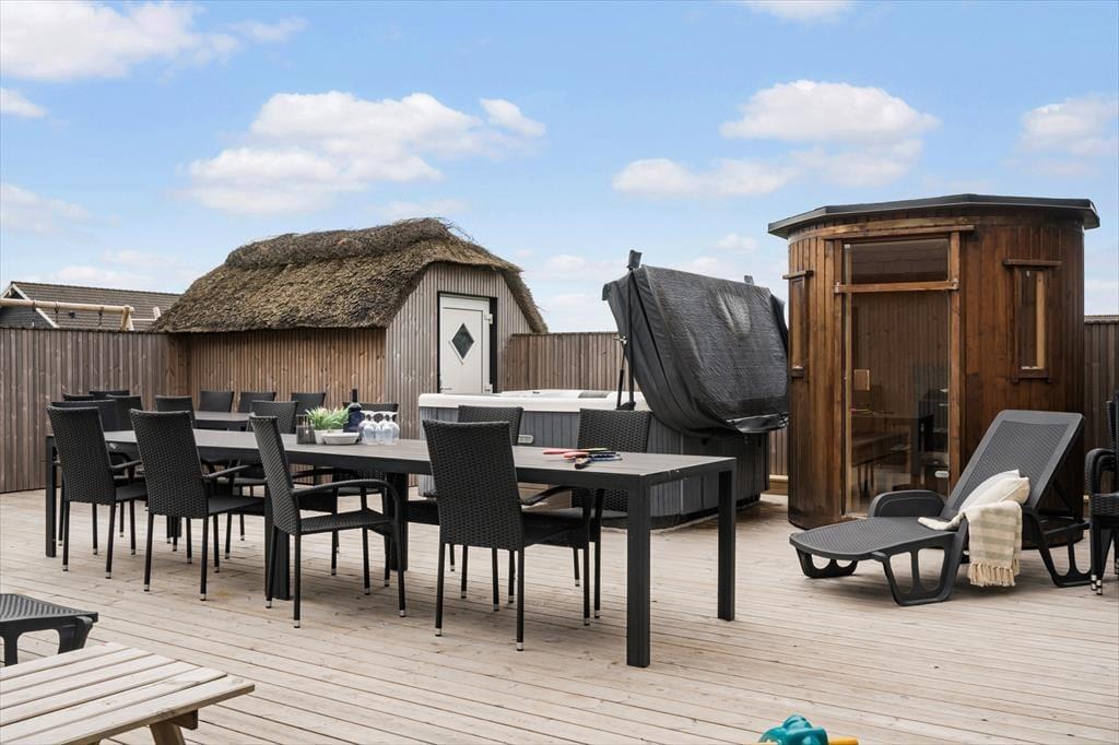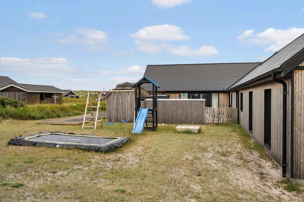 Den store terrasse åbner op for et skønt udeliv, hvor alle kan finde deres egen favoritplads – om det er med en kop kaffe i solen, en god bog i loungestolen eller lidt sved på panden i tøndesaunaen. Og der er masser af plads til, at børnene kan slå sig løs, mens de voksne nyder udsigten eller tilbereder maden på grillen. Haven er som skabt til leg med trampolin, legetårn, sandkasse og et net til volleyball, så her er rig mulighed for at få rørt sig og more sig sammen hele dagen. Og når solen begynder at gå ned, er det oplagt at samle hele selskabet omkring et godt måltid og lade roen falde på, mens dagen afrundes med latter og gode snakke under åben himmel.