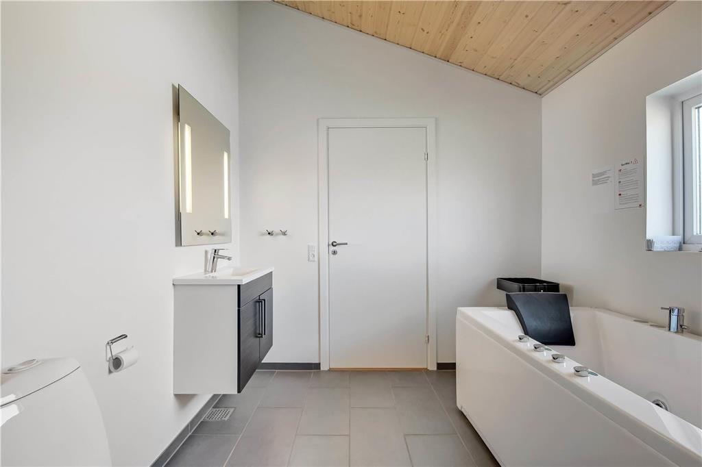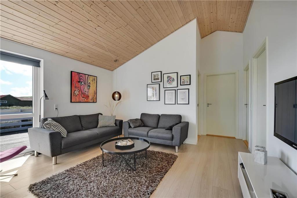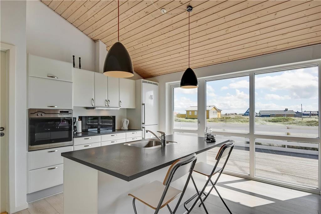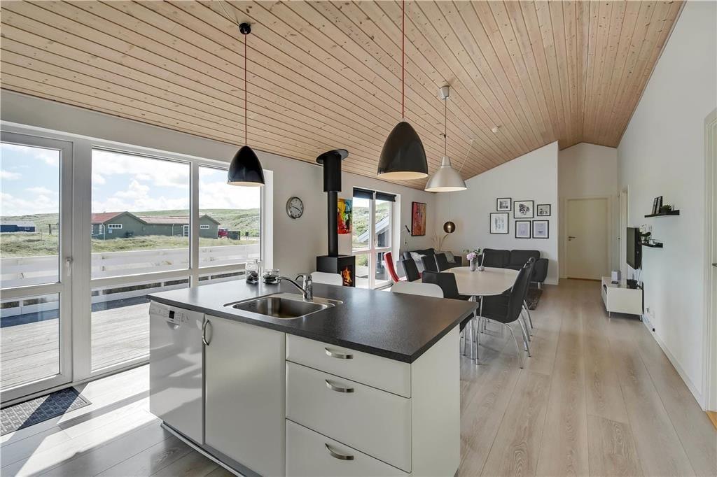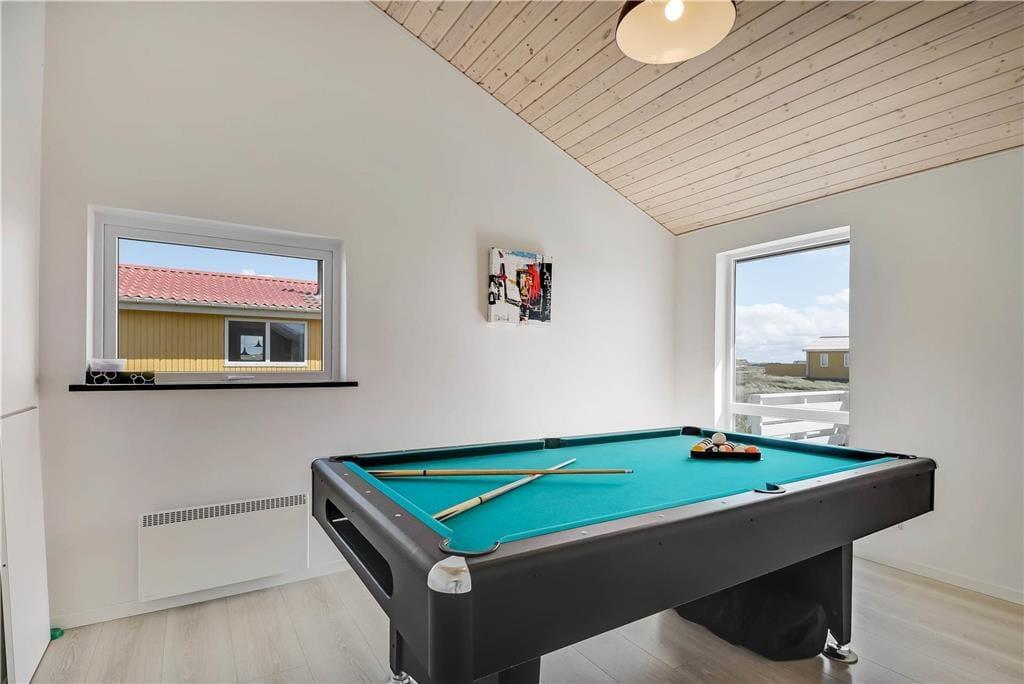 Indenfor i det indbydende sommerhus mødes du af en afslappet atmosfære og lyse, venlige omgivelser, der hurtigt får skuldrene til at sænke sig. Køkken og stue ligger i åben forbindelse, så her er rig mulighed for at samles omkring måltider, brætspil og samtaler – og mens du laver mad, kan du stadig følge med i det, der sker i stuen. Når det bliver tid til leg og konkurrence, kan I gå ind i husets aktivitetsrum, hvor et poolbord står klar til at danne ramme om familiens ferie-turneringer. Efter en dag fyldt med frisk luft og strandliv er det skønt at slutte af i husets wellnessområde – enten i den indendørs spa eller i den infrarøde sauna, der giver varme og velvære på både kølige og solrige dage.
