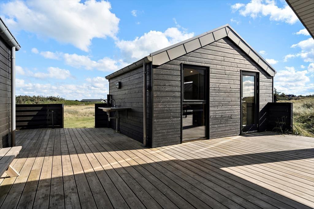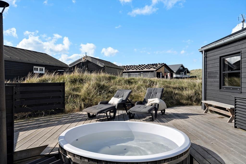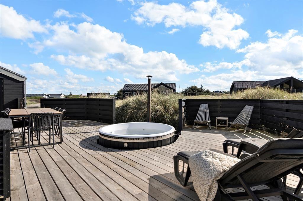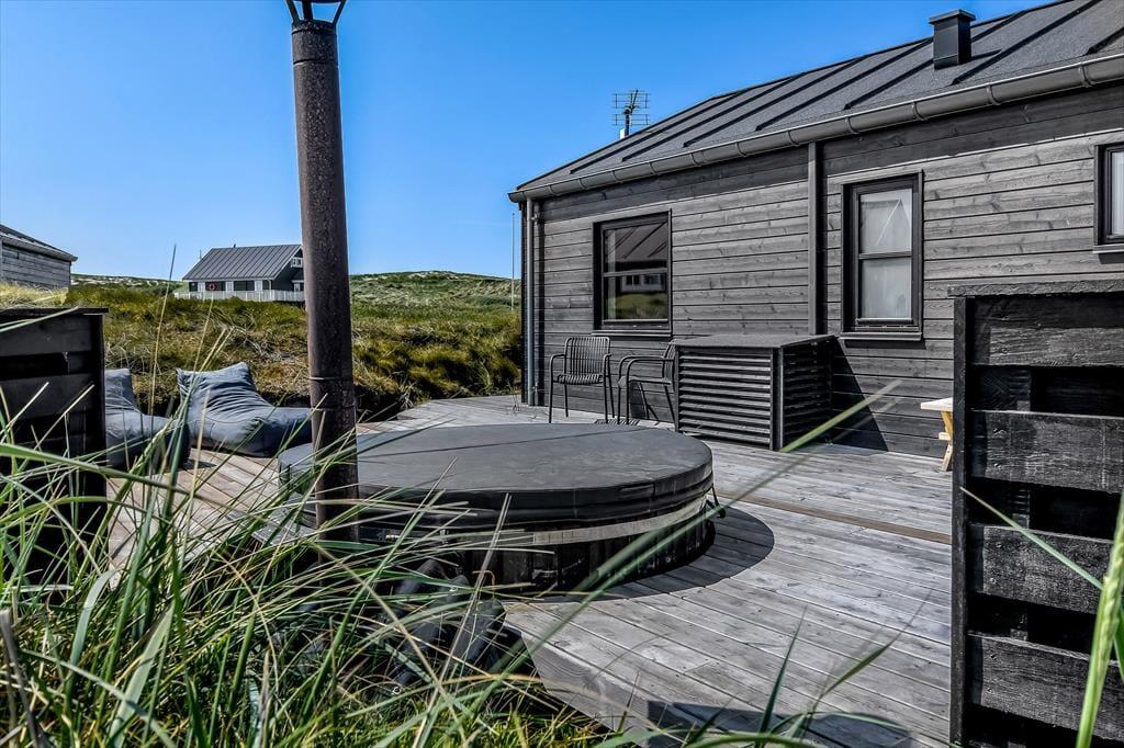 Det bliver ikke svært at finde feriestemningen på den store og delvist overdækkede terrasse, hvor I kan slappe af i læ for vinden eller nyde solen i loungemøblerne. I hjørnet af terrassen står det runde vildmarksbad klar til at forkæle jer – særligt skønt, når mørket falder på og stjernerne lyser nattehimlen op. Der er god plads omkring huset, og haven er som skabt til leg og ophold under åben himmel – her kan børnene løbe frit, og der er altid mulighed for en frisk brise fra havet. Den korte afstand til stranden gør det nemt at tage spontane ture i løbet af dagen – måske starter I dagen med en dukkert og slutter med en gåtur langs vandet i solnedgangens skær.